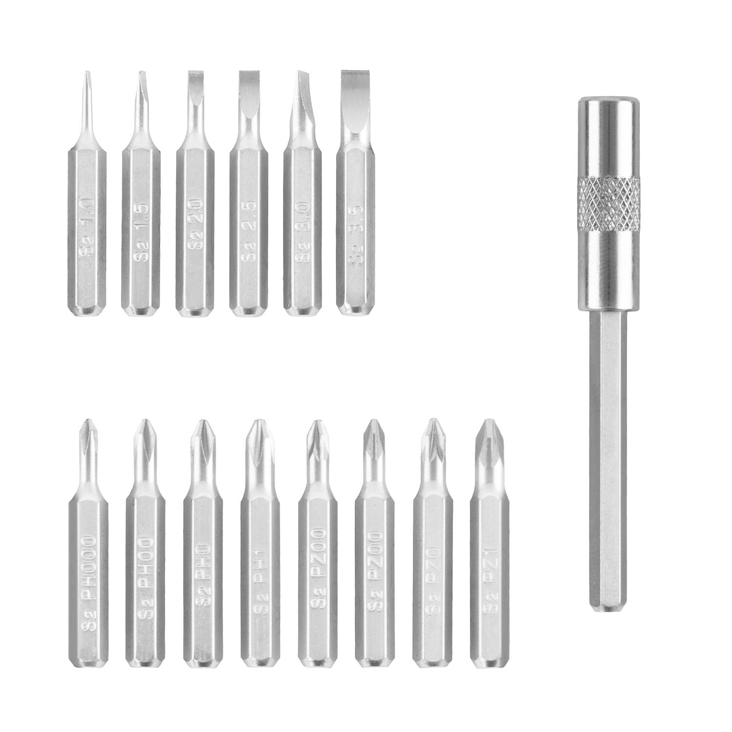 28dílná sada bitů Procraft PRSS-28, S2 26ks 28mm bitů: Phillips: PH000, PH00, PH0, PH1 Ploché: SL1, SL1.5, SL2, SL2.5, SL3, SL3.5 Torx:T4, T5, T6, T7, T8, T9, T10, T15 Imbus: 1,3mm, 1.5mm, 2mm, 2.5mm Pozi: 2xPZ00, PZ0, PZ1 Šroubovák Magnetický držák bitů