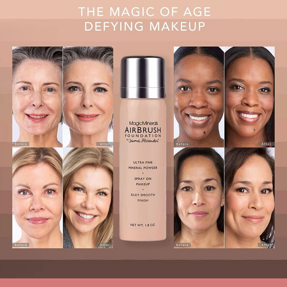 In addition, the AirBrush Foundation Spray is enriched with Jerome Alexander Skincare Makeup™ and enhances skin with long-lasting anti-aging benefits thanks to a patented blend of active skincare ingredients, including: