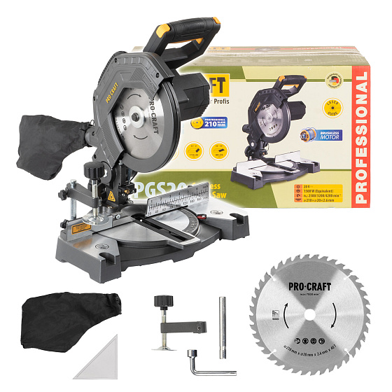 AKU pokosová pila Procraft PGS20BB s bezuhlíkovým motorem a laserovým průvodcem pro přesné řezy. Průměr kotouče 210 mm, otáčky až 4200/min, nastavitelné úhly řezu. Včetně kotouče, vaku na prach a klíčů. Hmotnost 5 kg.