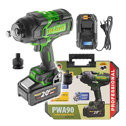 Aku rázový utahovák Procraft PWA90 s bezuhlíkovým motorem, utahovacím momentem až 2100 Nm a regulací otáček (0–750 / 0–1000 / 0–1800 ot./min). Součástí balení je kufr, baterie 20 V 8 Ah, nabíječka a redukce z vnitřního 3/4" čtyřhranu na vnější 1/2".