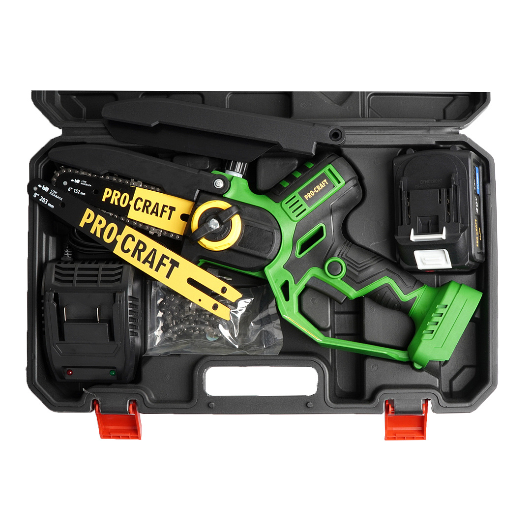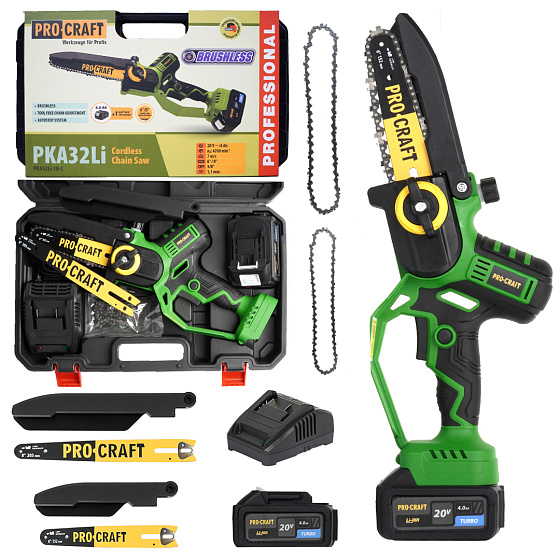 Aku ruční pilka Procraft PKA32Li s bezuhlíkovým motorem, automatickým mazáním a snadným napínáním řetězu. Rychlost řetězu 7 m/s, délky lišt 152/203 mm. Lehká (1,4 kg), ideální pro zahradní práce. Součástí je baterie 20v 4 Ah, nabíječka a příslušenství.