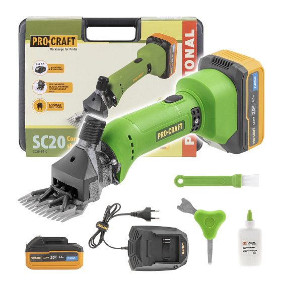 Aku strojek na stříhání ovcí Procraft SC20 s bezuhlíkovým motorem 180 W a šířkou střihu 76 mm zajistí rychlé a pohodlné stříhání. Nízká hmotnost. Prodává se v plastovém kufříku včetně: s baterii 20V/4Ah, nabíječky.