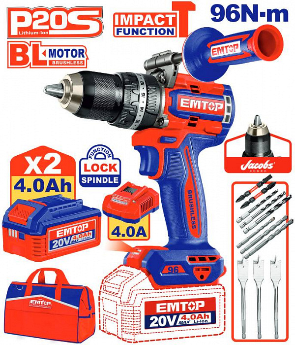 Aku vrtací šroubovák s příklepem 20V 96Nm 2x4.0Ah