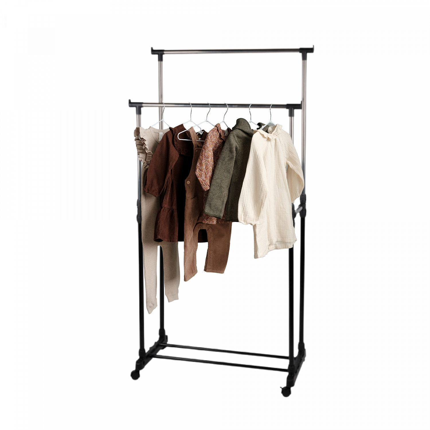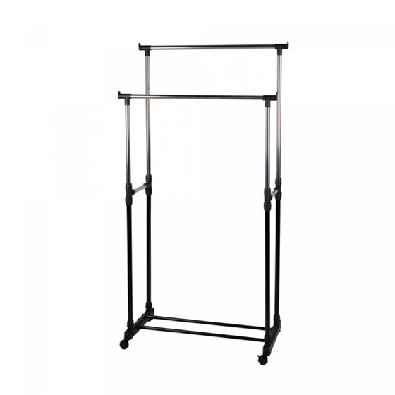 - A double hanging rail at different heights provides additional storage for displaying various types of garments. It easily holds heavy winter jackets, work clothes, and coats.