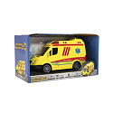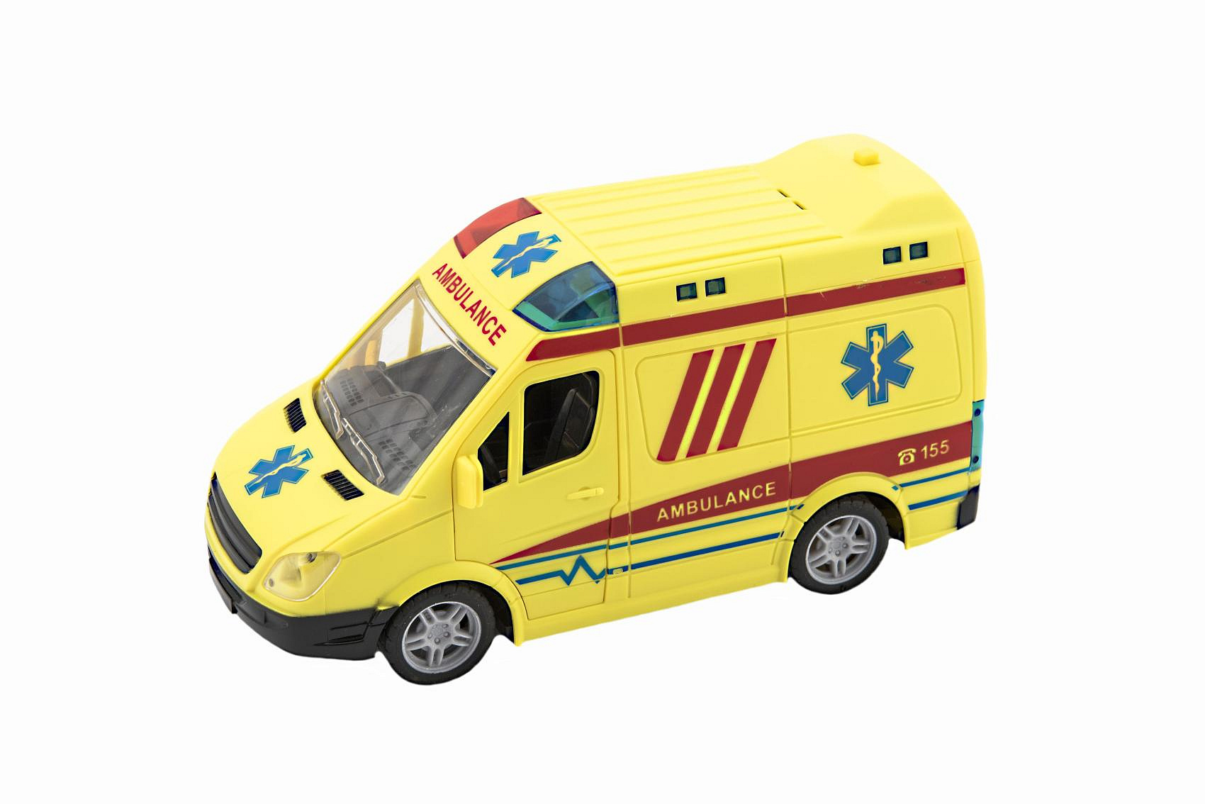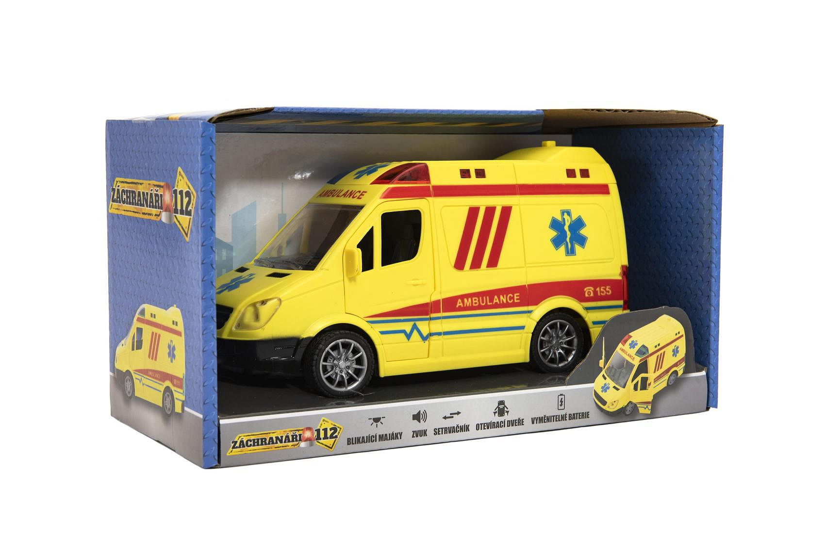 Auto ambulance plast 20cm na setrvačník na baterie se zvukem se světlem v krabici 26x15x12cm