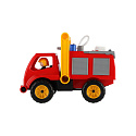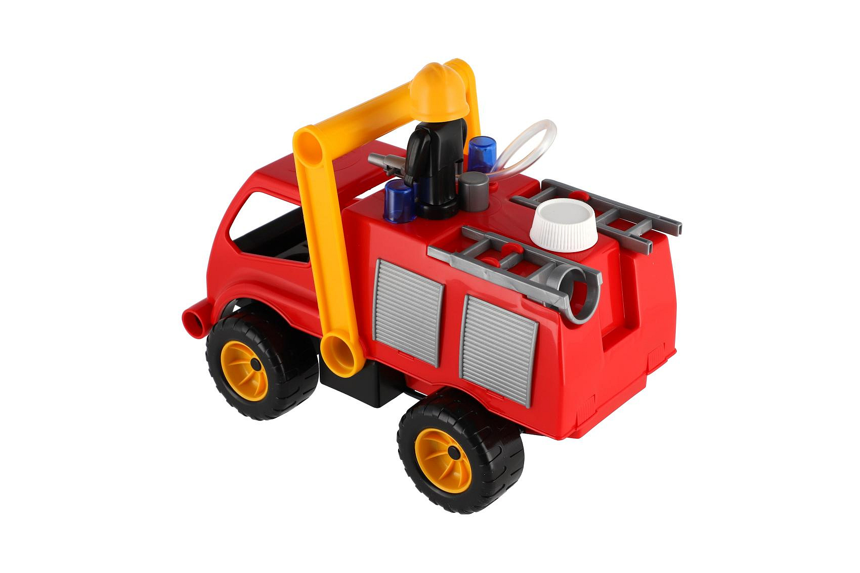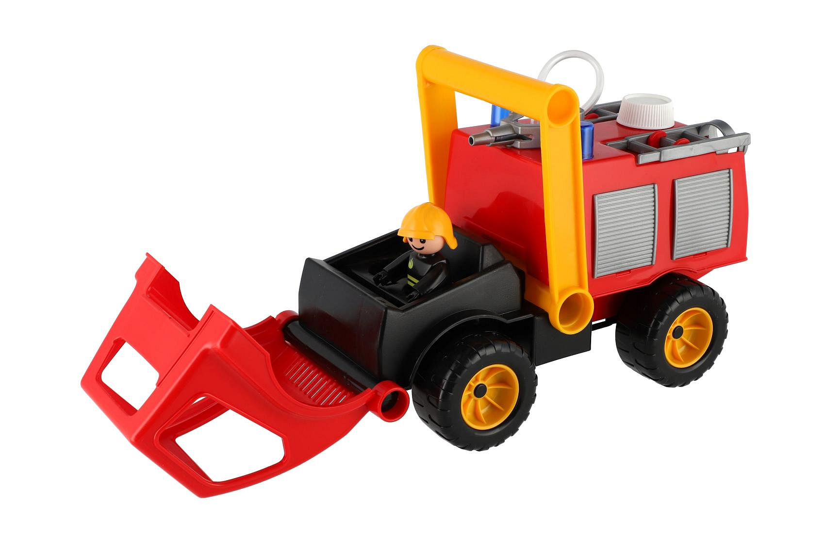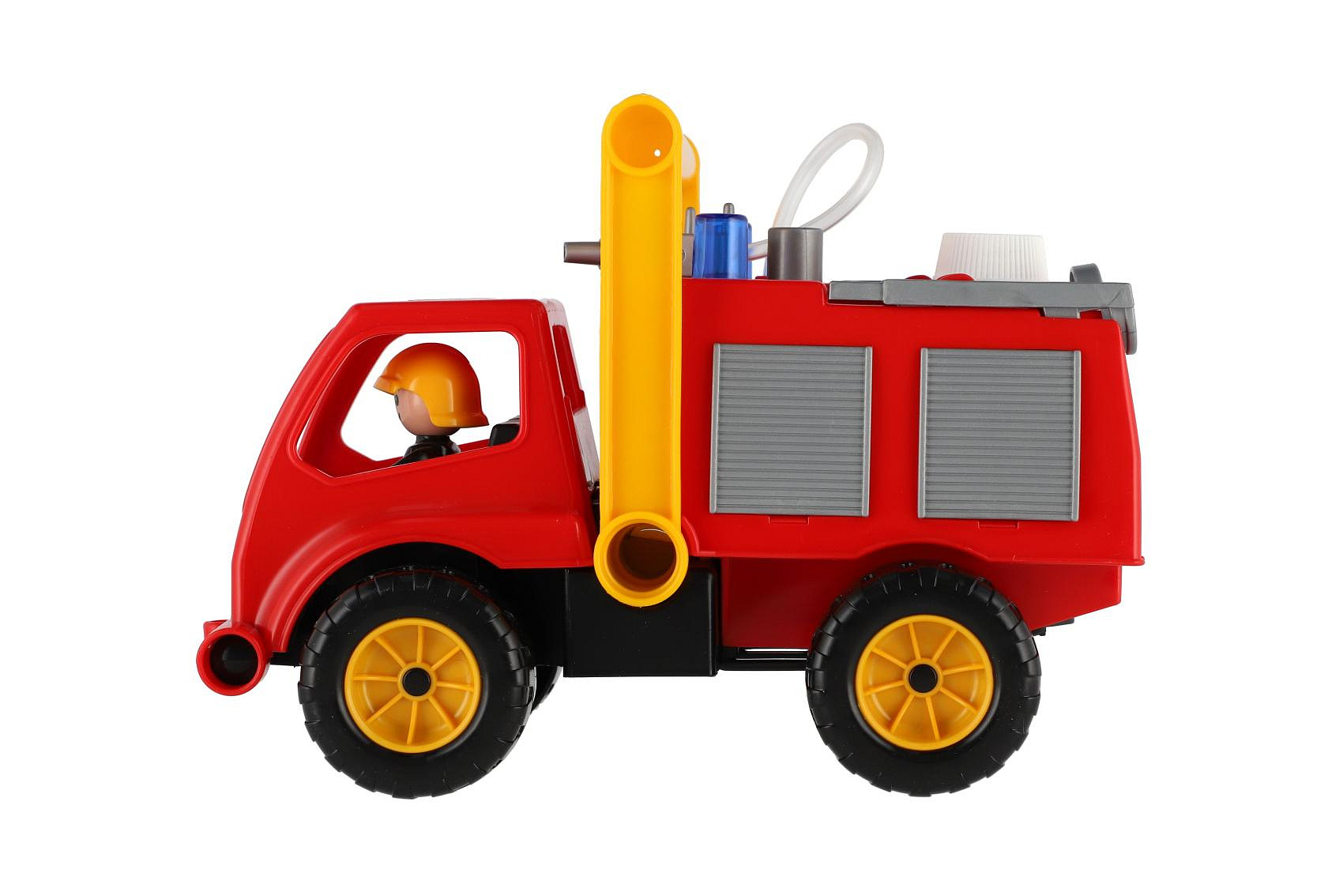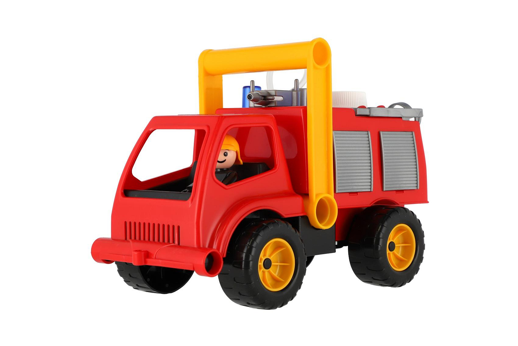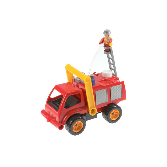 Aktivní hasiči s aktivní figurkou z kvalitního plastu, plně mechanicky funkční, s pevnou stavbou. Auto má nádržku na vodu a mechanickou pumpu. Rozměr 26 cm. Vhodné od 2 let.