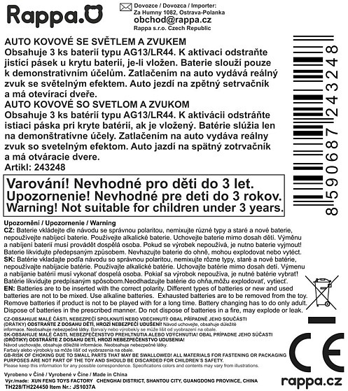 Kovové autíčko s otevíracími dveřmi, při zatlačením na auto, vydává různé zvuky a svítí. Auto jezdí na zpětný setrvačník. Obsahuje 3 ks baterií typu AG13/LR44.