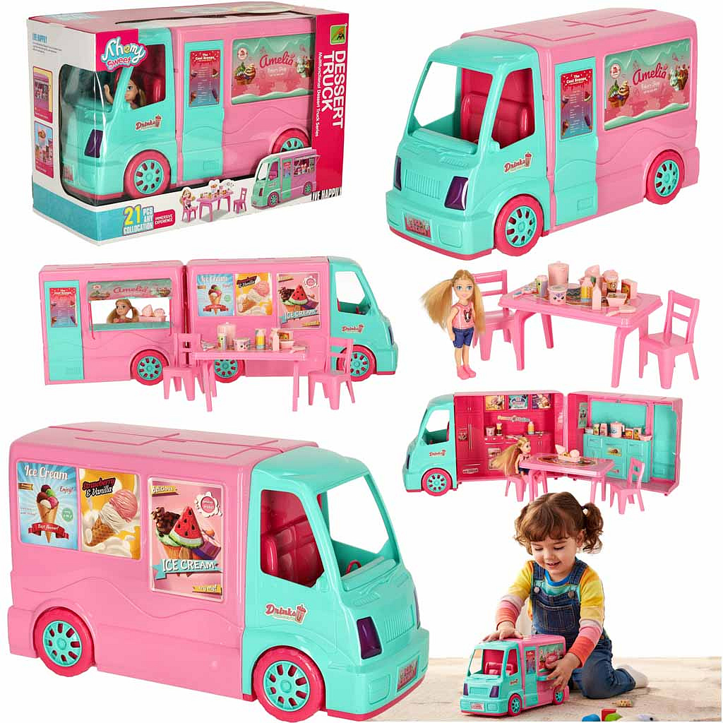 Sada spojuje dvě funkce – vzrušující kulinářské dobrodružství, kde panenka podává lahodnou zmrzlinu z food trucku, a relaxační cestu karavanem, který se stává útulným místem k odpočinku. Dítě se může vžít do role kreativního prodejce nebo manažera mobilní zmrzlinárny, a po skončení dne otevřít vozidlo a proměnit ho v pohodlný karavan, ideální pro chvíli odpočinku.