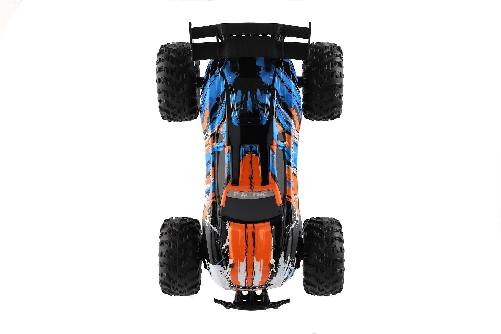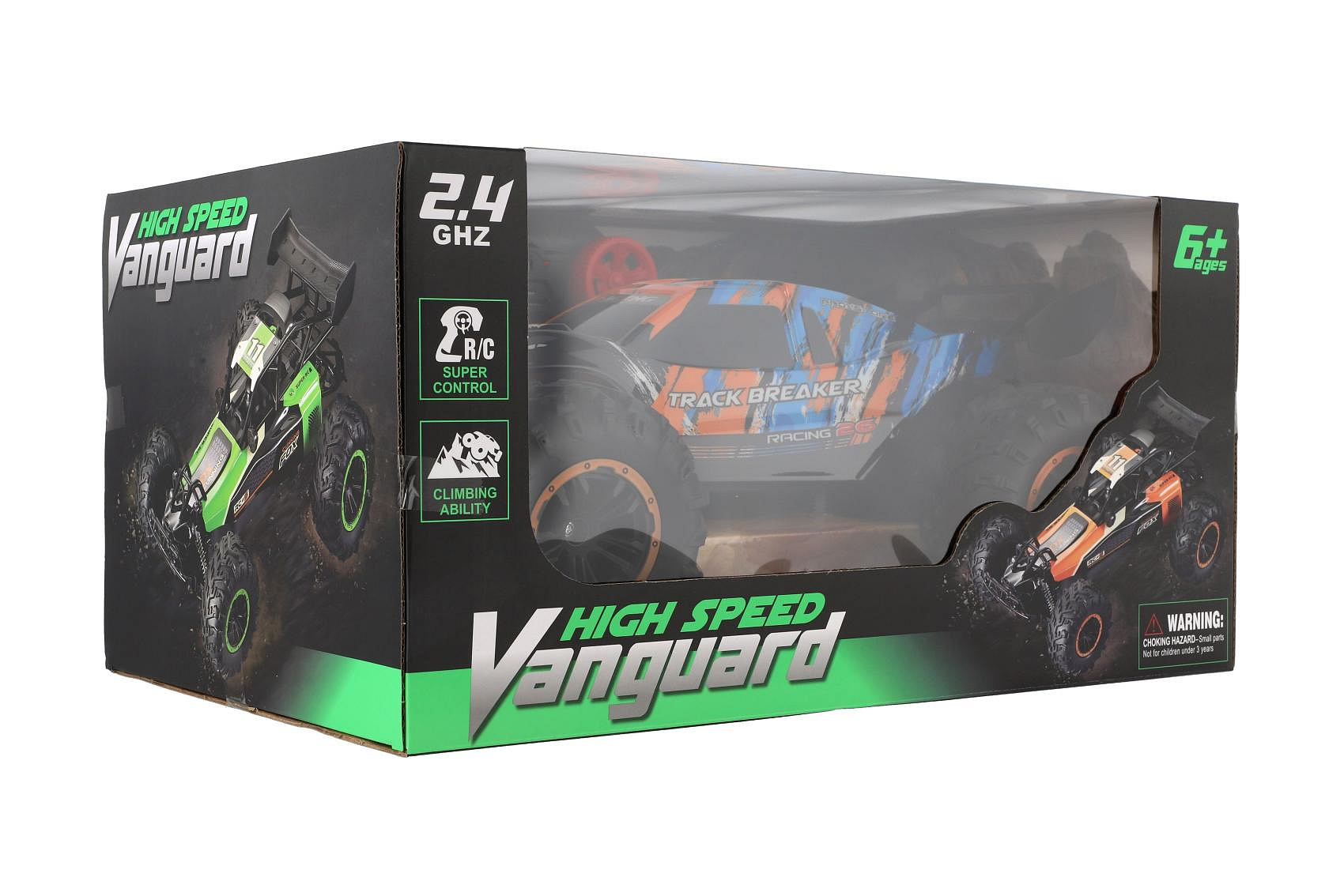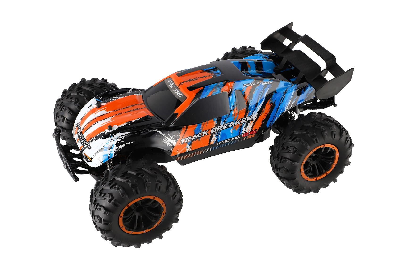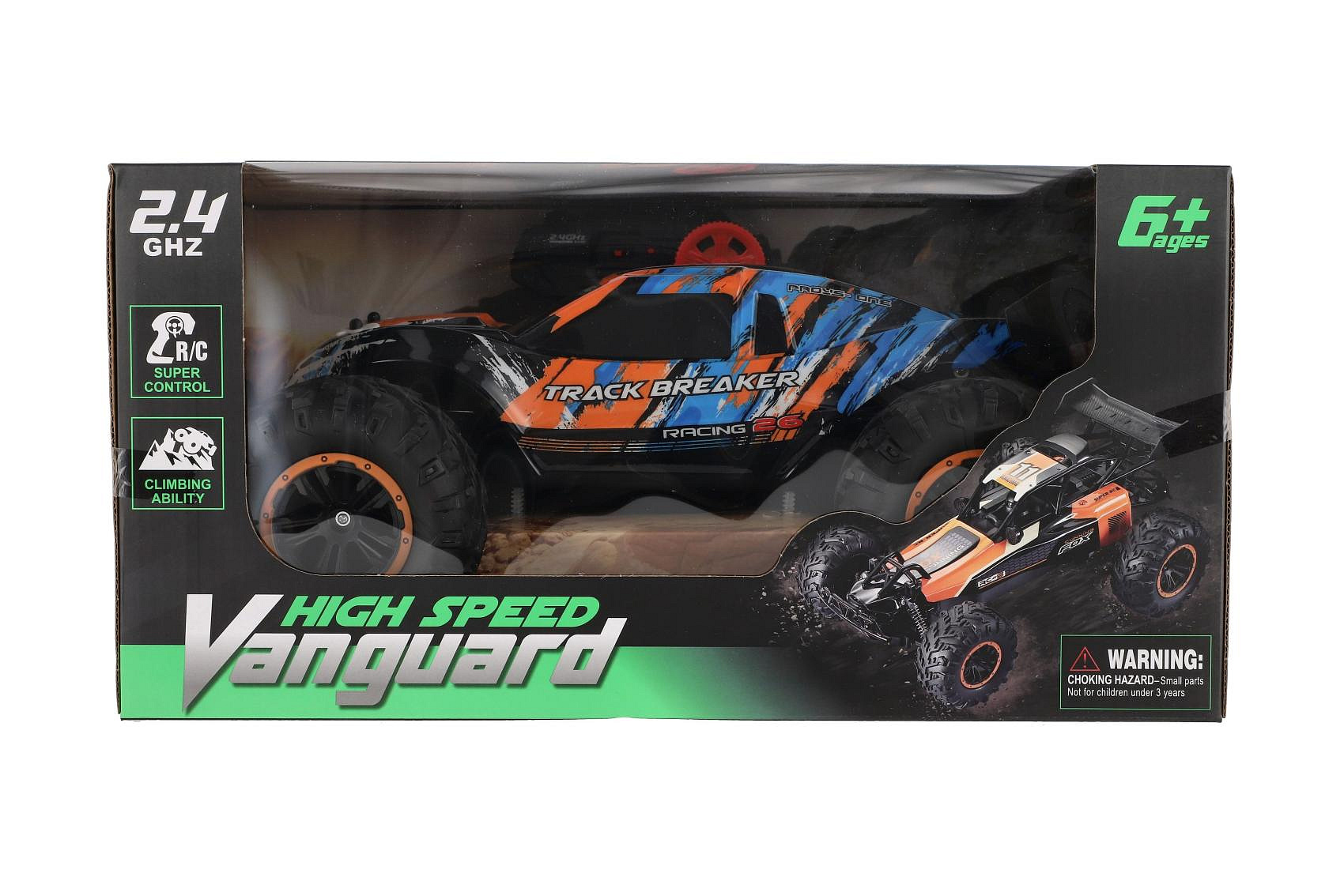 Auto RC Buggy rychlostní 2,4GHz plast 40cm dobíjecí pack+baterie oranžové-modré v krabici 42x21x28cm
