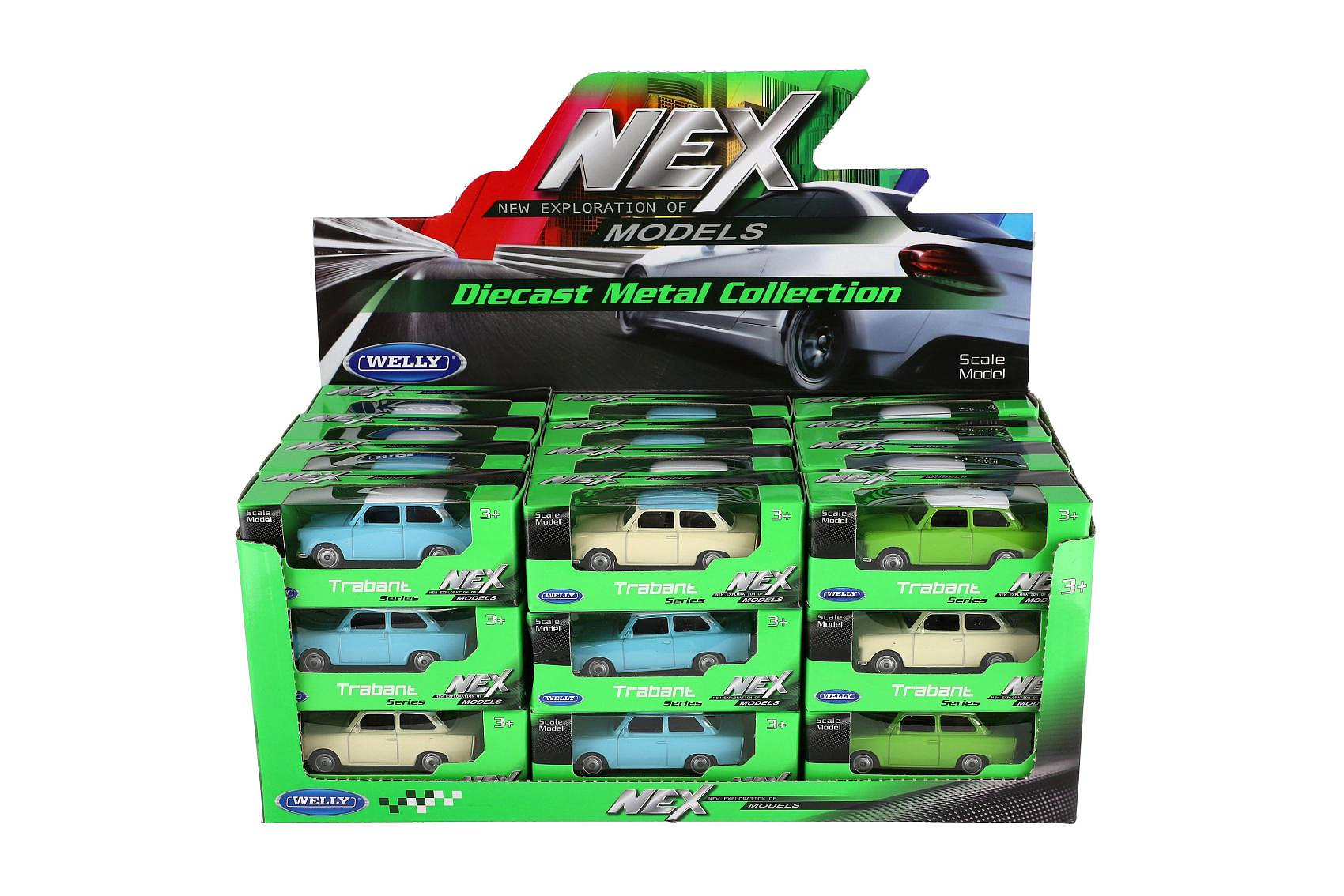 Auto Welly Trabant 1:60 kov 7cm mix barev volný chod v krabičce 36ks v boxu