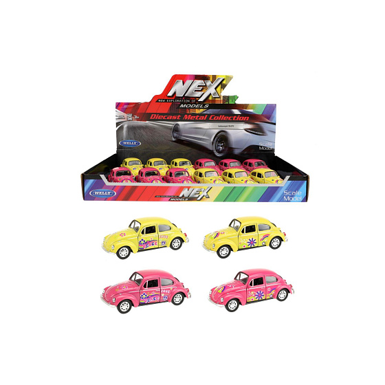 Auto Welly Volkswagen Beetle kov/plast 12cm 4 barvy na zpětné natažení 12ks v boxu