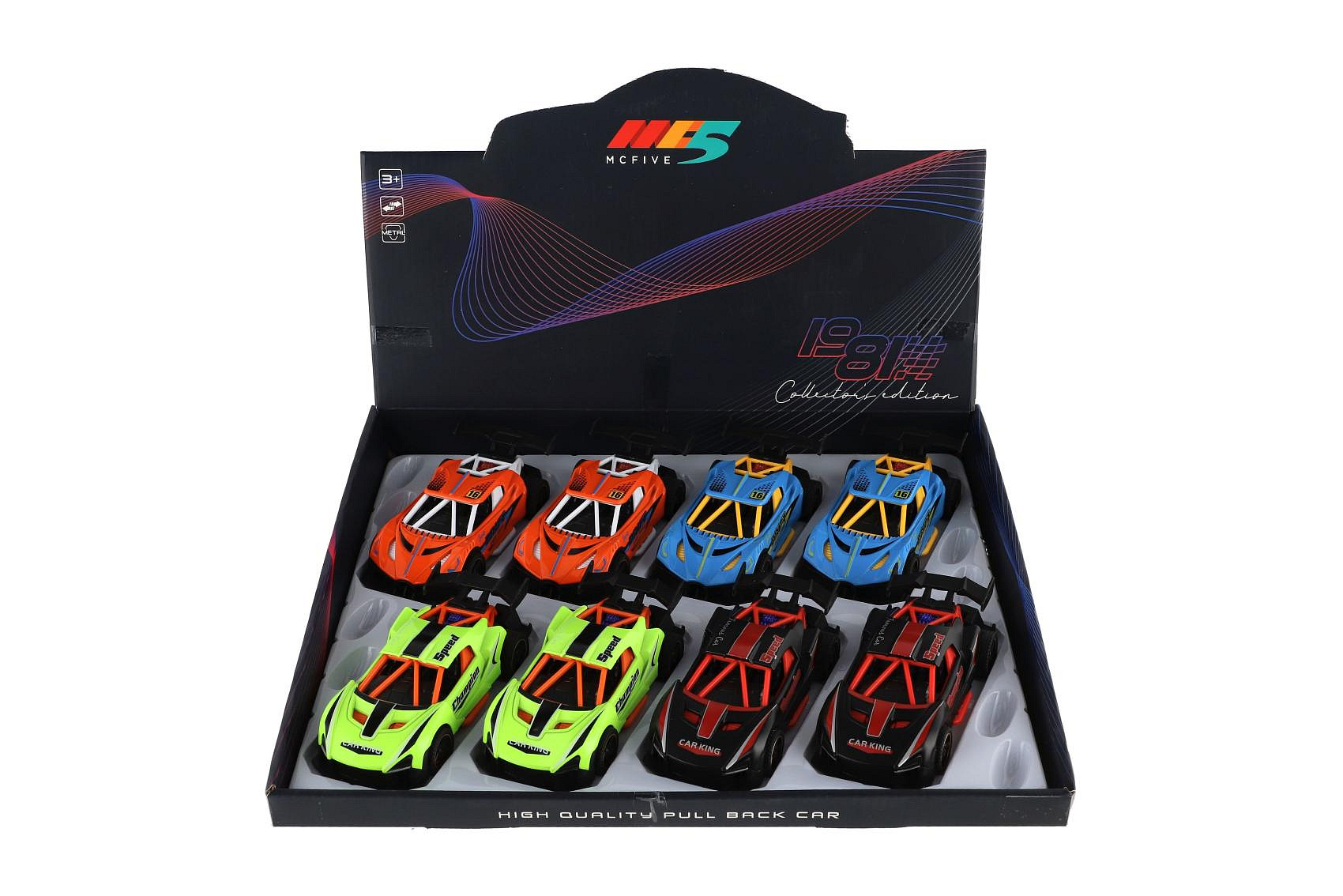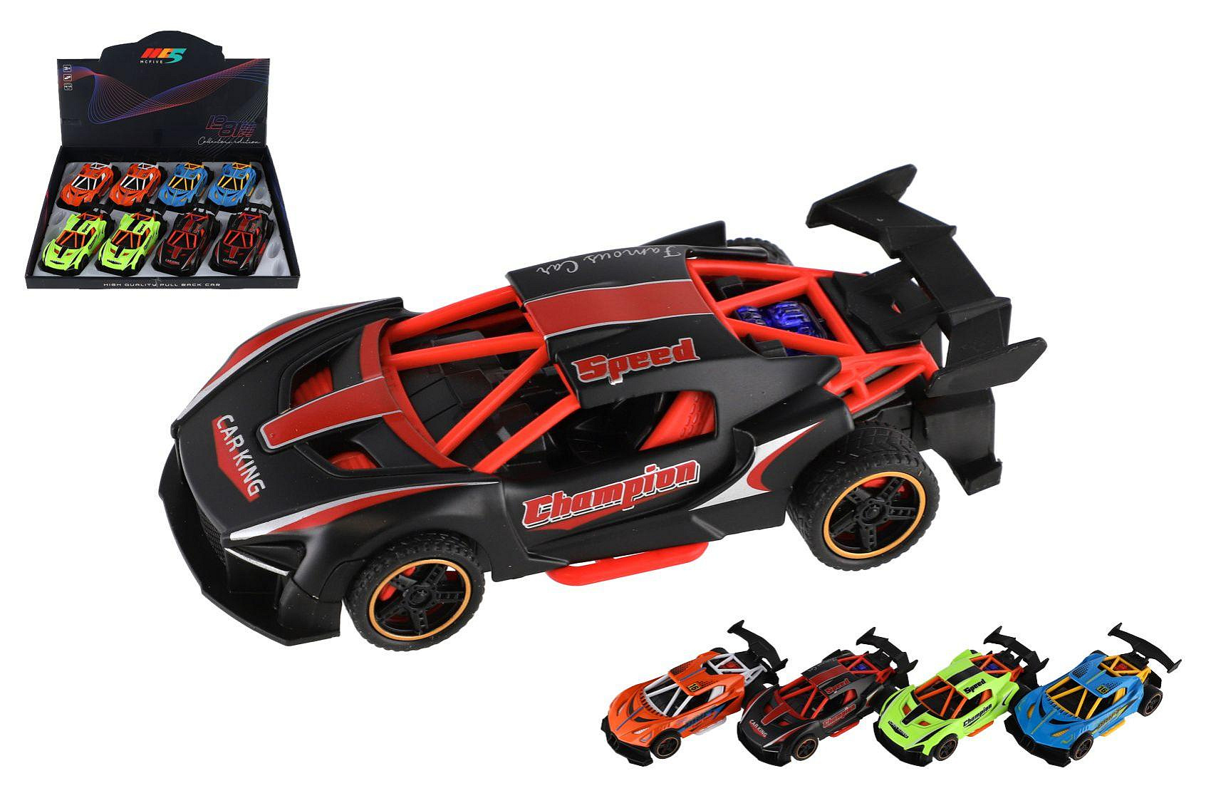 Auto závodní kov/plast 14cm na zpětné natažení 4 barvy 8ks v boxu
