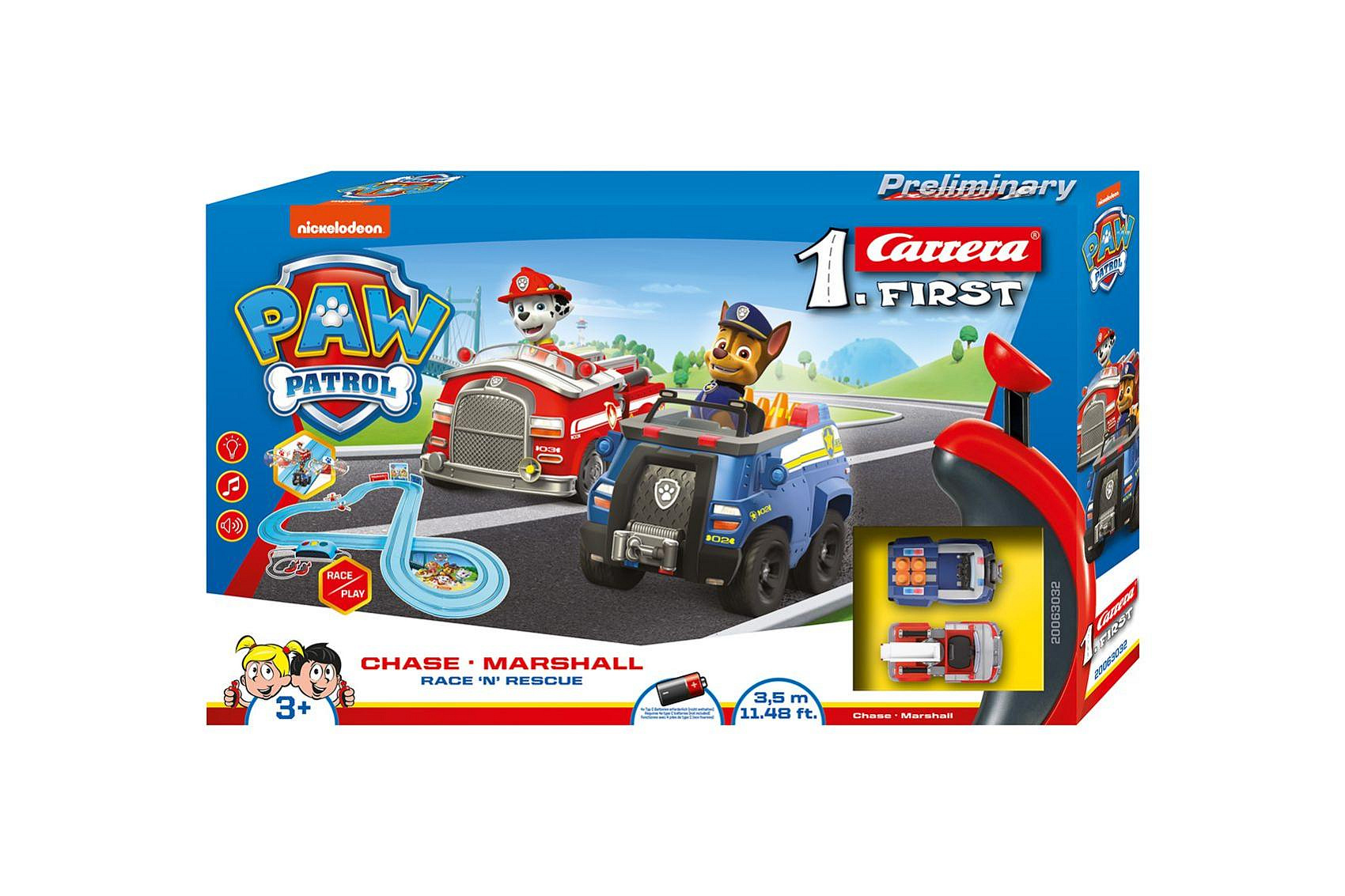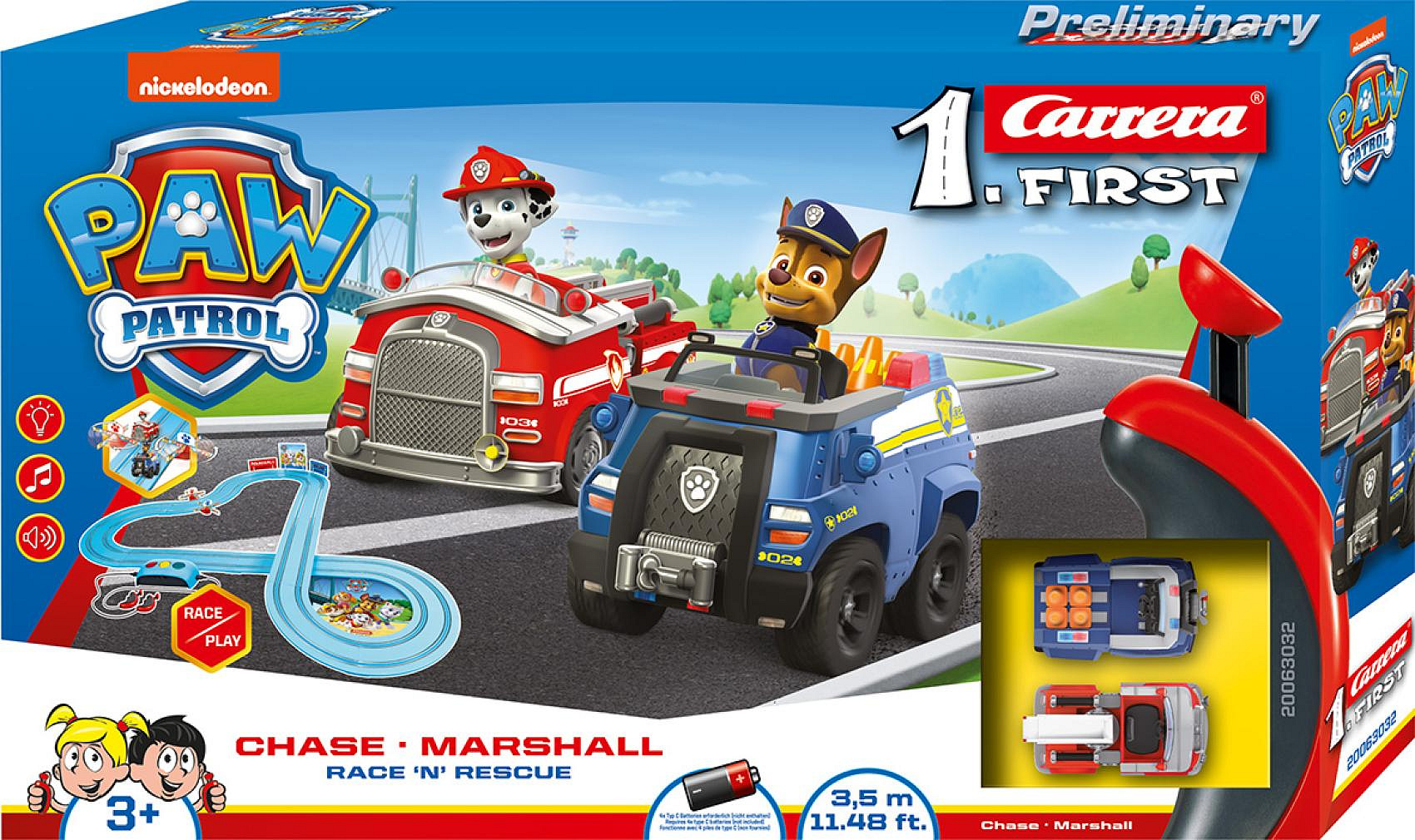 Autodráha Carrera FIRST dlouhá 3,5m s auty ze seriálu Tlapková patrola, pro děti od 3 let, na baterie, obsahuje napájecí díl s interaktivními hrami, zvuky a světly, rovinky, zatáčky, vrtule pro větší zábavu při jízdě, ovladače a dekorace s tématikou Tlapková patrola. Obsah balení: 1x auto Tlapková patrola Chase, 1x auto Tlapková patrola Marshall, rovinky, zatáčky, 2x vrtule pro větší zábavu při projíždění, 1x napájecí díl s interaktivními hrami, zvuky a světly, 2x ovladač rychlosti, Podpěry, mantinely, návod. Neobsahuje baterie (4x C). Délka trati: 3,5 m Rozměry po sestavení: 115 x 115cm Rozměry balení 50 x 30 x 8 cm.
