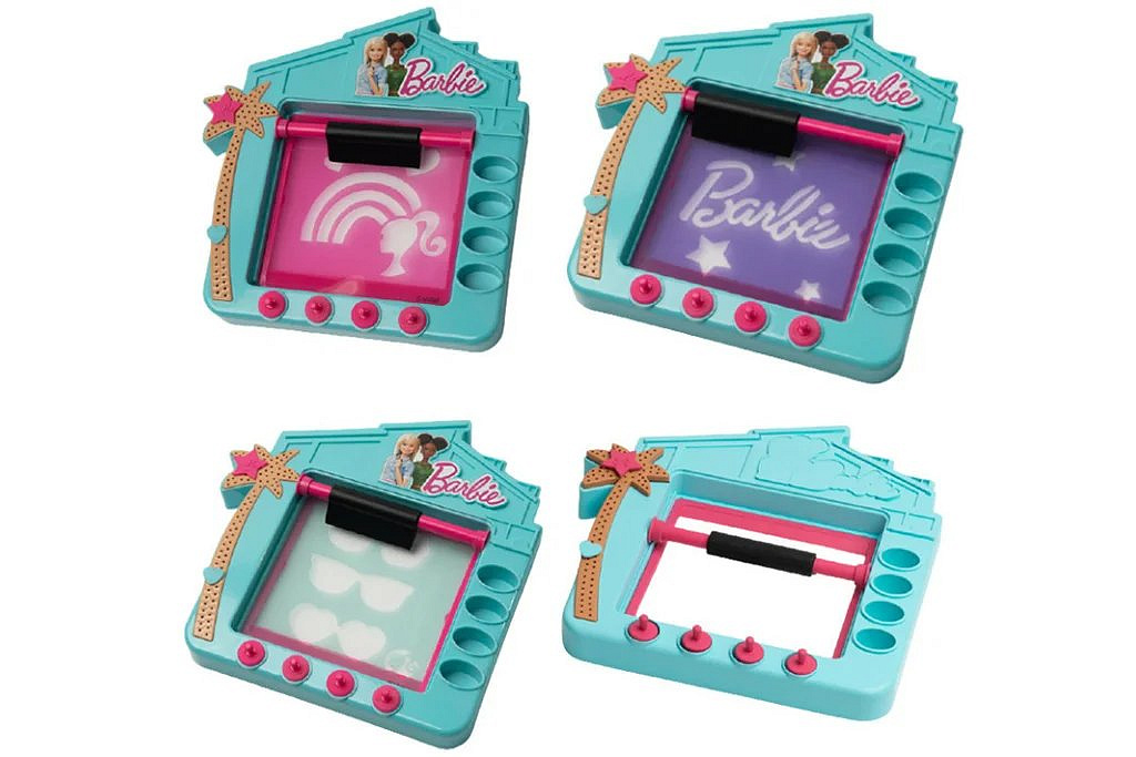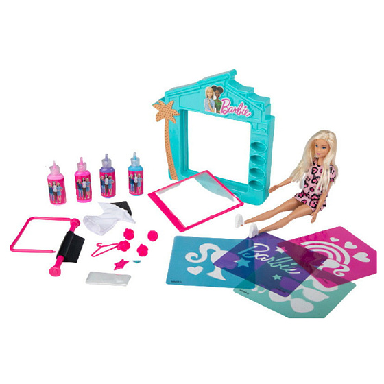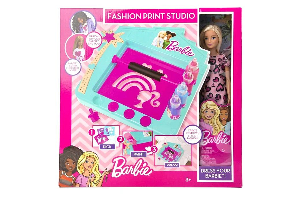 - Obsah balení: Sada obsahuje tiskařské studio s korkovou deskou, odnímatelnou posuvnou lištu, síťovanou desku, razítka, stojan s věšákem, panenku Barbie, Barbie tričko, šablonu, 4 různé barvy na látku, houbičku na mytí, rukavice a vše, co potřebujete pro kreativní návrhy.