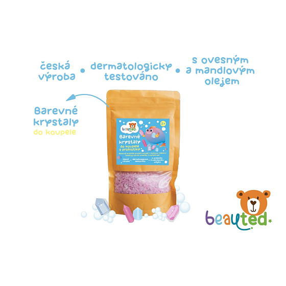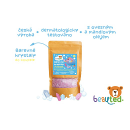 Barevné krystaly beauted šumí, barví vodu a zároveň pečují o jemnou dětskou pokožku. Obsahují probiotika podporující přirozenou ochranu pokožky. Obohaceny o minerály z mořské soli, ovesný extrakt a mandlový olej. Dermatologicky testováno – vhodné i pro citlivou dětskou pokožku. Český výrobek. Praktický uzavíratelný sáček pro snadné skladování a zachování čerstvosti. Barevné krystaly vytvoří ve vodě zábavný efekt a příjemnou vůni. Nasypte do teplé vody potřebné množství krystalů, sledujte jejich šumivý efekt a nechte se unést hravou atmosférou koupele.