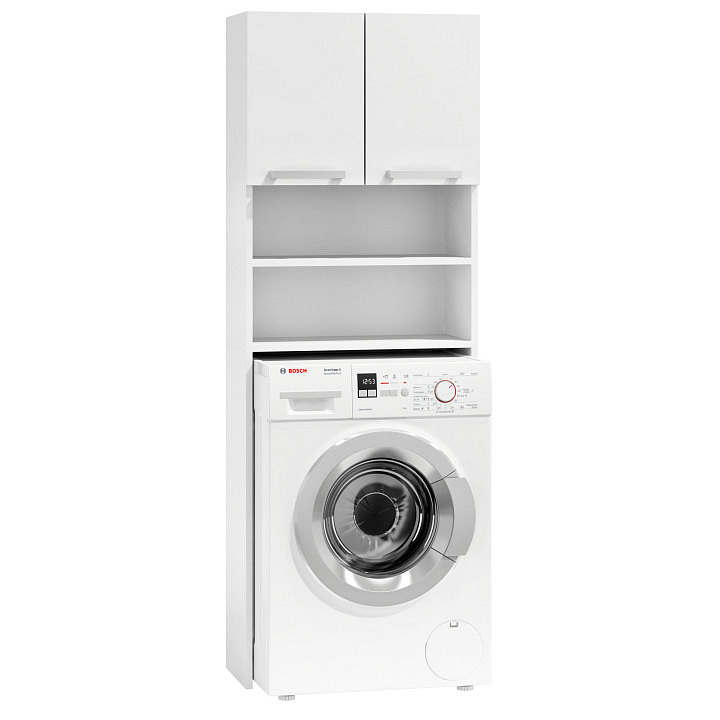Vertical bathroom shelf is the perfect solution for people who value clever solutions. The cabinet has been designed in such a way that a washing machine can fit in its niche. Thanks to this, above the washing machine we gain a lot of usable space on two open shelves, and in the cabinet with doors. Shelves and cabinet can be used to organize towels, cleaning products and other bathroom accessories while gaining order and tidiness in the bathroom.