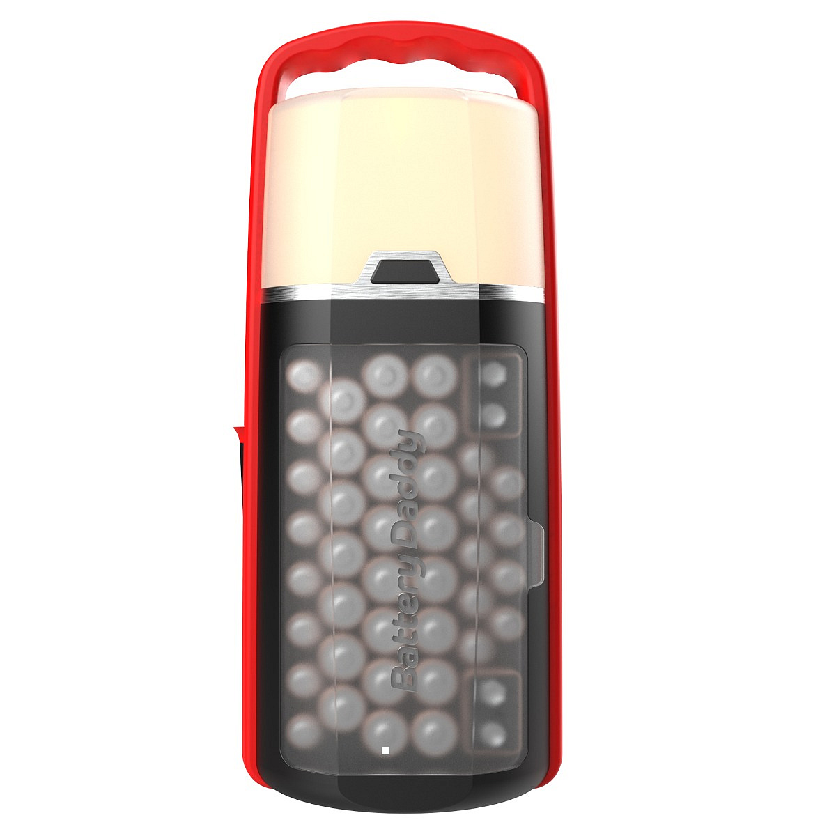 The battery box has a sleek and compact design. Thus, both sides can be used to store up to 42 batteries of all types. The box has room for 78x AA, 64x AAA, 8x 9-Volt, 10x C, 12x button cell and 8x D batteries. The box can be easily stored in any drawer and thanks to the built-in handle you can take it anywhere. With the Battery Daddy you stay organized and you are prepared for power outages, new gifts or when you need to replace an empty battery.