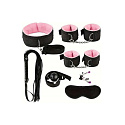 Součástí sady je pohodlný obojek s vodítkem s měkkou vnitřní stranou, která zajišťuje komfort i při delším nošení. Pouta na zápěstí a kotníky jsou vybavena jemnou růžovou podšívkou a řetízkovými spojkami, které umožňují snadné připoutání a zároveň působí stylově.
