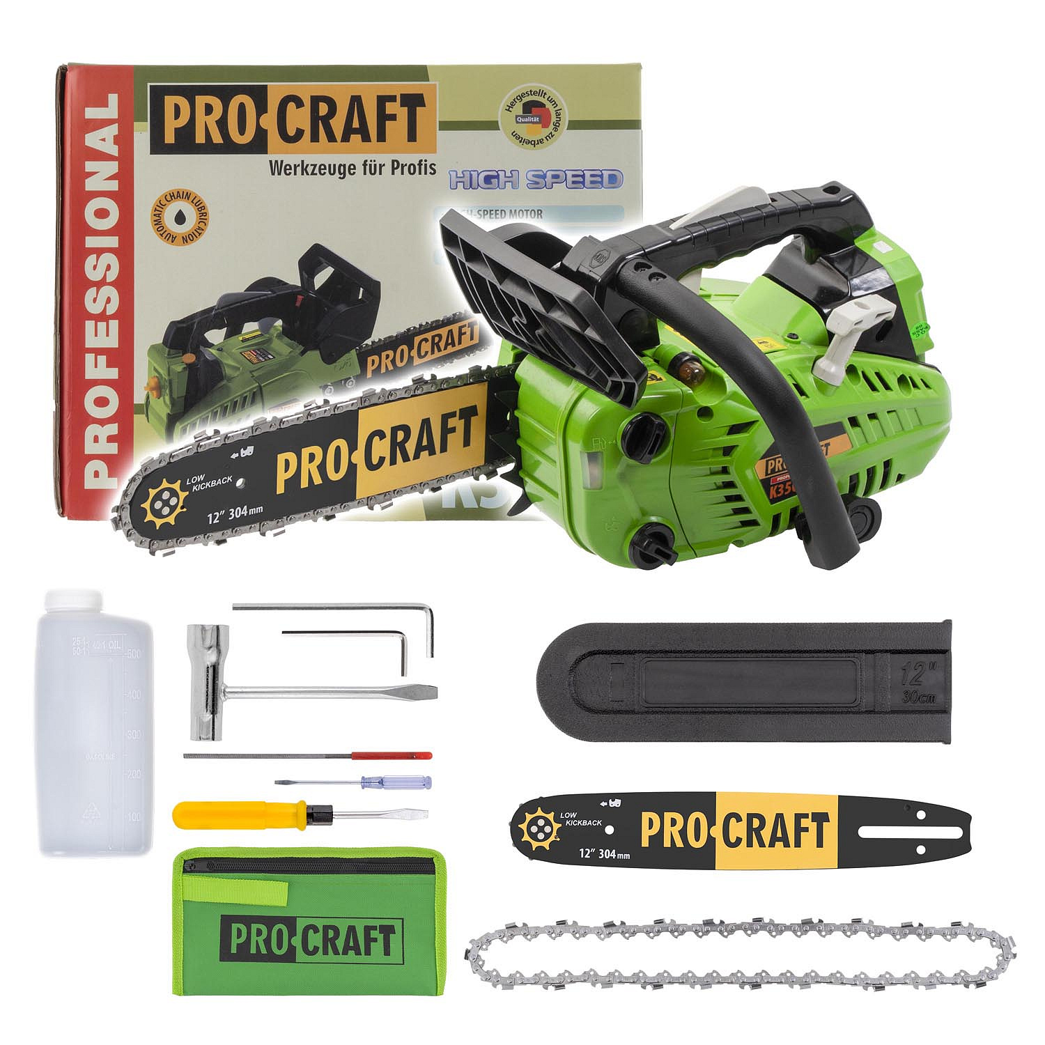 Benzínová řetězová pila Procraft K350S Objem motoru 25 (сm3) Příkon 850 (W) Typ motoru: Jednoválcový dvoutaktní motor Délka lišty 300 (mm) Objem palivové nádrže (ml) 230 Objem olejové náplně (ml) 160