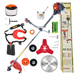 Součástí balení: 3x strunová hlava, kovový kotouč na dřeviny, 3.zubý nůž, ochranná maska, nádobka na přípravu palivové směsi, dvouramenný popruh a sada klíčů Snadné a rychlé startování. Objem motoru (cm3) 42,7 Objem nádrže (ml) 1200