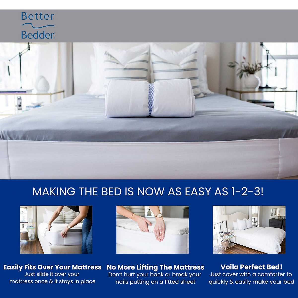 What a shitty job, isn't it? Making your bed. Lifting that heavy mattress to put the cover around it. And then the cover is finally around the corner, you are trying to do the other side, shoot it off again! With the Better Bedder you make making your bed a lot easier and you save a lot of effort, time and frustration. The thick fabric elastic band is made of high quality and ensures that you can make your bed in a few seconds and the fitted sheet stays in place all night long.