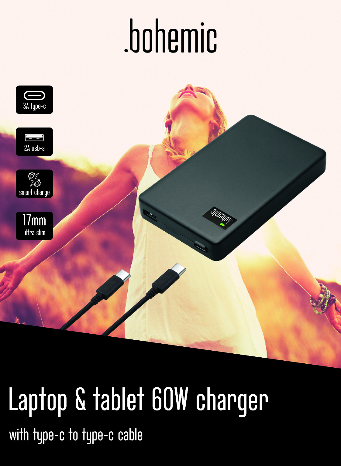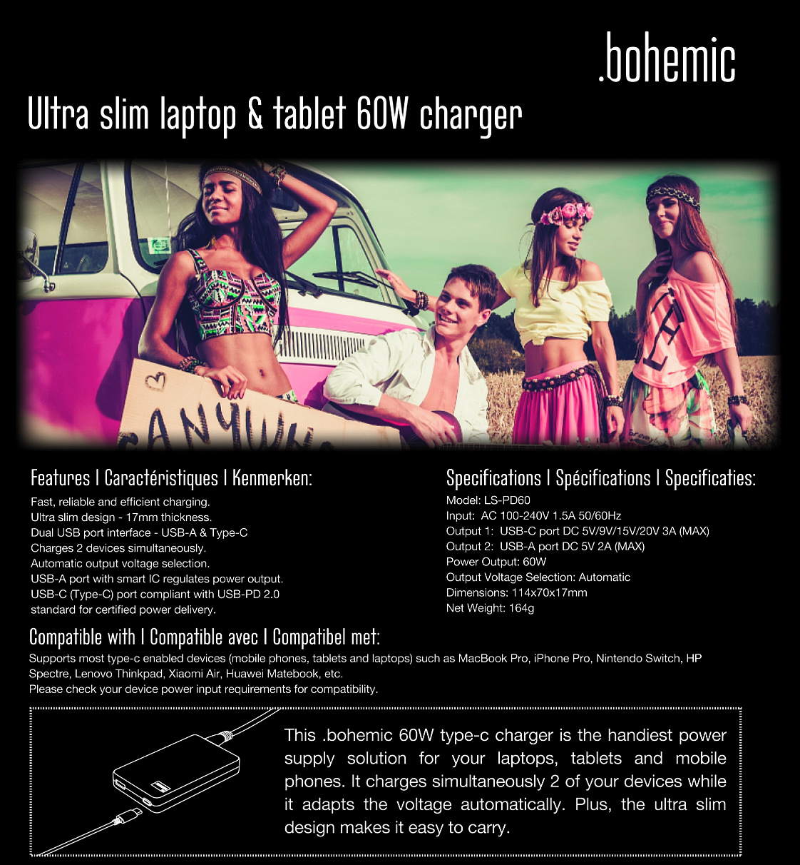 This .bohemic 60W type-c charger is the handiest power supply solution for your laptops, tablets, and mobile phones. It charges simultaneously 2 of your devices while it adapts the voltage automatically. Plus, the ultra-slim design makes it easy to carry.