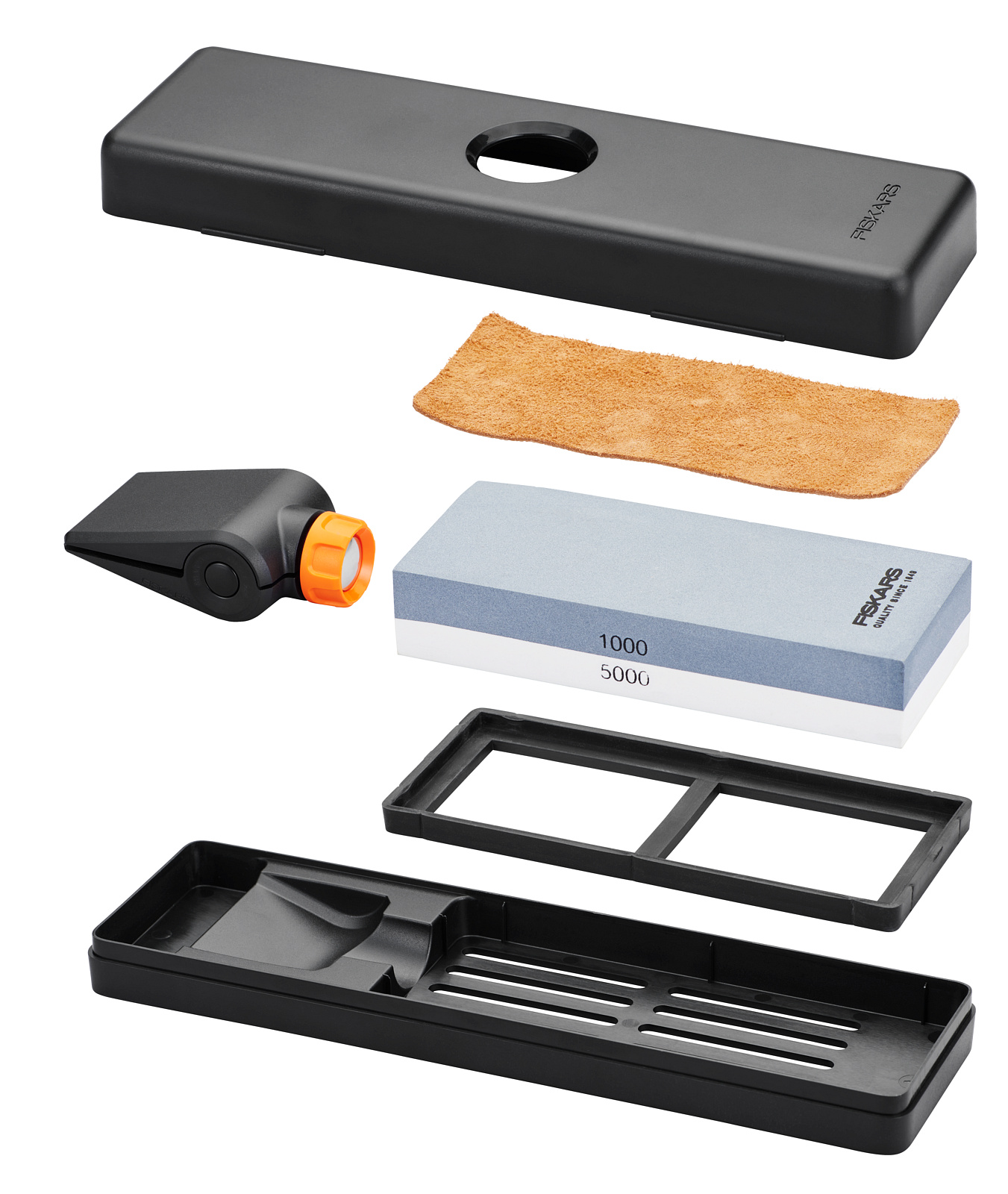 Dokončete údržbu vyleštěním ostři pomocí dodávané lešticí kůže. Položte kůži na kámen s šedou (hrubou) stranou nahoru a opatrně po obou stranách obtáhnete ostři 3-5krát po kůži.