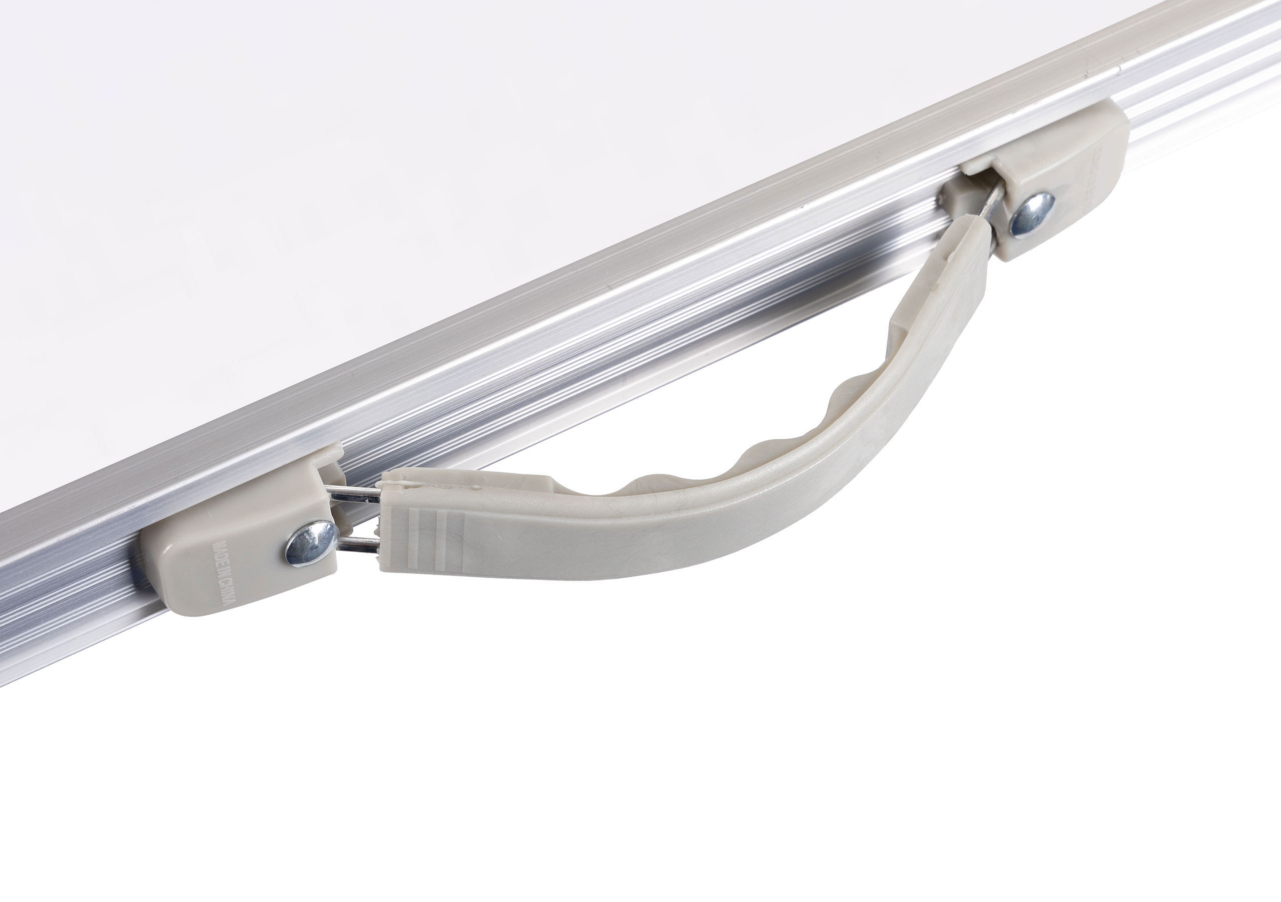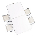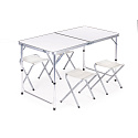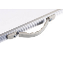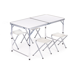 The set folds into a handy suitcase. Stools fit neatly under the table. This clever design keeps everything in one place and makes it easy to store even in narrow spaces.