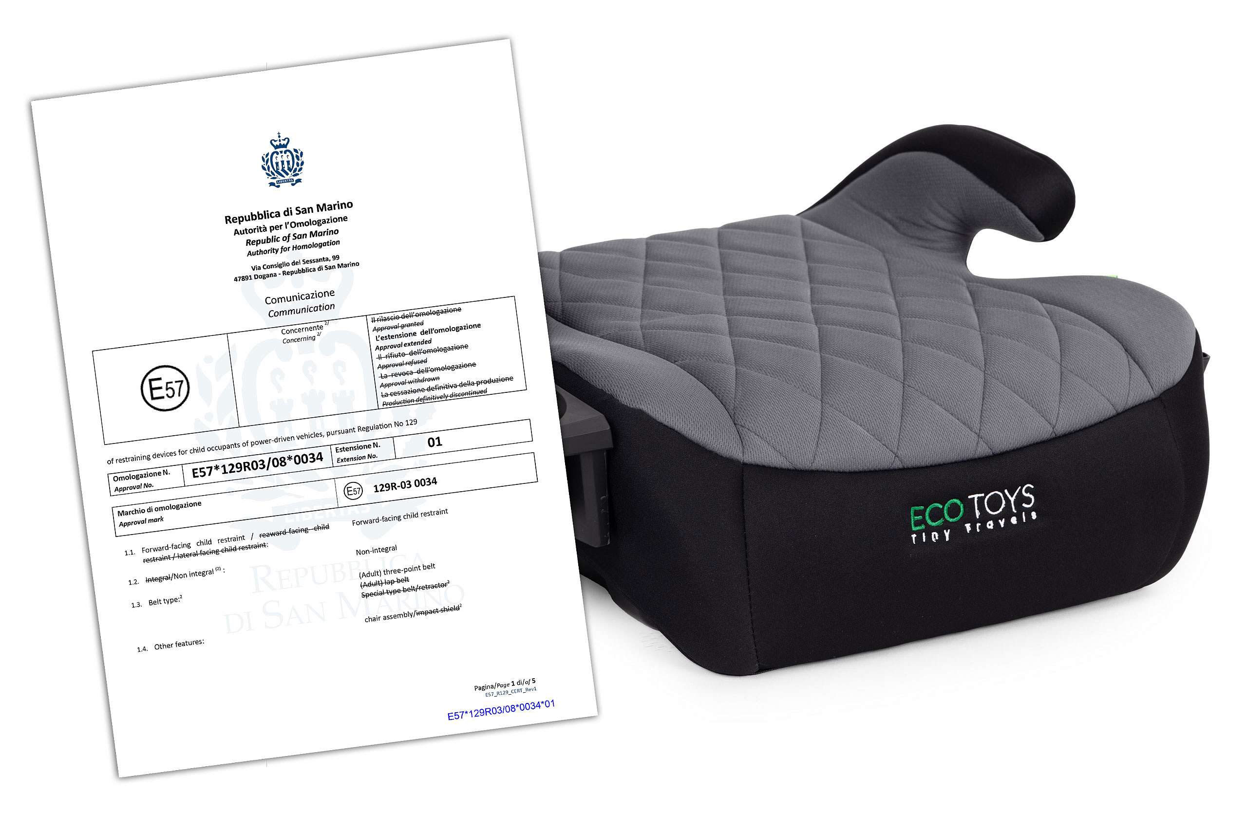 The ECOTOYS car booster seat meets the latest European safety standards in accordance with the i-Size regulation (ECE R129/03). This regulation was introduced to ensure maximum safety for children during car travel and imposes strict requirements on manufacturers of seats and boosters. Our product has passed all necessary tests, including crash tests, obtaining the i-Size certificate confirming compliance with all safety standards. Thanks to this, you can be sure that your child is properly secured during travel.