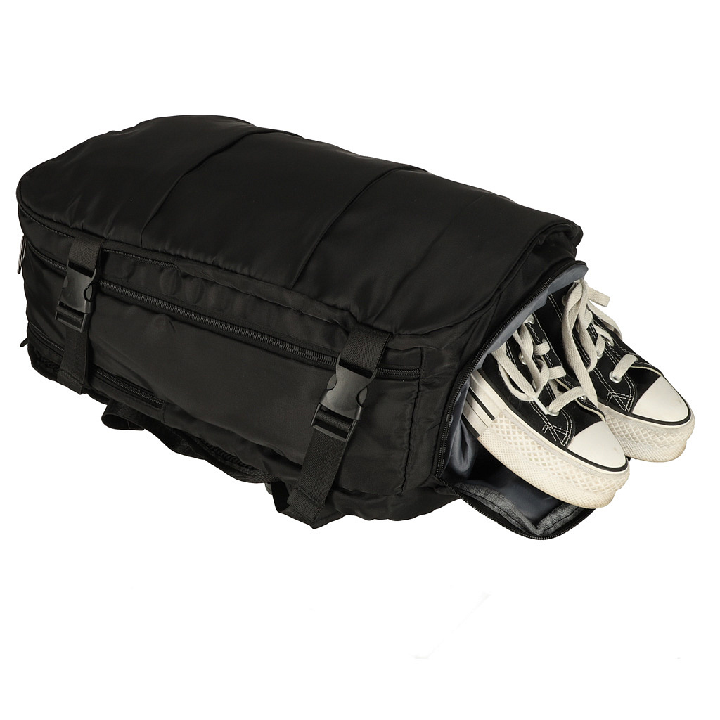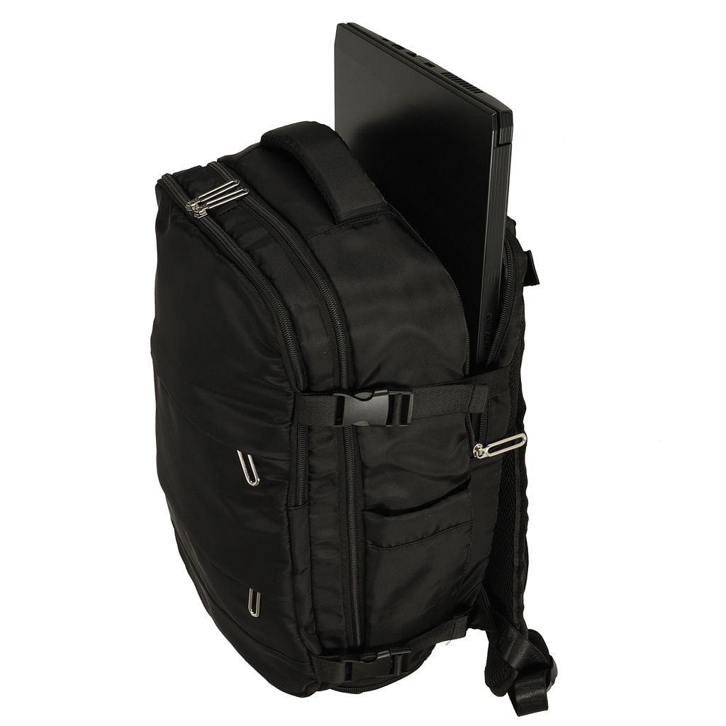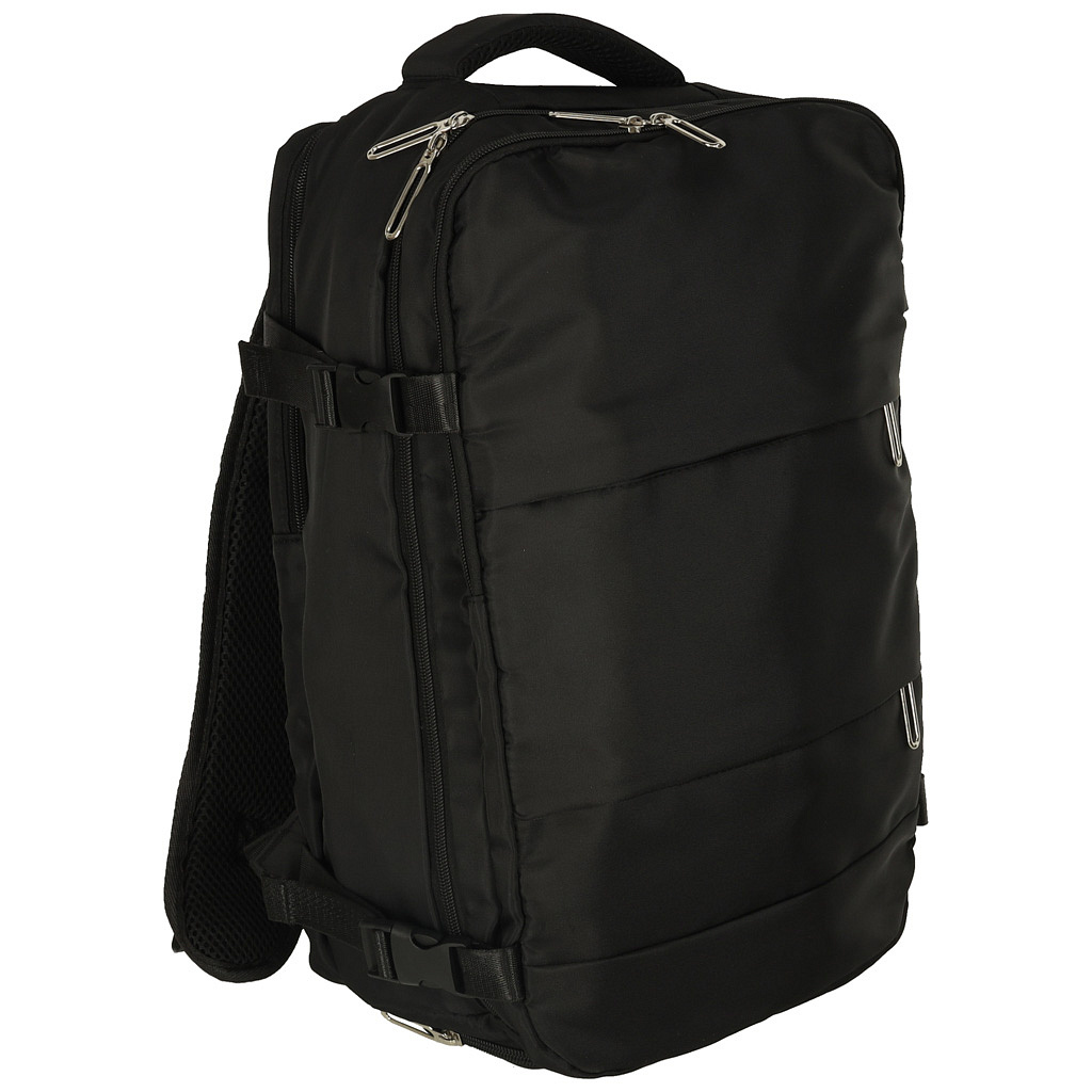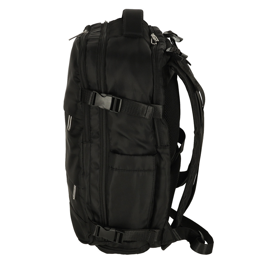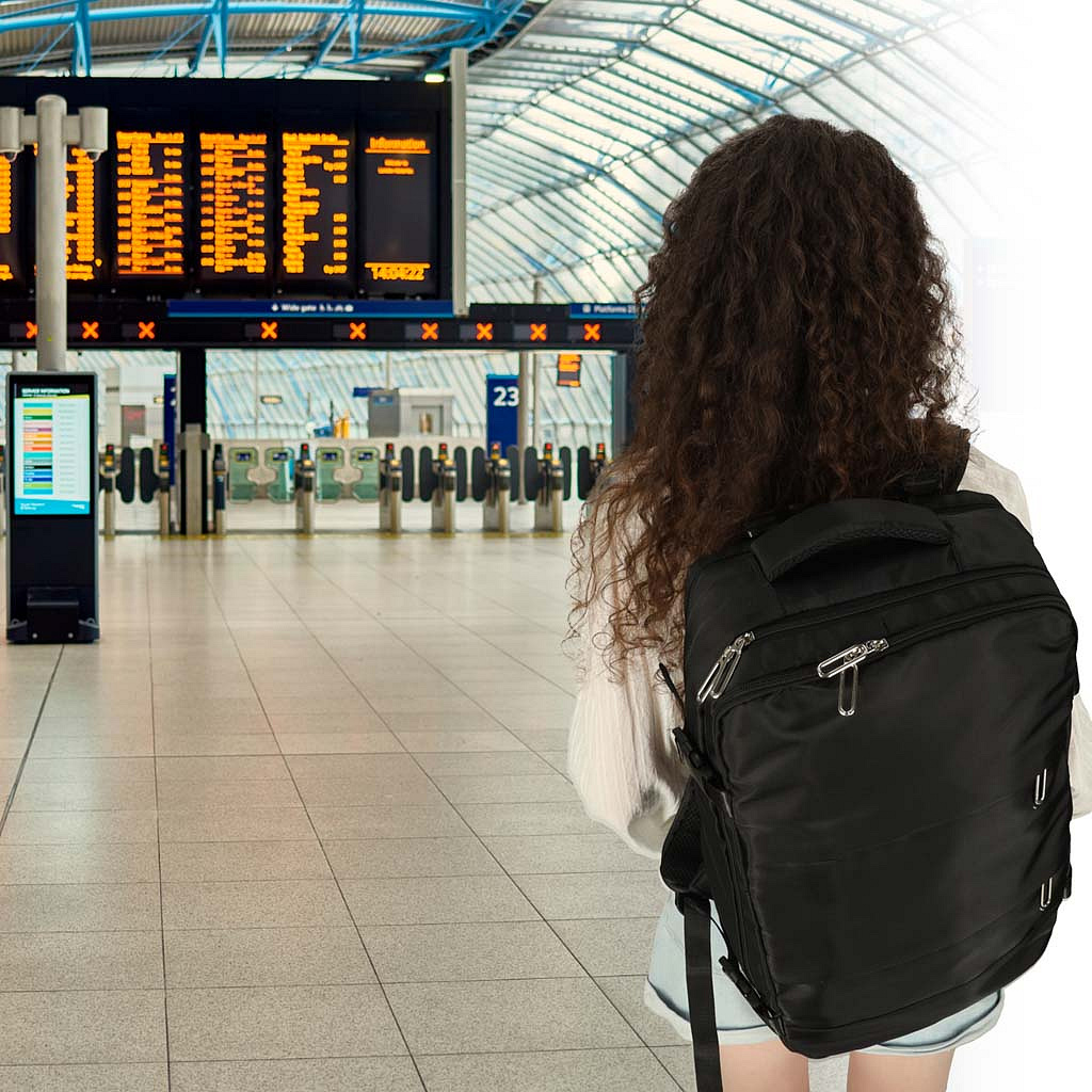 Turistický batoh je přizpůsoben různým dopravním prostředkům – osvědčí se také během pěších výletů. Pěna na zadní straně zajišťuje pohodlí při nošení a elastický popruh usnadňuje přenášení batohu spolu s kufrem.