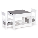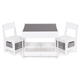 A wonderful set for all little ones — its simple form fits perfectly into children’s rooms, playrooms, or waiting areas. The set is made of MDF, which ensures resistance to damage and scratches. The set is complemented by two stable and comfortable chairs equipped with functional storage baskets under the seats, perfect for storing toys.