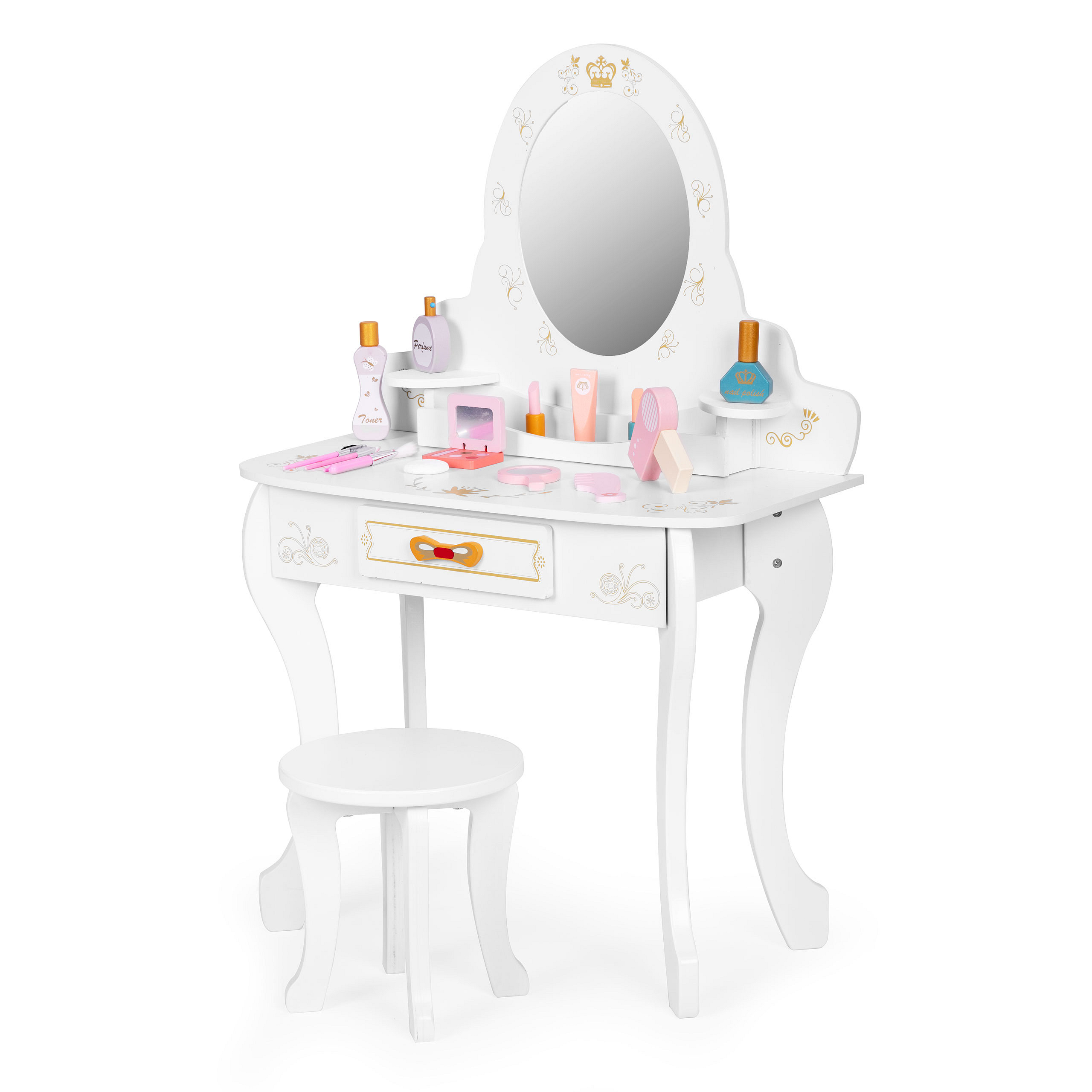 The vanity is equipped with toy accessories such as: