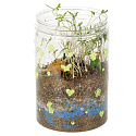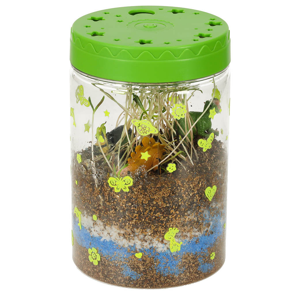 Průhledný plastový kontejner s ventilačními otvory slouží k zasetí přiložených semínek. Sada obsahuje zeminu a barevné kameny, které je třeba umístit do nádoby podle pokynů. Víko terária obsahuje LED diody, které fungují jak jako noční lampička, tak jako dodatečný zdroj světla, který podporuje růst rostlin.