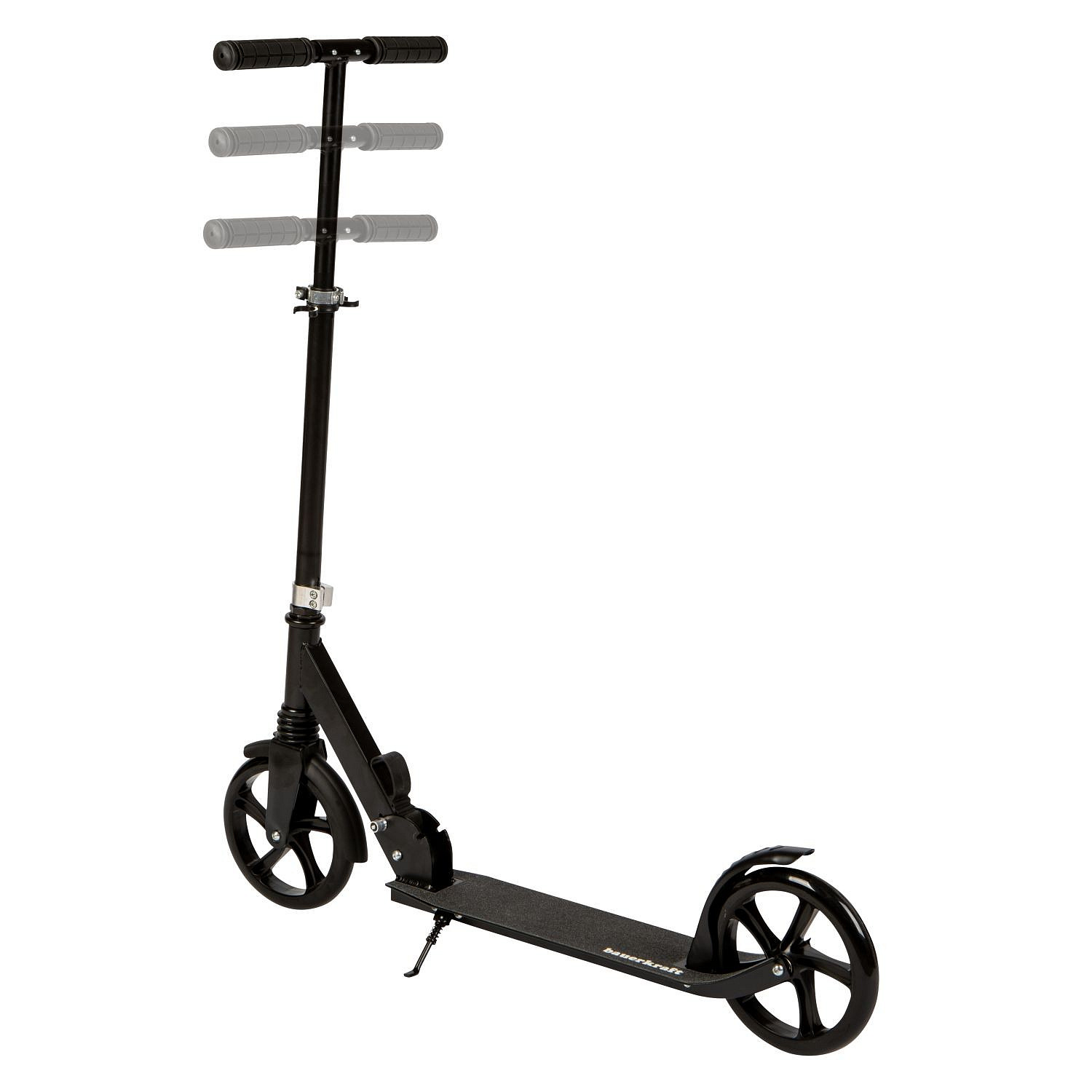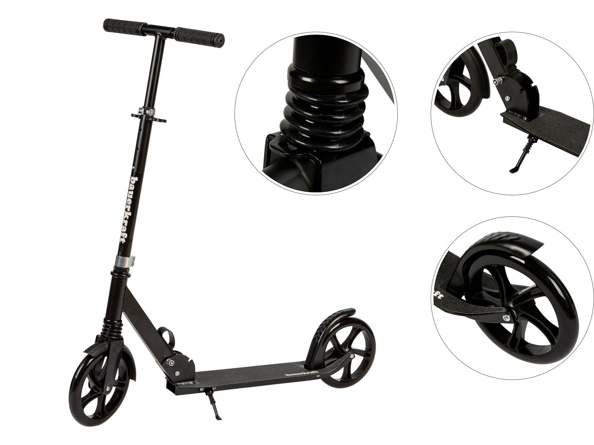 The city scooter is a great choice for school commutes or recreational rides around town. Thanks to its large wheels and suspension system, it performs well on asphalt, sidewalks, and bike paths. The front spring shock absorber reduces vibrations, making the ride more comfortable even on uneven surfaces. A practical kickstand lets you park the scooter safely anywhere without the risk of it tipping over. The rear wheel with mudguard not only adds style but also protects your clothes from splashes of water or mud. Trust a proven design that supports your child’s daily activity in a safe way.