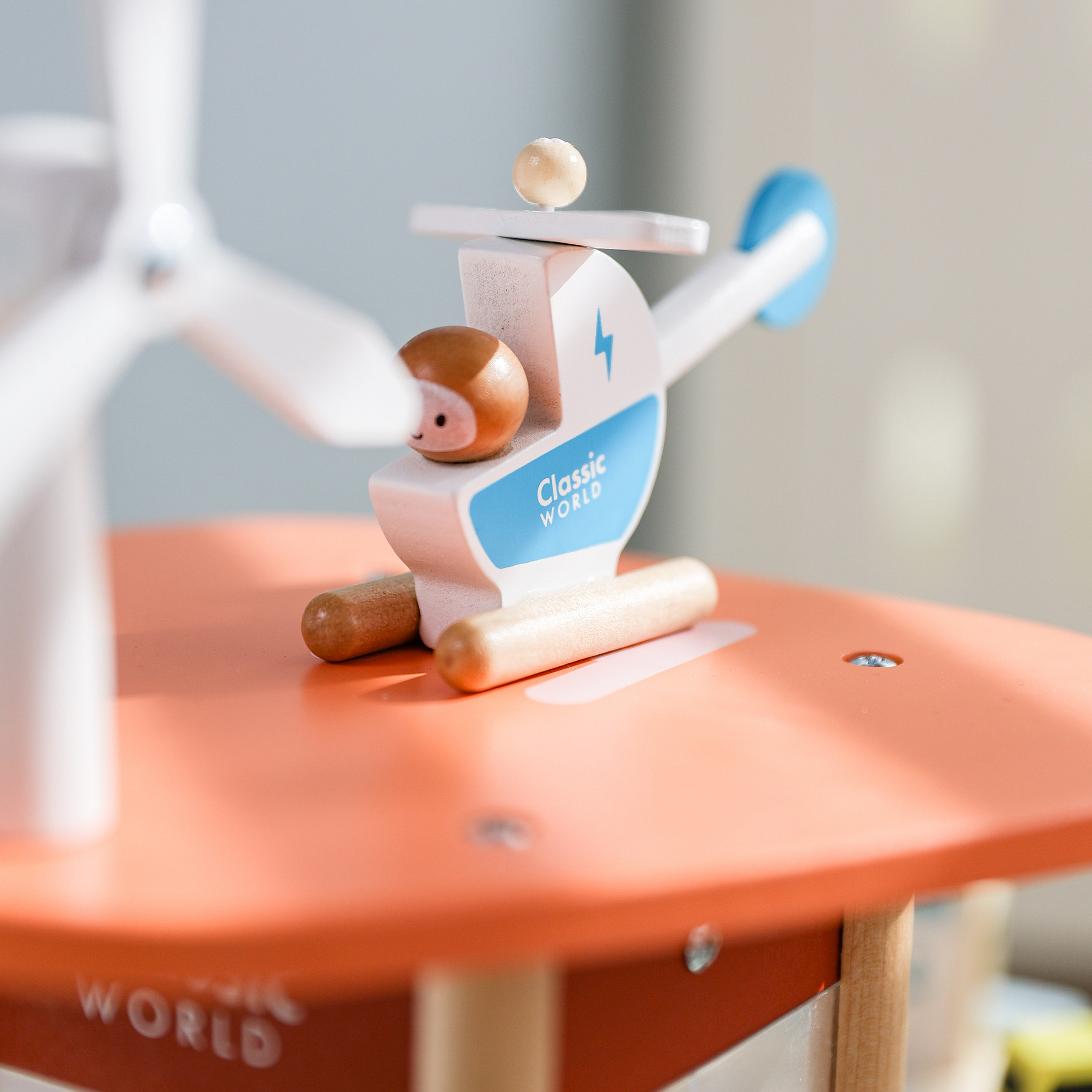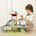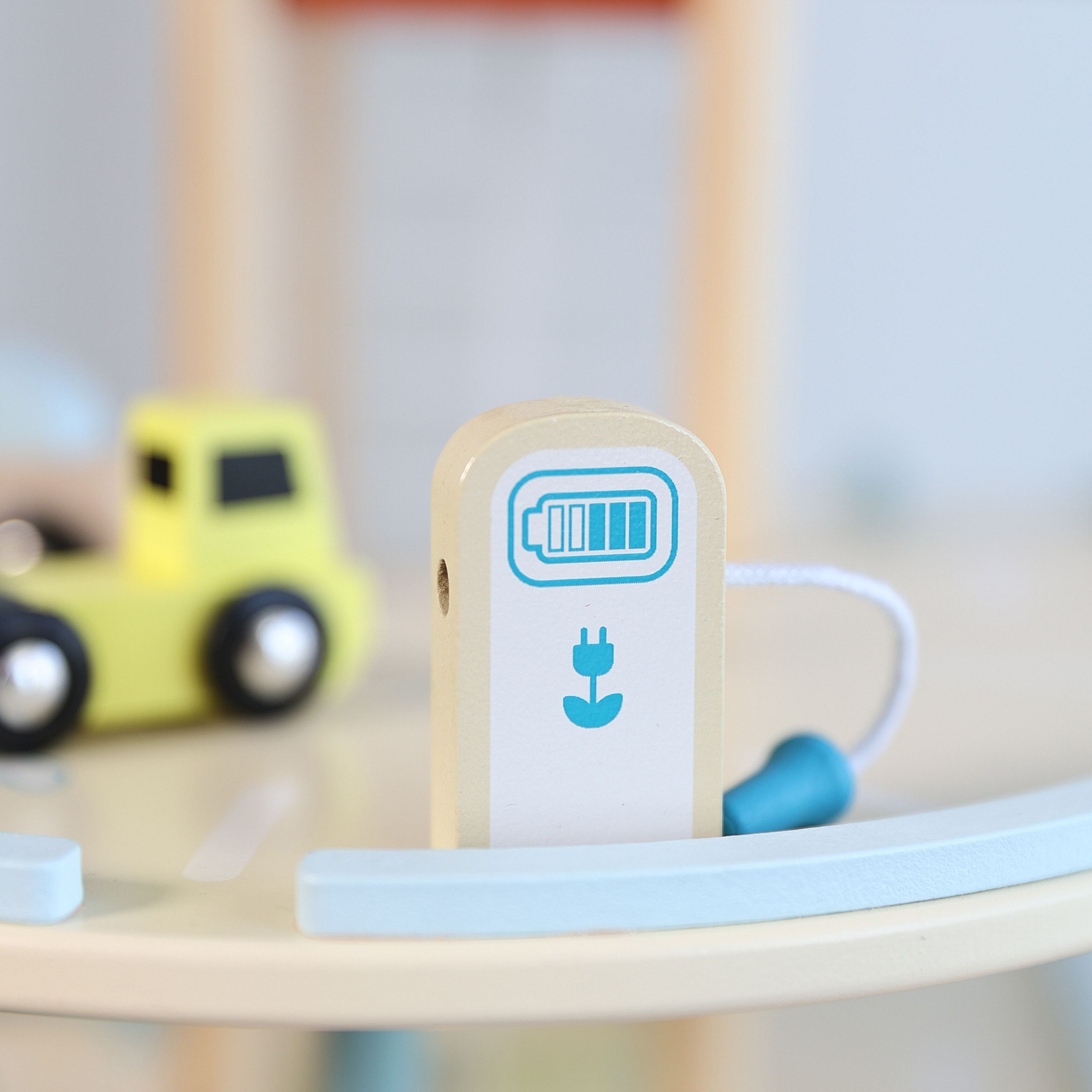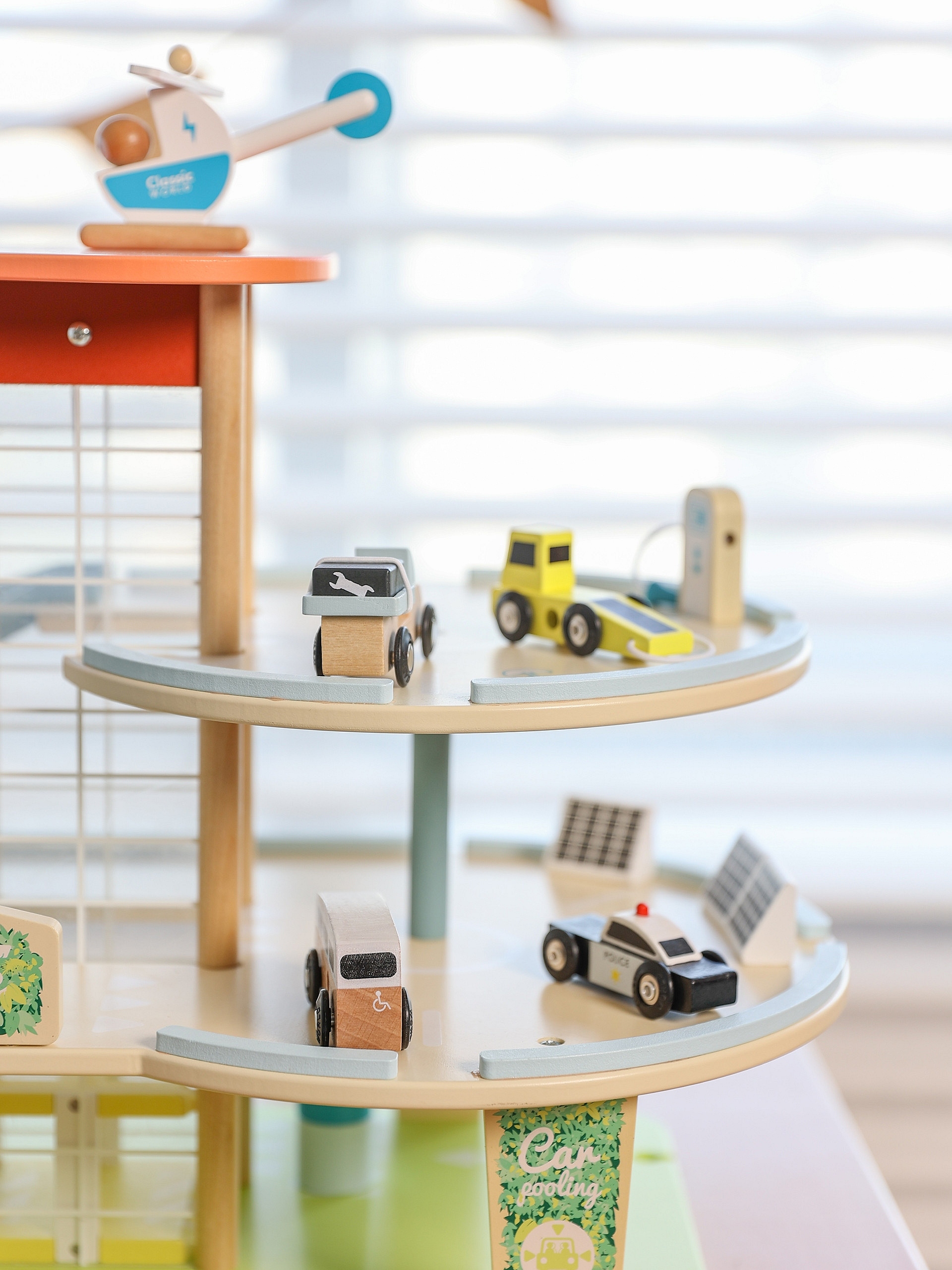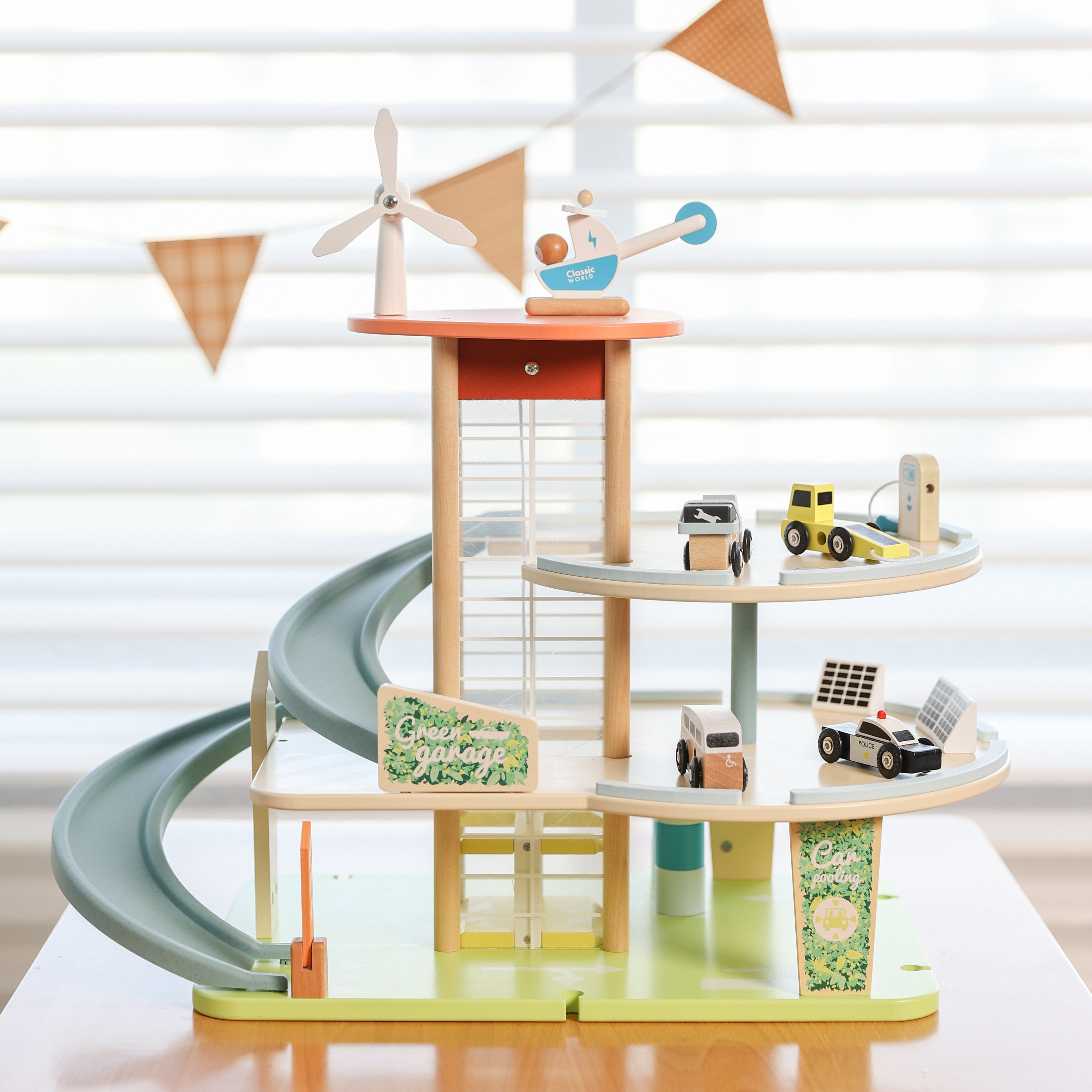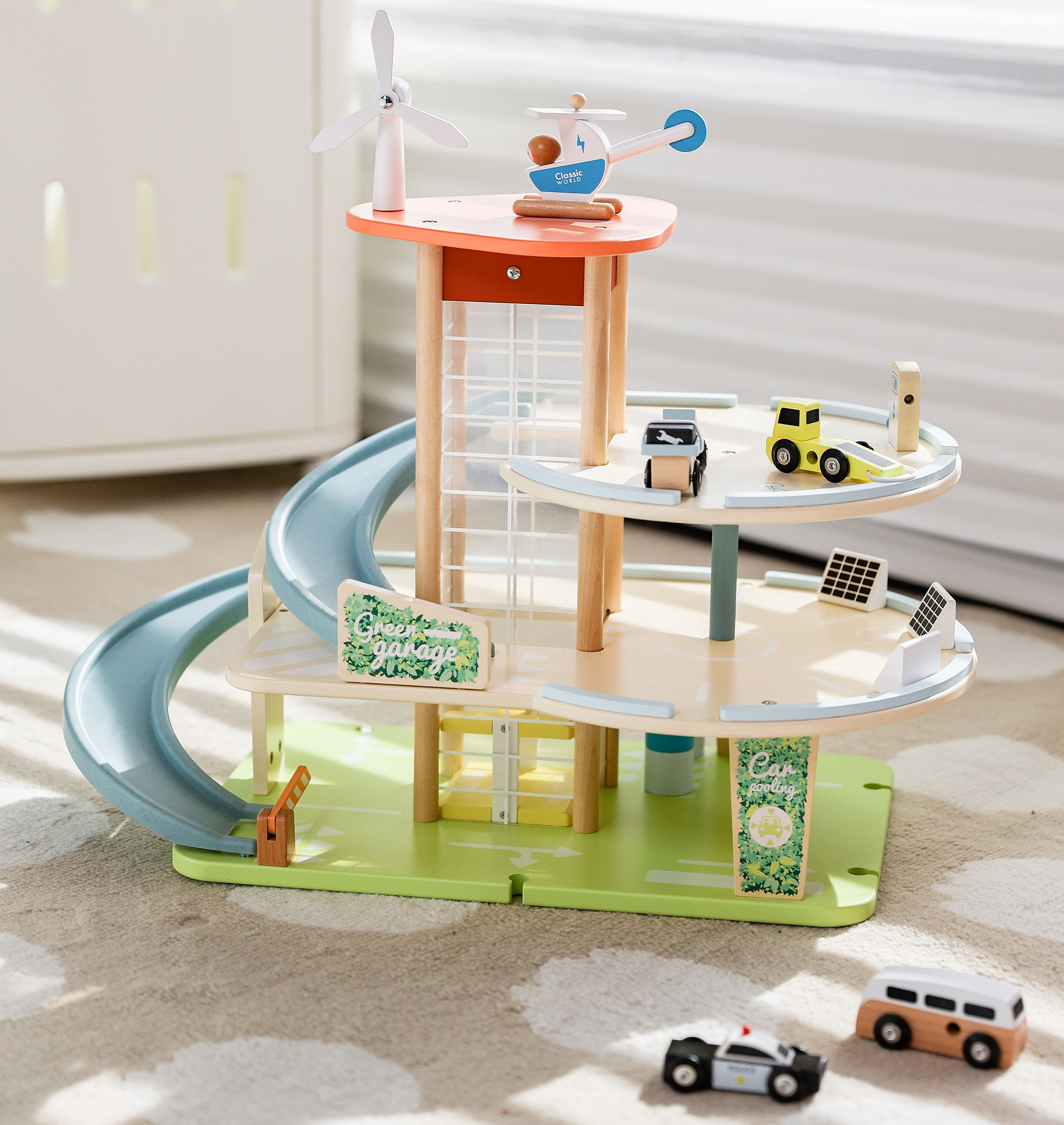 Drewniany Garaż 3 Poziomowy Eko Strefa z Windą od marki CLASSIC WORLD to niezwykła zabawka, która wprowadza dziecko w świat motoryzacji połączony z nowoczesną edukacją ekologiczną. Ten imponujący, wielopoziomowy parking wykonany z wysokiej jakości drewna, wyróżnia się dbałością o detale i funkcjonalnością, która zachwyci każdego małego fana samochodów. Zestaw nie tylko dostarcza rozrywki dzięki ruchomej windzie i szybkim zjazdom, ale także uczy o odnawialnych źródłach energii poprzez zabawę elementami takimi jak panele fotowoltaiczne czy turbina wiatrowa.
