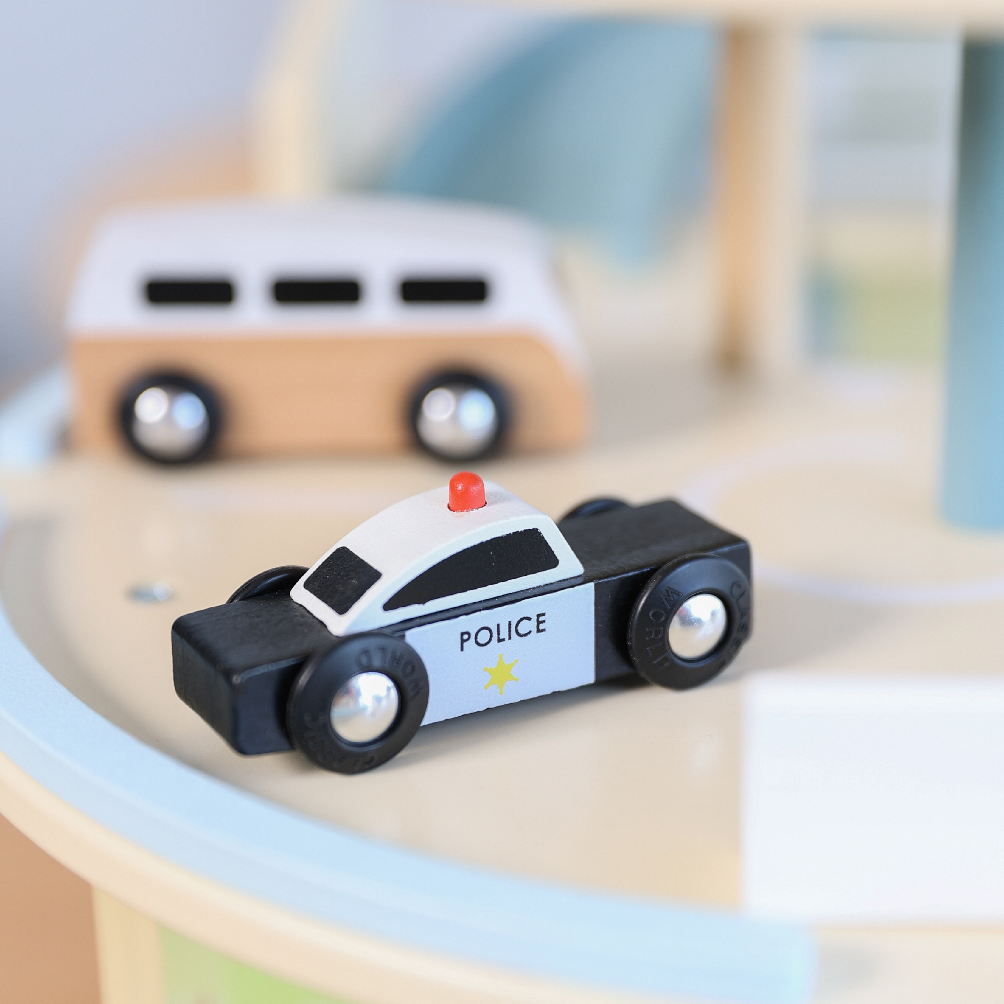 - - 4 drewniane pojazdy: samochód policyjny, autobus, lawetę oraz helikopter