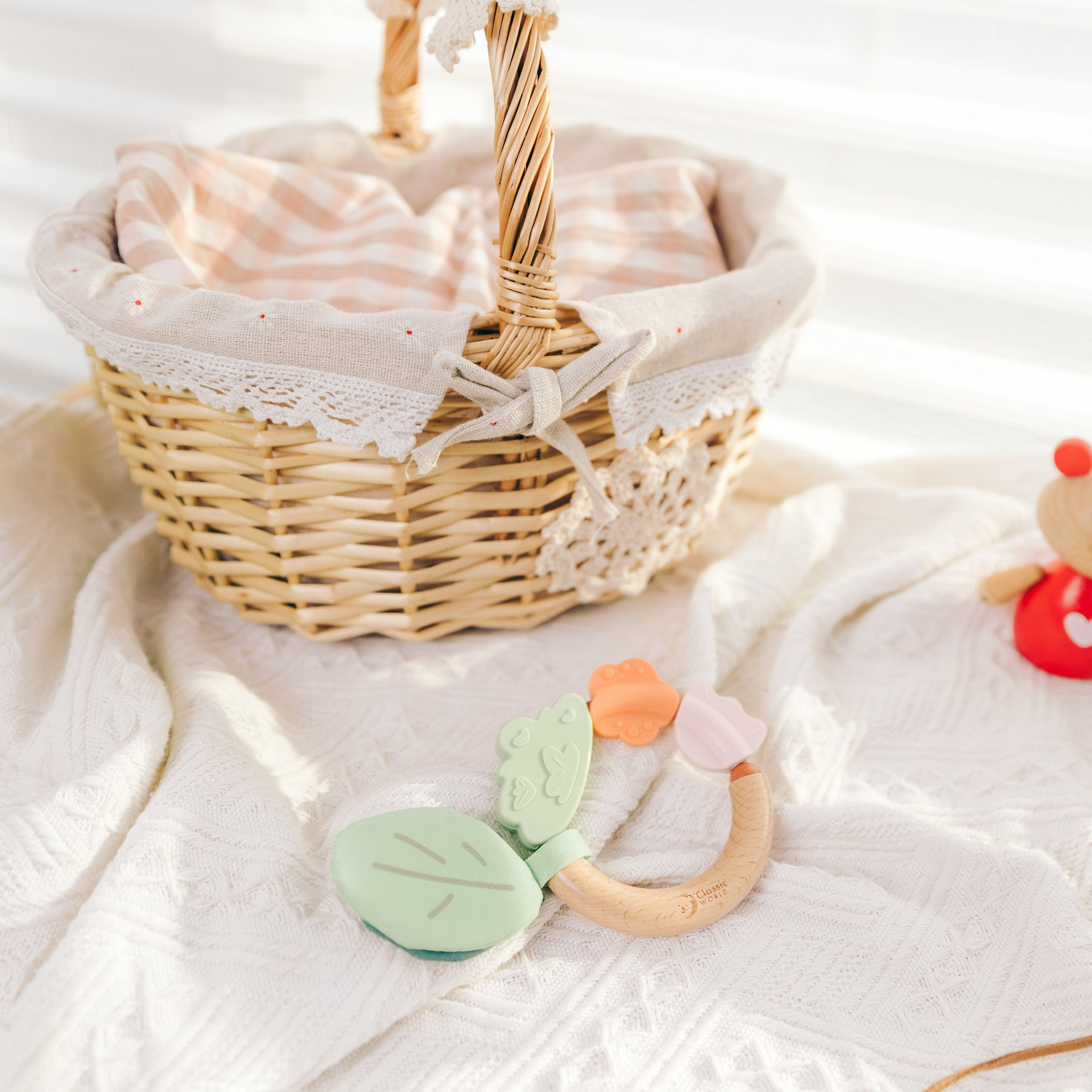 Drewniana grzechotka marki Classic World to bezpieczna, stylowa i przyjazna środowisku zabawka stworzona specjalnie dla maluszków! Grzechotka nie tylko umila czas dziecku poprzez delikatne, stymulujące dźwięki, ale również przynosi ulgę podczas ząbkowania. Połączenie naturalnego drewna i miękkiego silikonu pobudza zmysły oraz zachęca do odkrywania świata, stanowiąc doskonały pierwszy gryzak i grzechotkę dla każdego maluszka.