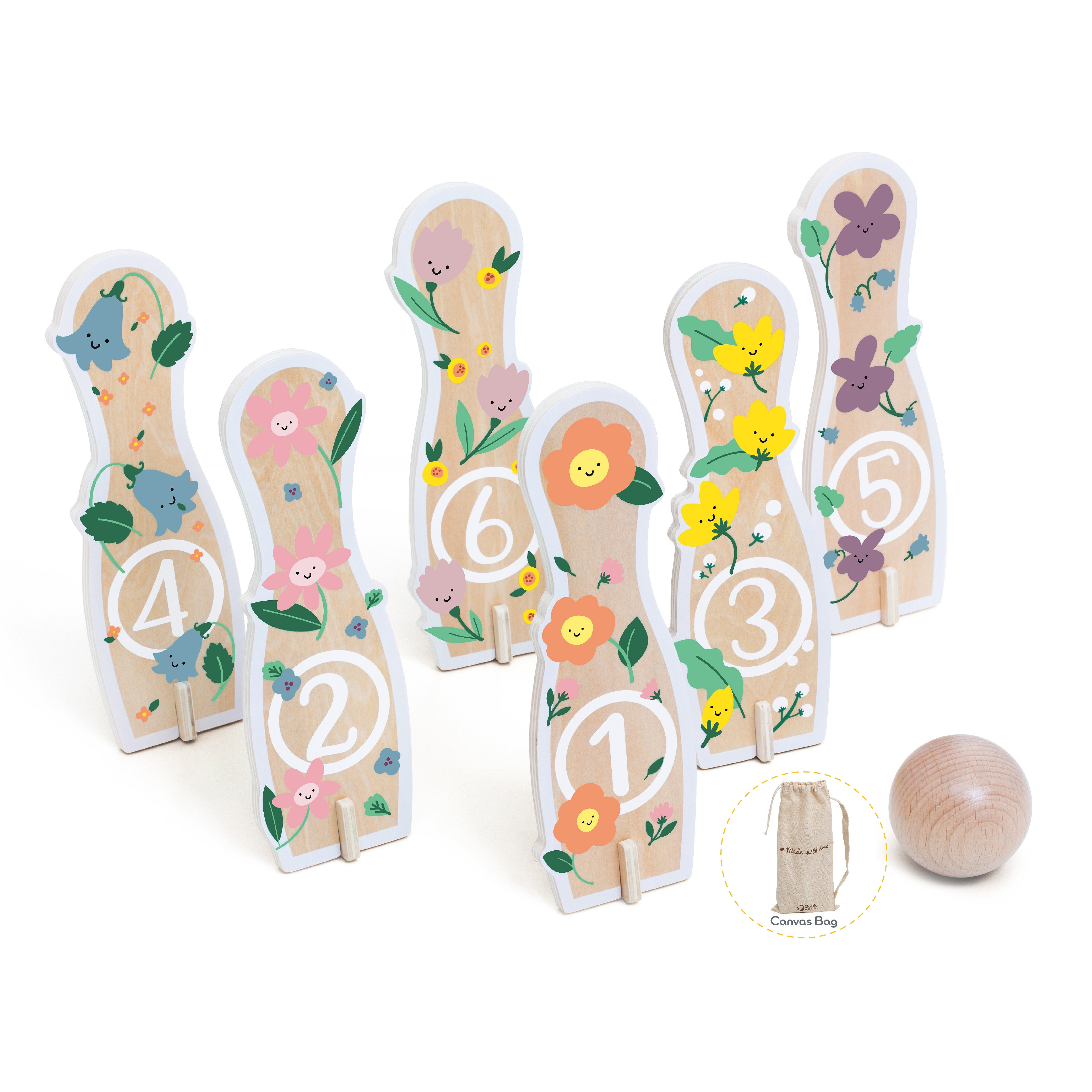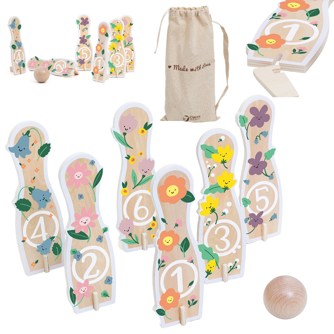 Drewniane Kręgle od marki CLASSIC WORLD to wszystko czego dzieci potrzebują, aby rozwijać zdolności ruchowe i jednocześnie świetnie się, przy tym bawić. Zestaw zawiera 6 kręgli, 1 piłkę oraz worek do przechowywania. Nie musimy przekonywać, że gra w kręgle będzie wspaniałą zabawą dla Twojego maluszka, ale również dostarczy wiele korzyści edukacyjnych. Zabawka rozwija zdolności motoryczne Twojego dziecka poprzez m.in.: bieganie i rzucanie.