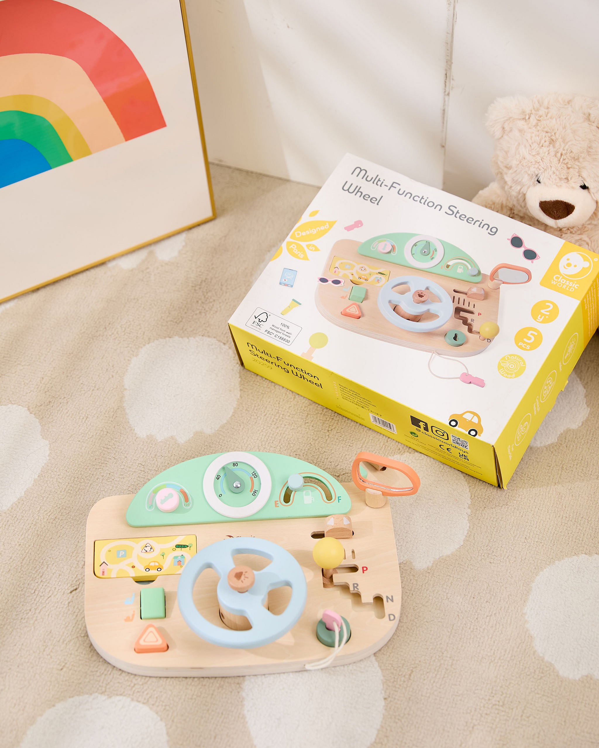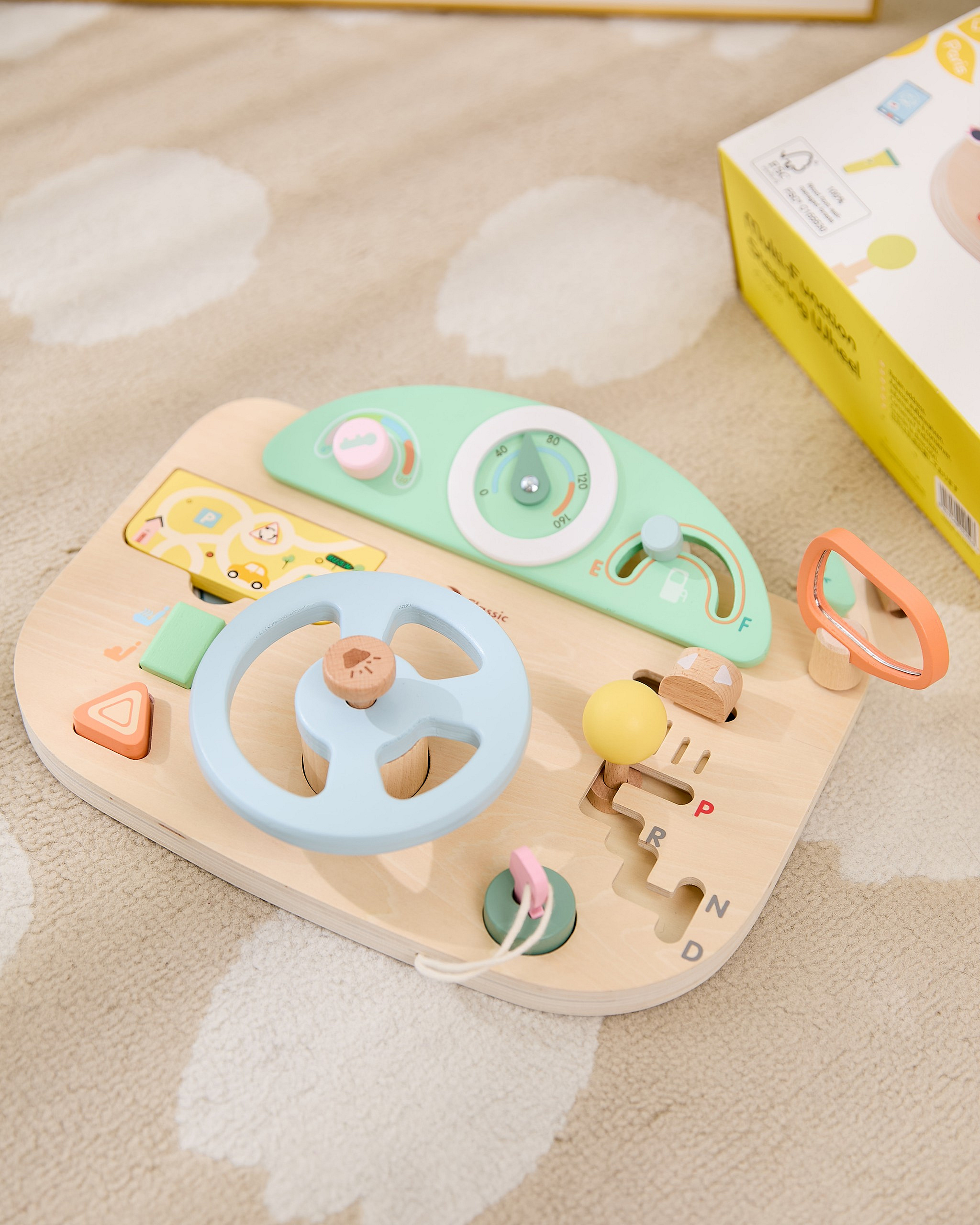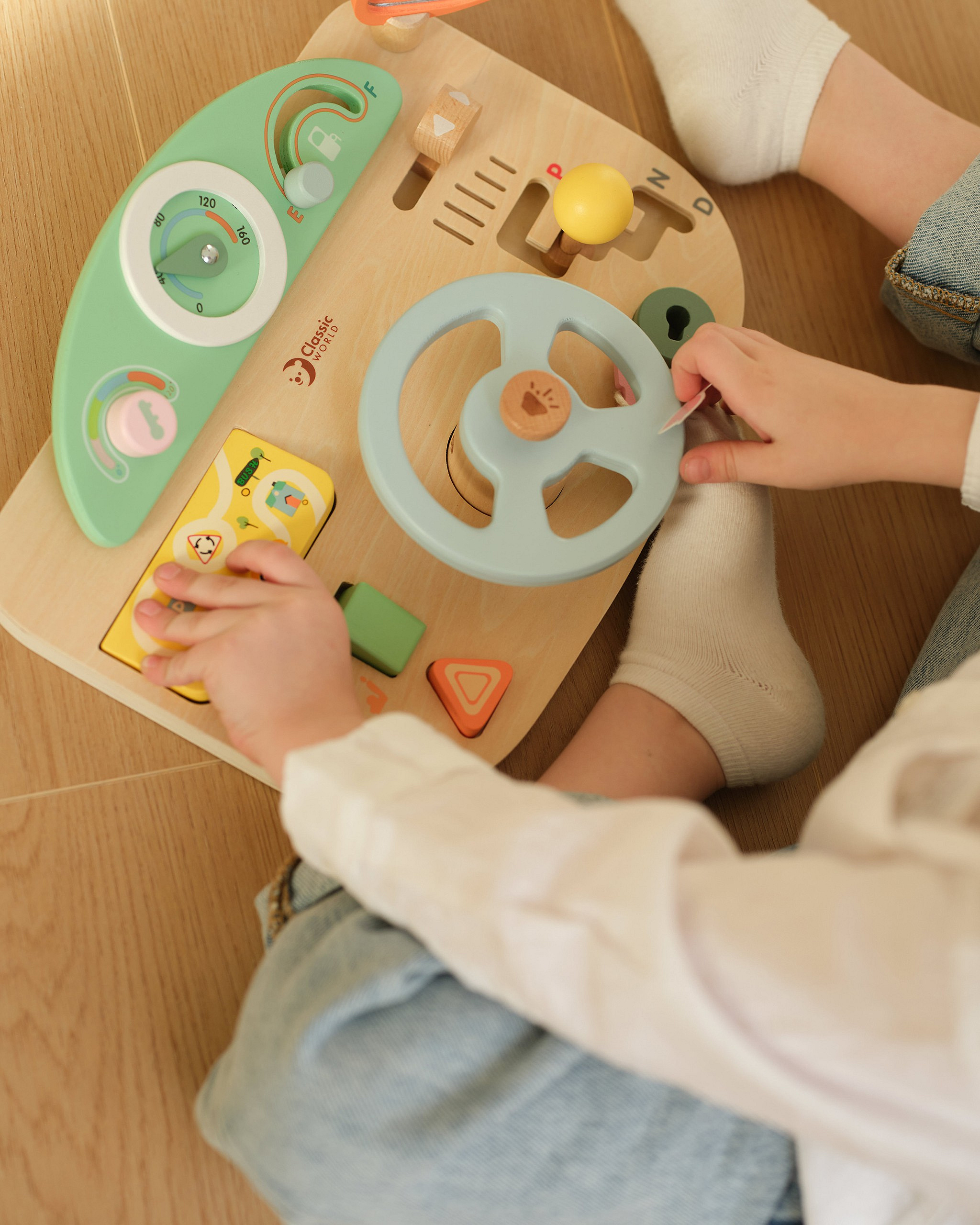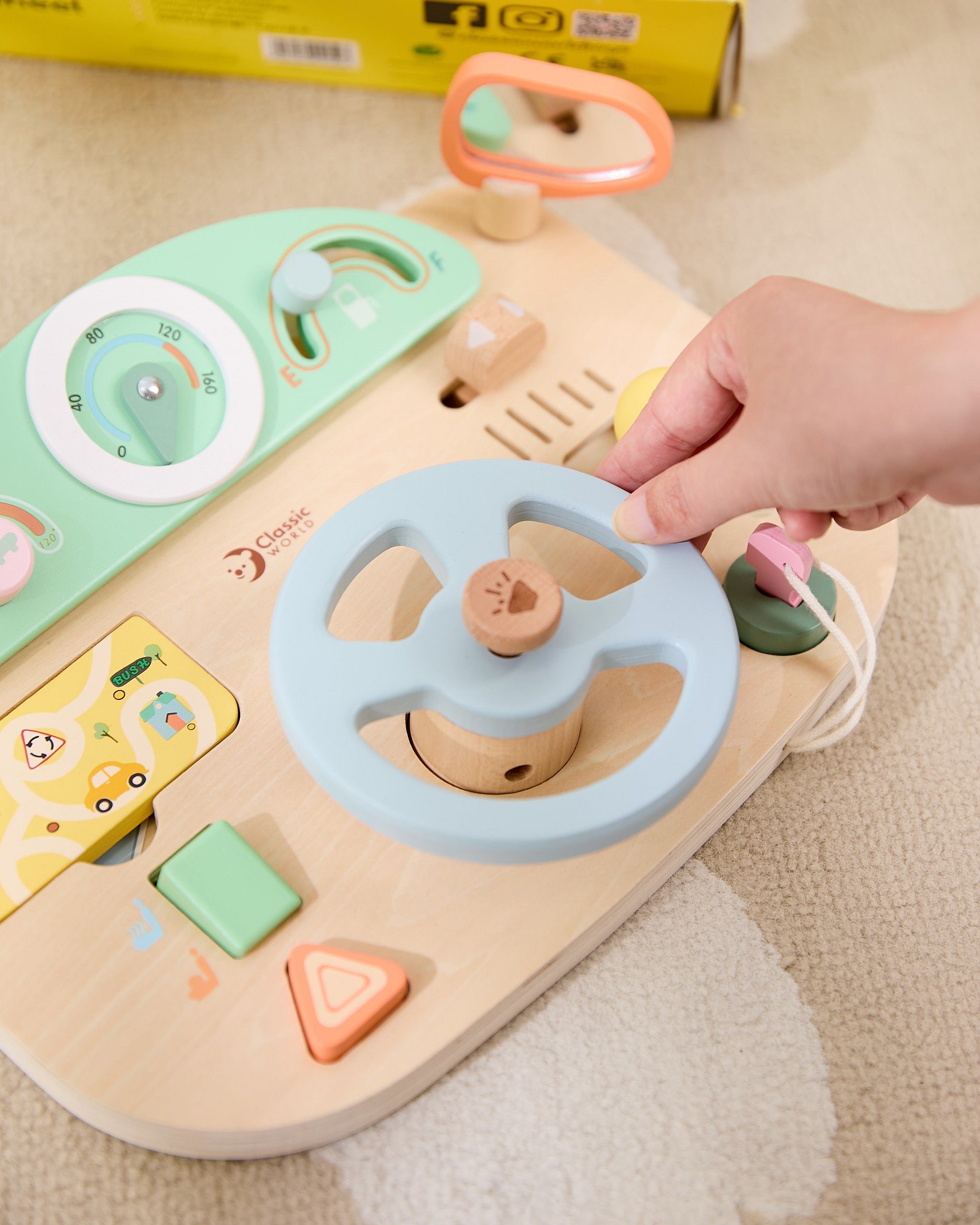 Wielofunkcyjna Kierownica Motoryczna od marki Classic World to wyjątkowa zabawka edukacyjna, która pozwoli Twojemu dziecku poczuć się jak prawdziwy kierowca. Ta innowacyjna tablica manipulacyjna w kształcie kokpitu samochodu została zaprojektowana z myślą o realistycznym odwzorowaniu doświadczeń z jazdy, jednocześnie dbając o rozwój umiejętności manualnych malucha. Wykonana z wysokiej jakości naturalnego drewna, oferuje szereg interaktywnych funkcji, które zajmą dziecko na długie godziny. Zabawka wyposażona jest w ruchomą kierownicę, drążek zmiany biegów oraz liczne pokrętła i przyciski, które symulują obsługę prawdziwego auta. Dziecko może "uruchomić" pojazd za pomocą kluczyka w stacyjce, używać klaksonu wydającego dźwięk oraz obserwować drogę w lusterku. To idealne połączenie zabawy w odgrywanie ról z treningiem małej motoryki.