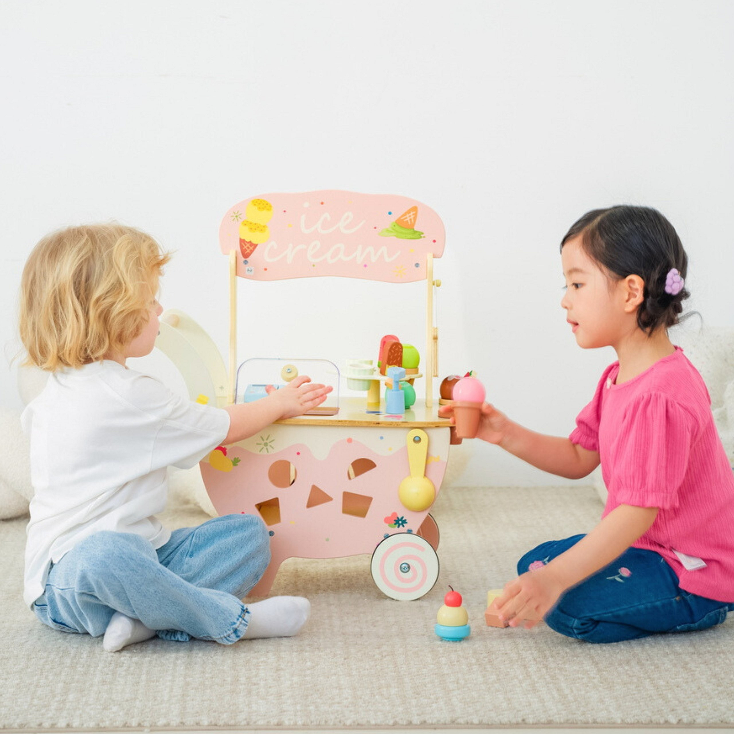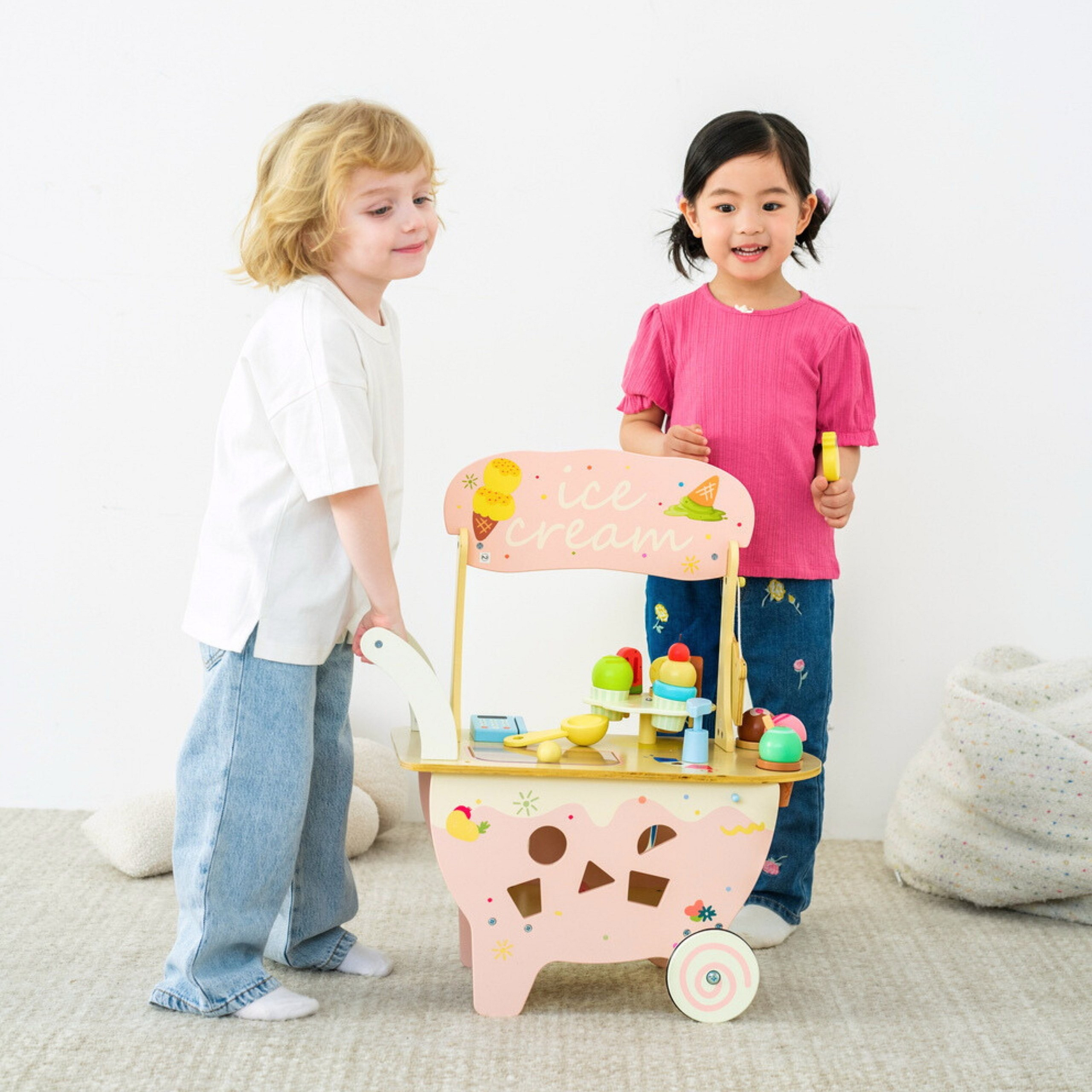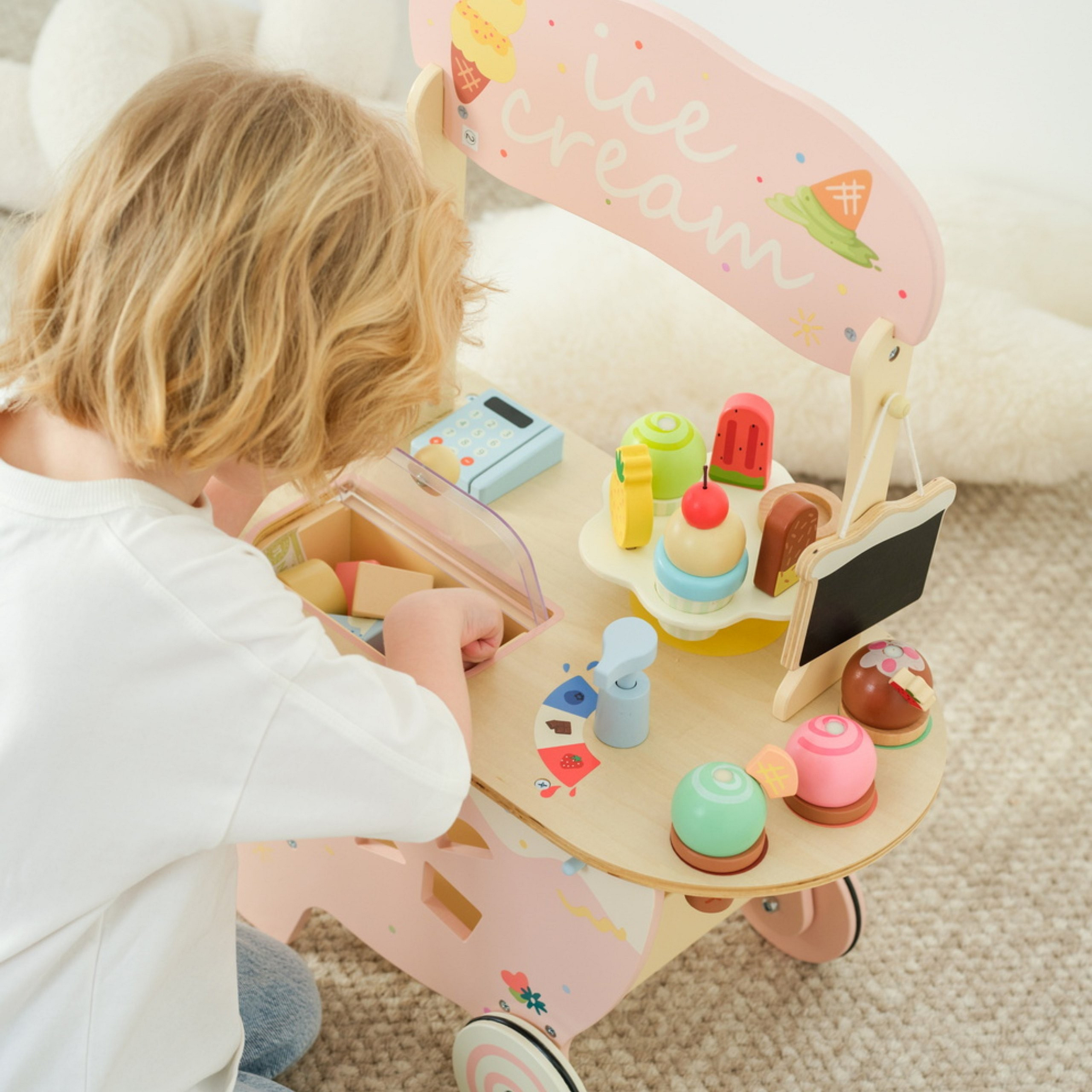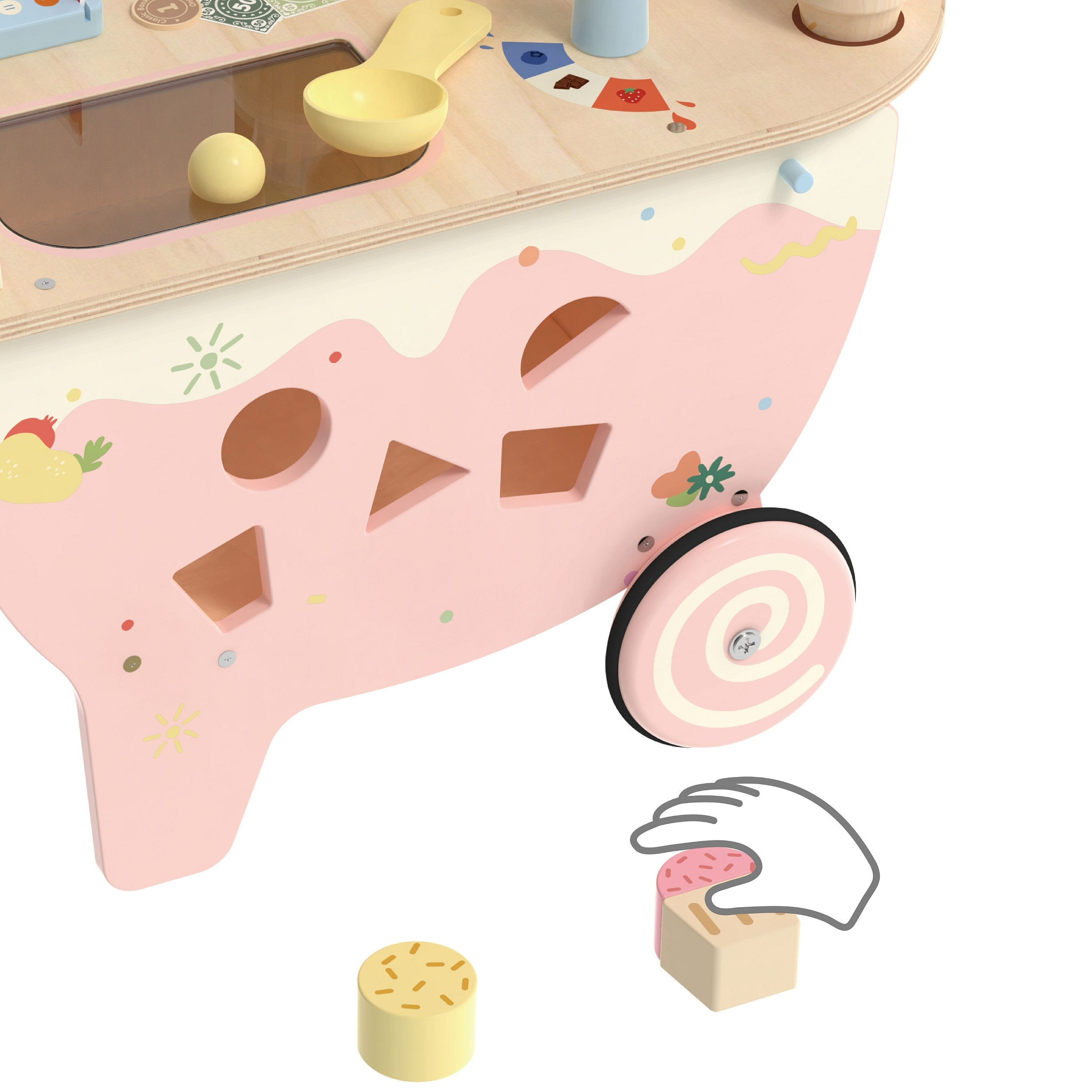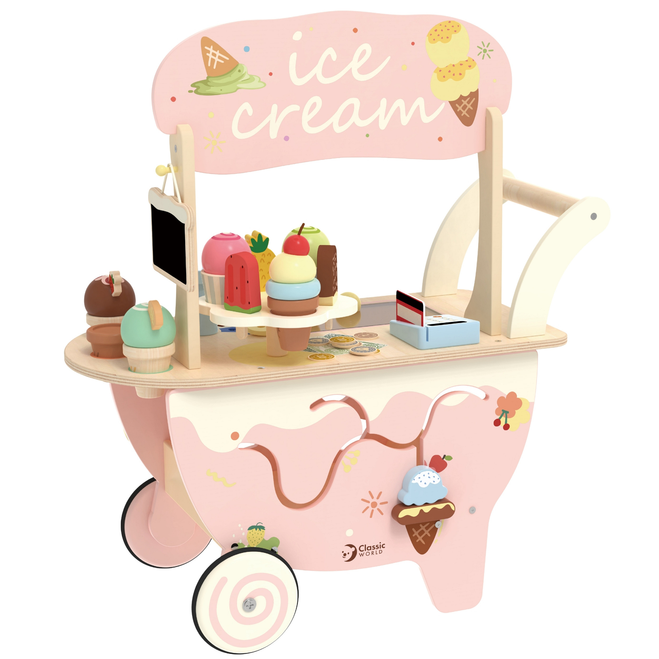 Přeměňte dětský pokoj na sladkou zmrzlinárnu! Dřevěný stánek na kolečkách od Classic World je výjimečná hračka 3v1 – plní funkci vzdělávací hračky a zmrzlinárny. Díky bohaté sadě doplňků může malý dítě podávat zmrzlinu různých chutí, rozvíjet kreativitu a sociální dovednosti. Ideální pro děti, které se učí chodit a milují hry na hraní rolí.