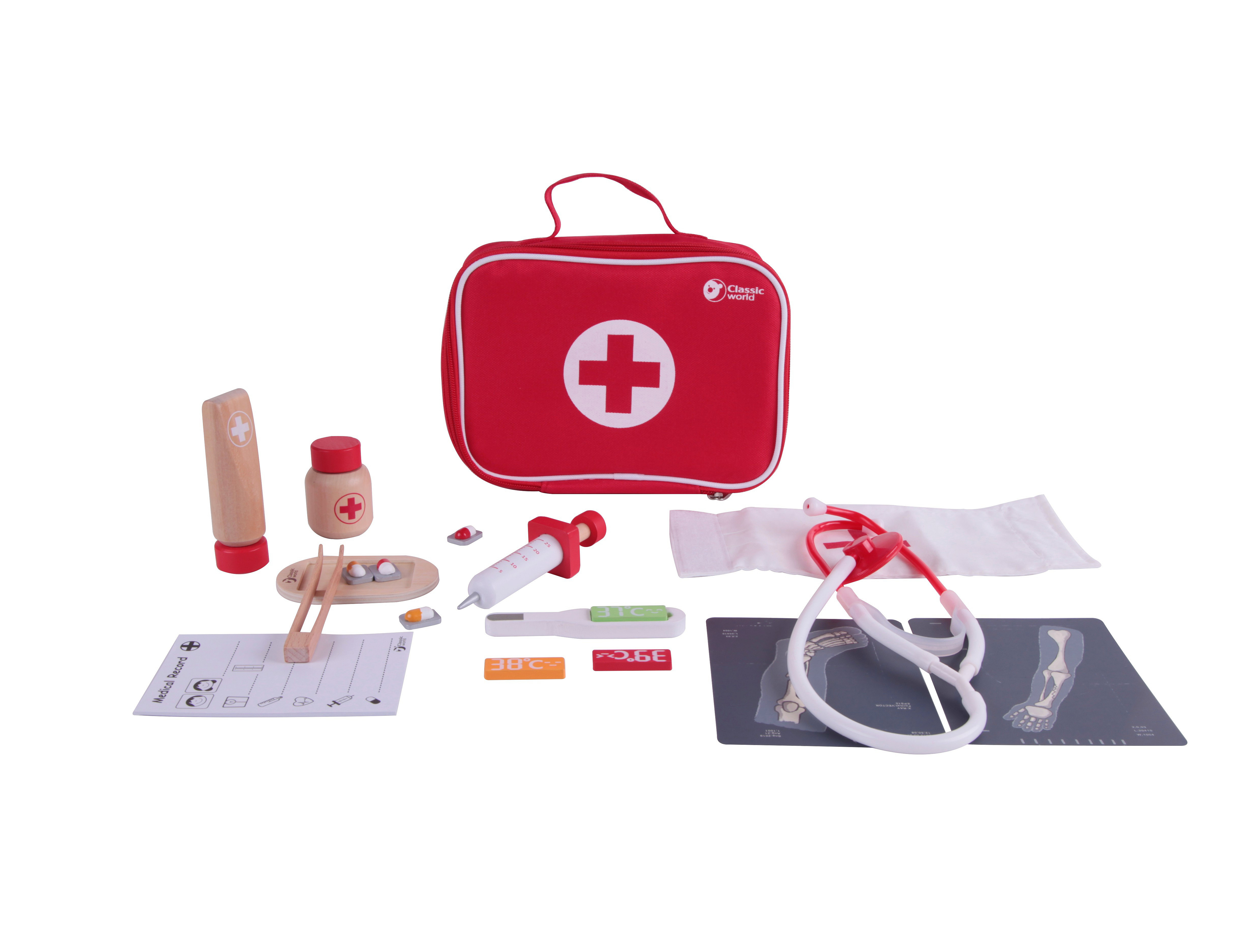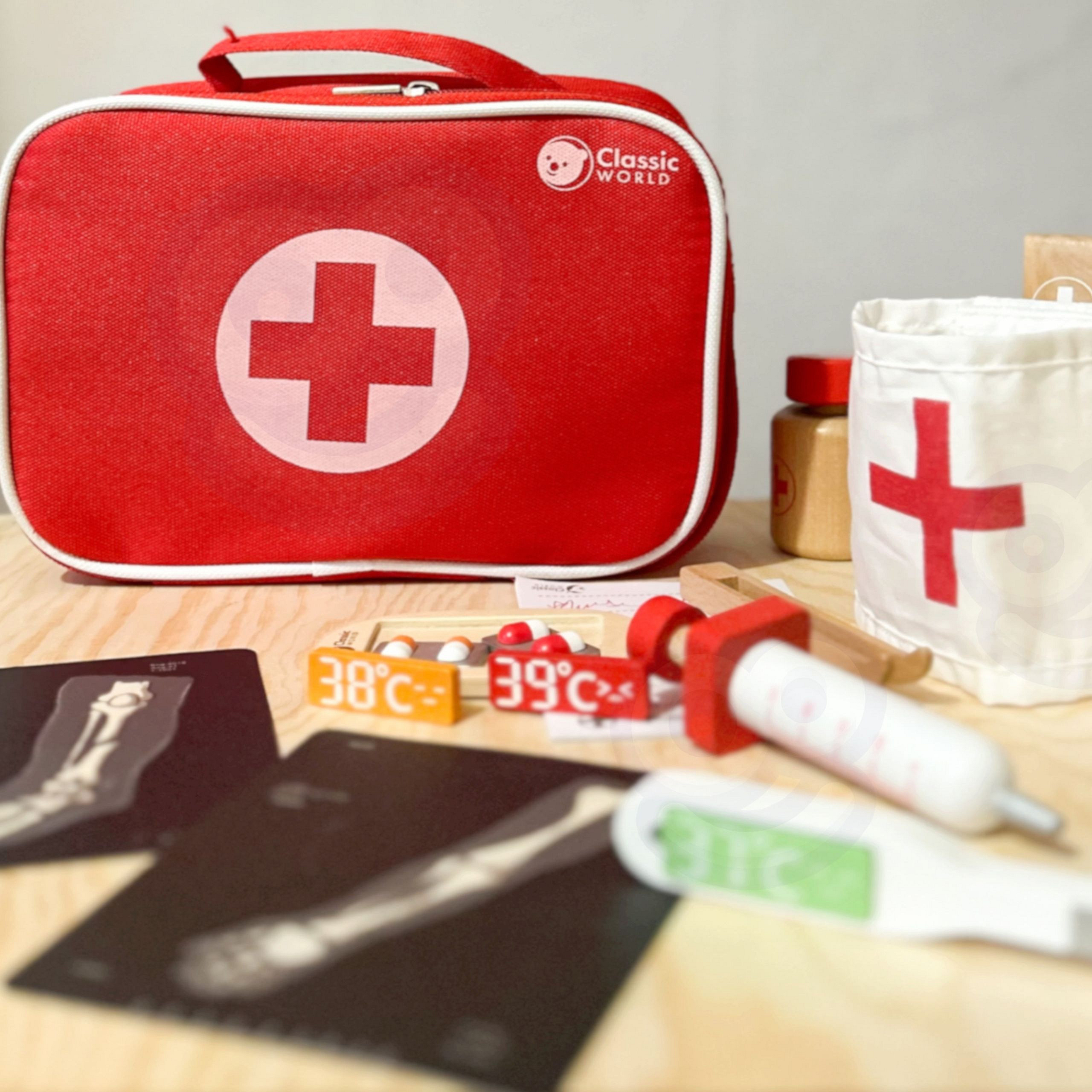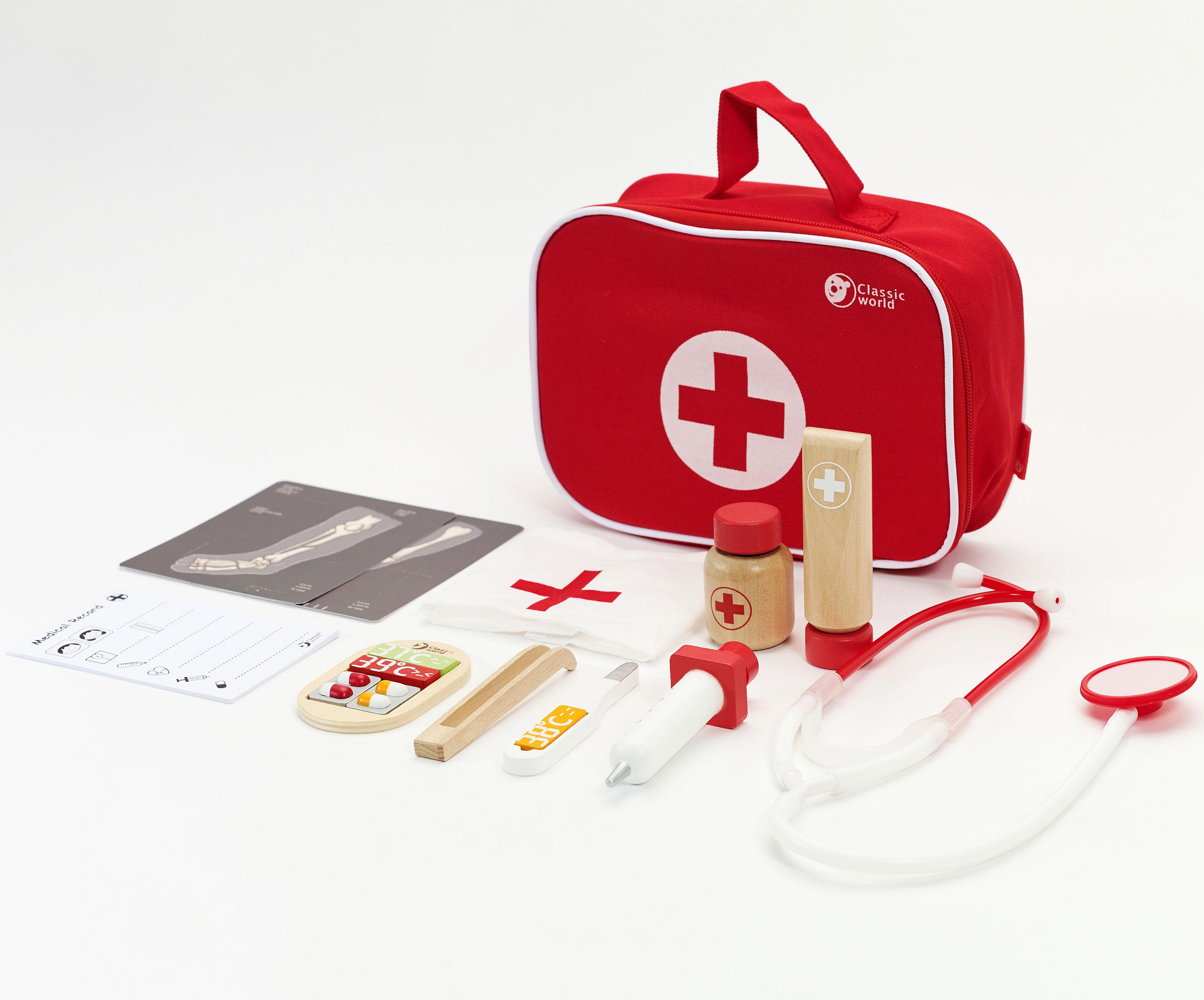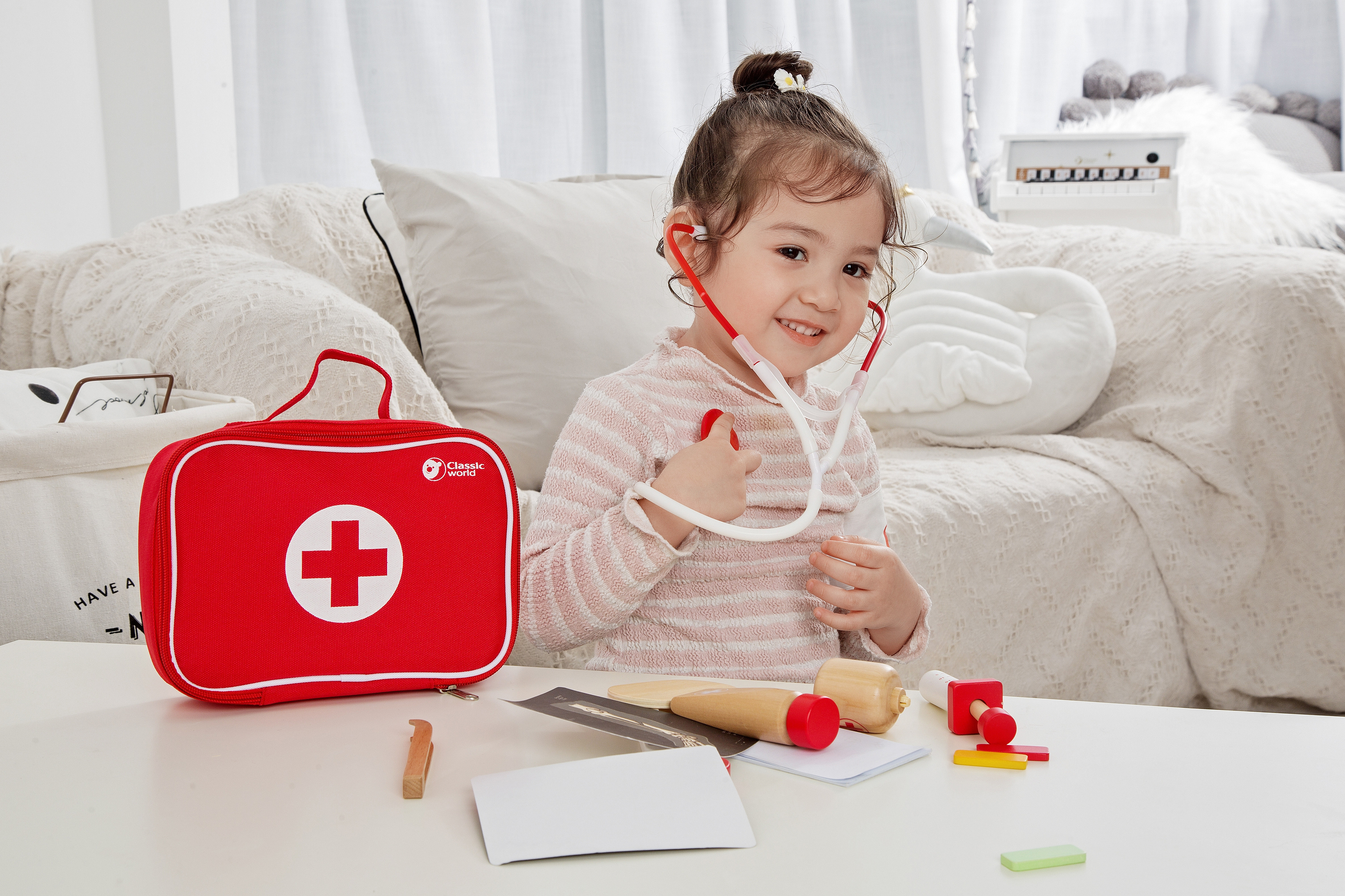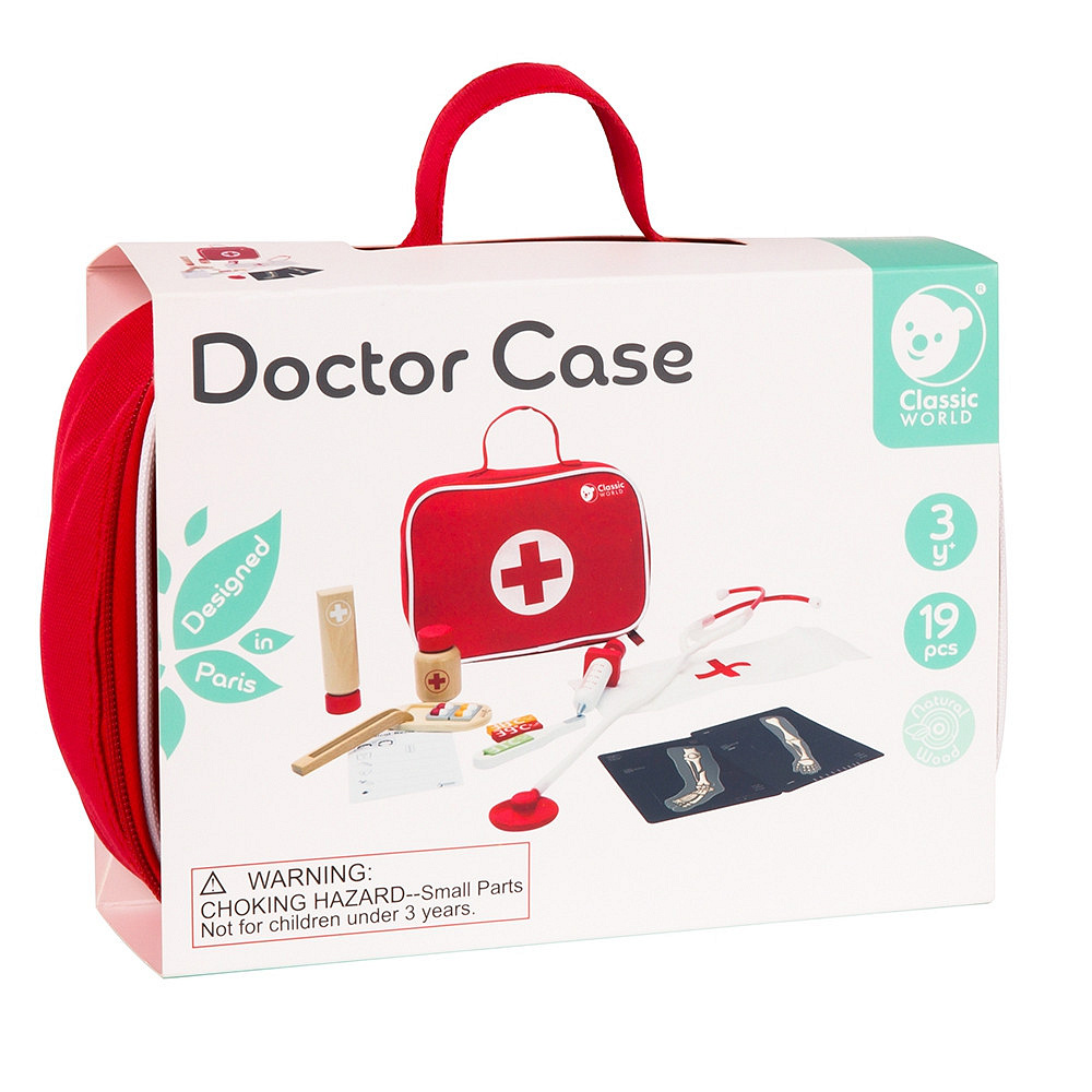 Zestaw Classic World zawiera wszystko, czego potrzebuje Twój mały Lekarz do zabawy w doktora. Przyszli lekarze i pielęgniarki mogą słuchać bicia serca pacjentów (misiów, lalek) za pomocą stetoskopu, "mierzyć" im temperaturę termometrem, "robić" zastrzyki czy podawać niezbędne lekarstwa. Zabawa w Doktora to nie tylko jedna z zabaw na odgrywanie ról, to również nauka empatii i współodczuwania, co bardzo ważne w relacjach społecznych. Wspiera rozwój wyobraźni i uczy rozwiązywania problemów.