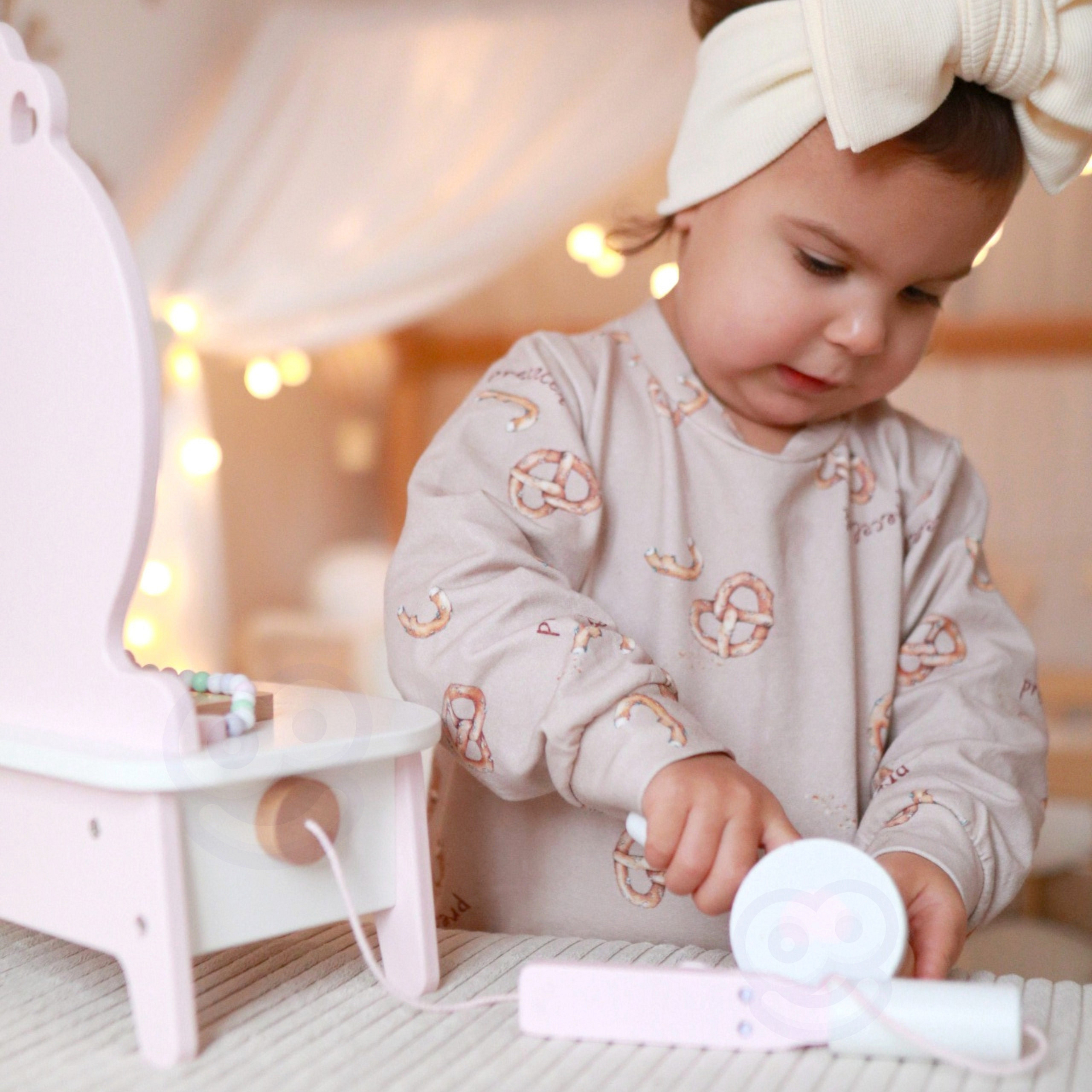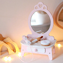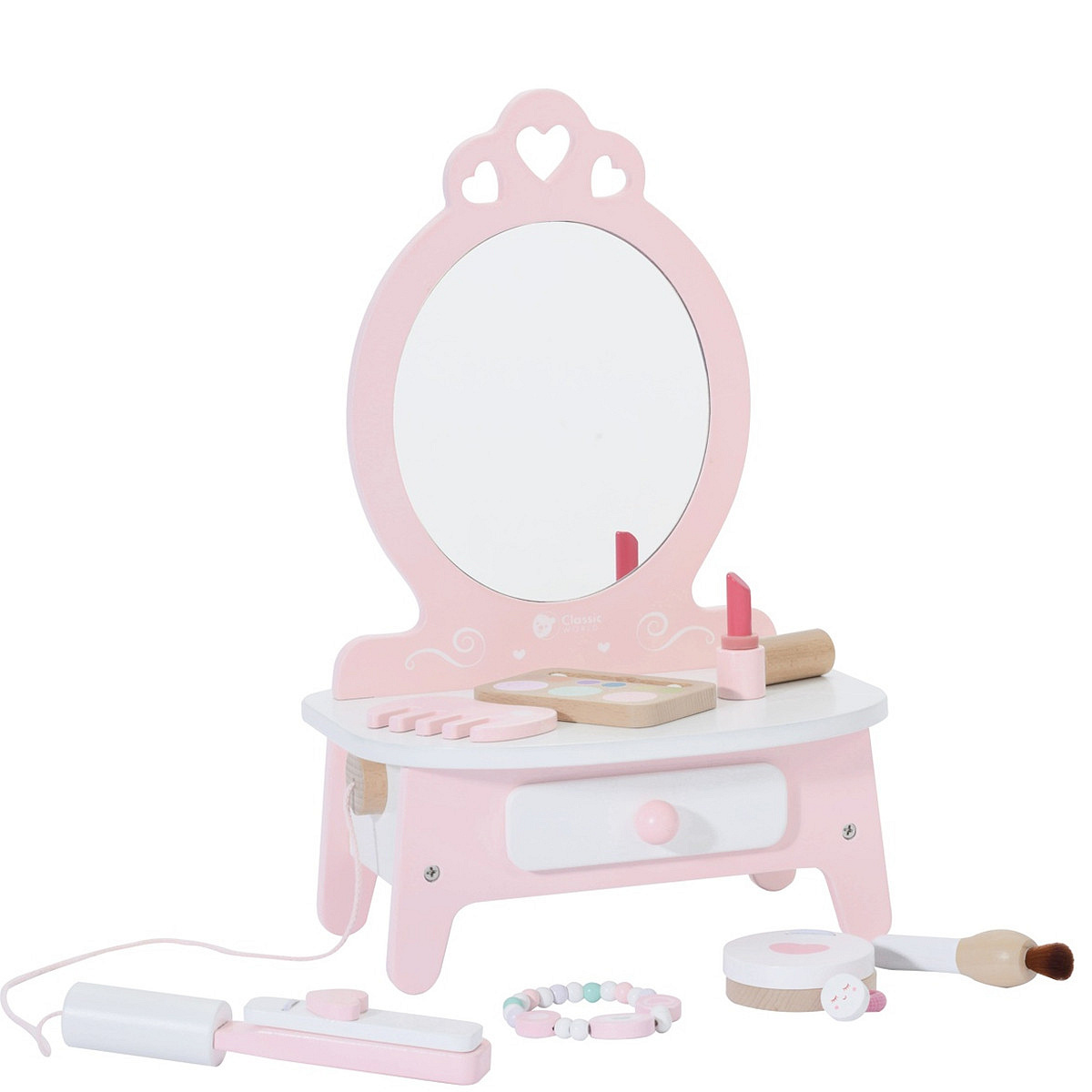 Śliczna funkcjonalna toaletka od Classic World to idealna propozycja na prezent dla dzieci od 3 lat. Rozbudowany zestaw do robienia makijażu oraz fryzur zadowoli każdą posiadaczkę. Zestaw posiada lustro w którym nasza pociecha może się stroić. Bardzo duży zestaw akcesoriów typu grzebień, szminka, prostownica , pędzel do makijażu czy puderniczka, pozwolą na zabawę oraz umożliwią szykowanie się razem z rodzicami. Blat toaletki jest bardzo funkcjonalny i pomieści wszystkie niezbędne akcesoria naszej modelki. Zabawka może służyć jako uzupełnienie Salonu Urody małych dziewczynek w pokojach.