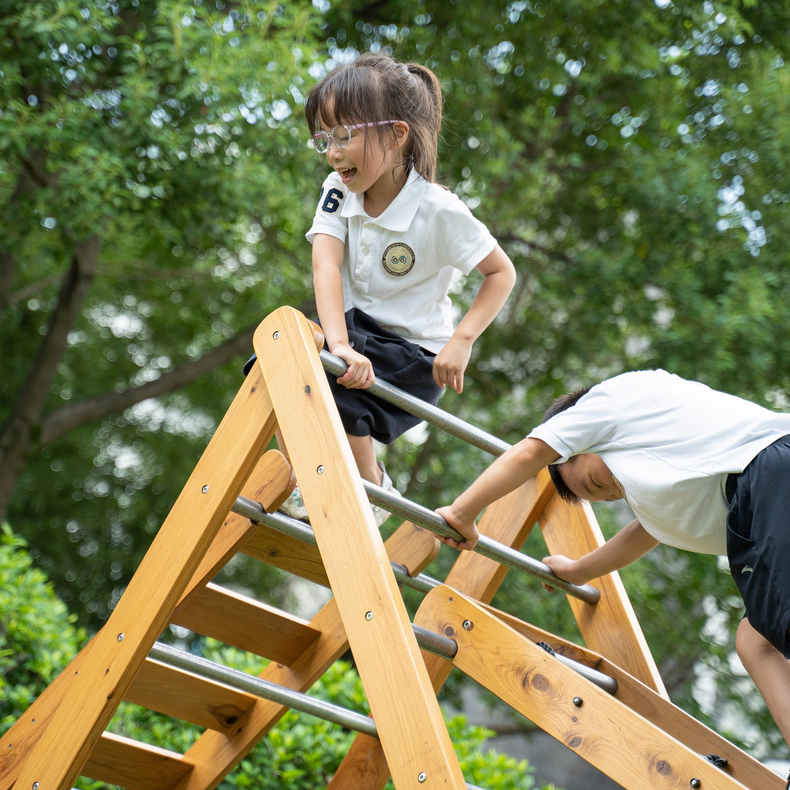 - - Pełna swoboda konfiguracji: Dzięki regulowanej wysokości i możliwości dowolnego ułożenia dwóch bocznych drabinek, możesz dostosować zestaw do wieku i umiejętności dziecka, zaczepiając je na różnych poziomach.