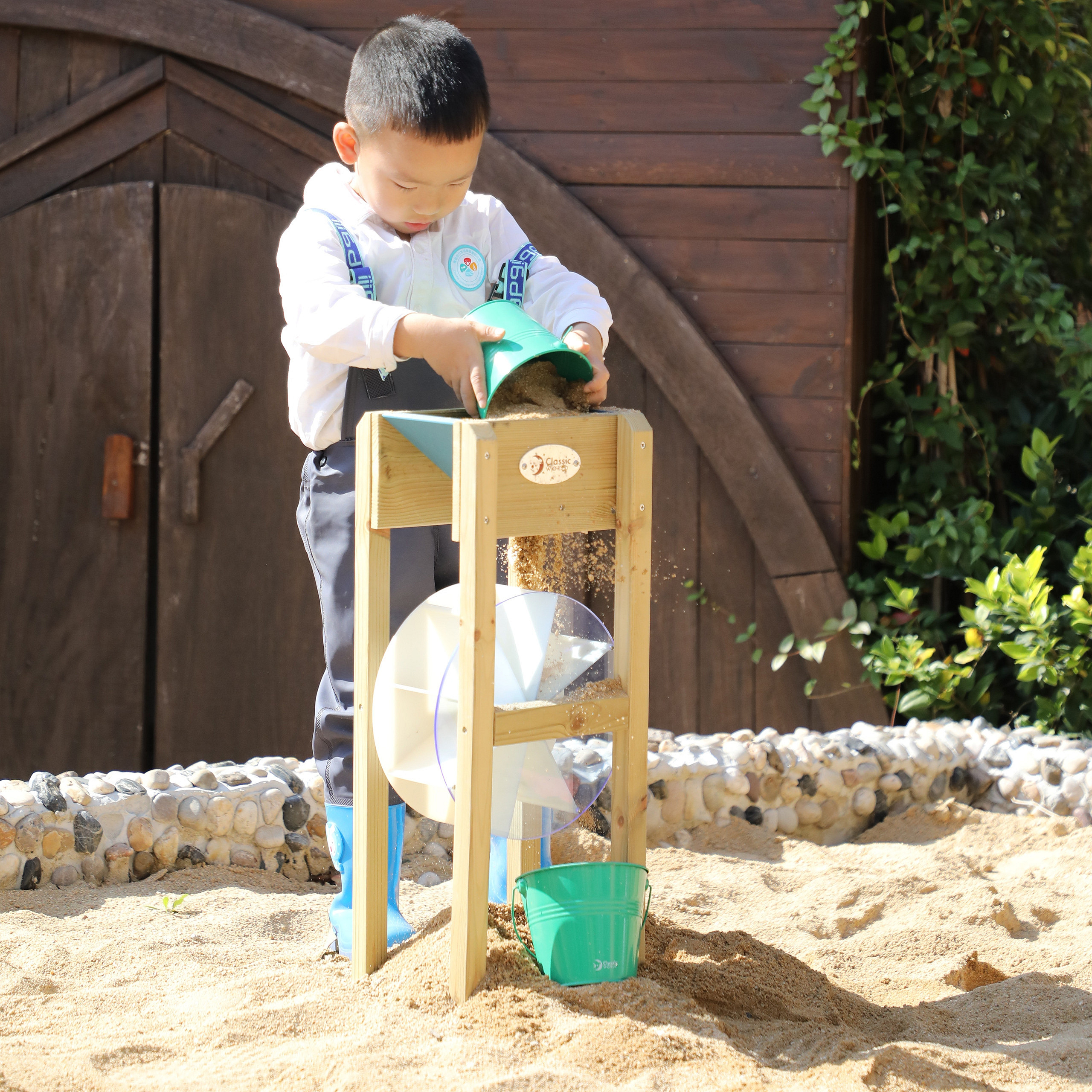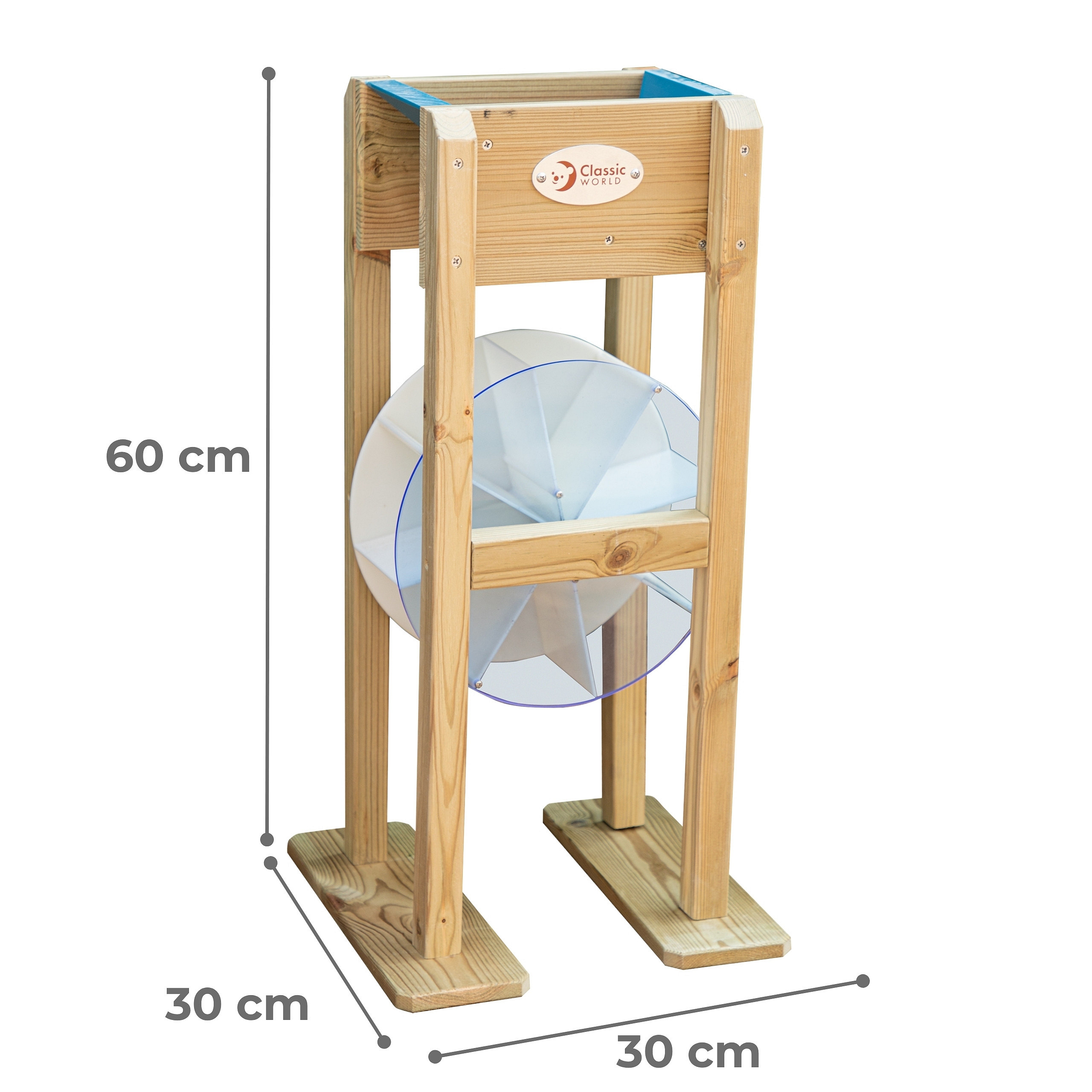 Młyn dla dzieci na piasek od renomowanej marki Classic World to idealne dopełnienie twojej piaskownicy! Produkt jest wyprodukowany z wysokiej jakości drewna, pomalowany nie toksycznym impregnatem, w pełni bezpiecznym dla dzieci. Po prostu napełnij lejek piaskiem i obserwuj jak sypie się przez dziurkę, co będzie powodować obracanie się młynku. Zabawa będzie pełnić funkcję nauki napędzania i wprowadzenia koła w ruch.