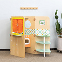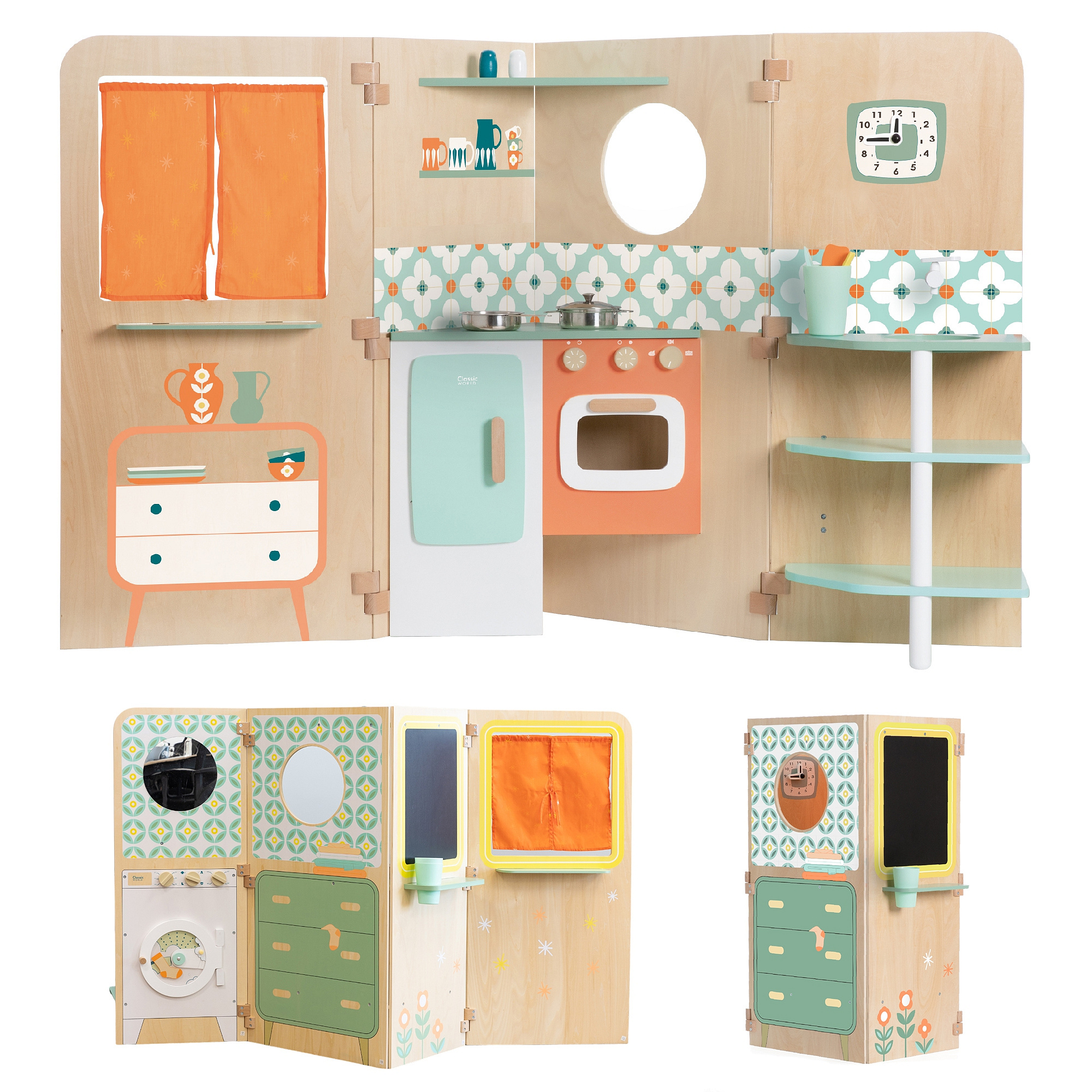 Wielofunkcyjny składany domek od marki CLASSIC WORLD daje nieograniczone możliwości zabawy. Odsłania różne przestrzenie do zabawy, takie jak kuchnia, a także pralnia z pralką, tablica magnetyczna i okno. Może być również wykorzystywany jako teatr kukiełkowy. Dzieci mogą bawić się „na zewnątrz” i „wewnątrz”, patrząc przez okno. Składany domek jest bardzo kompaktowy a dzięki dobremu systemowi otwierania i składania, nie zajmuje dużo miejsca.
