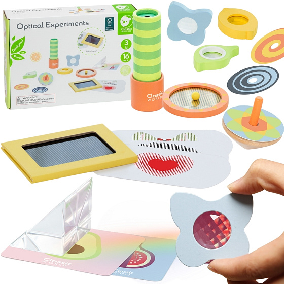 Zestaw Do Nauki Optyki od marki Classic World to fascynująca podróż w świat światła, kolorów i iluzji dla każdego małego naukowca. Ta edukacyjna zabawka pozwala dziecku odkrywać zasady fizyki poprzez bezpieczną i kreatywną zabawę. Zestaw składa się z różnorodnych elementów, takich jak soczewki, lusterka i bączki, które zmieniają sposób postrzegania otoczenia. Dzięki niemu maluch dowie się, jak działają pryzmaty, jak mieszają się barwy i czym jest zjawisko odbicia. Całość wykonana jest z wysokiej jakości drewna i bezpiecznych materiałów, co gwarantuje trwałość i bezpieczeństwo użytkowania. To idealny sposób na połączenie nauki z radością odkrywania, rozbudzając w dziecku ciekawość świata.
