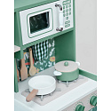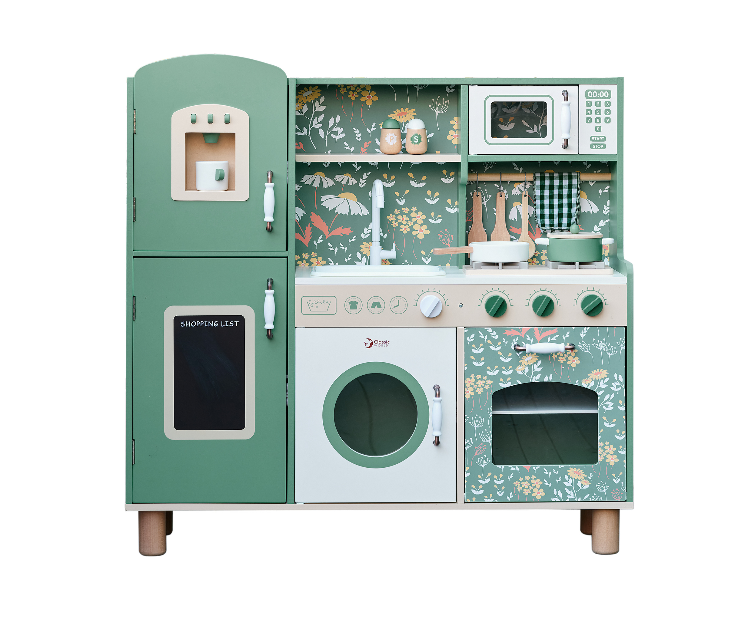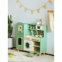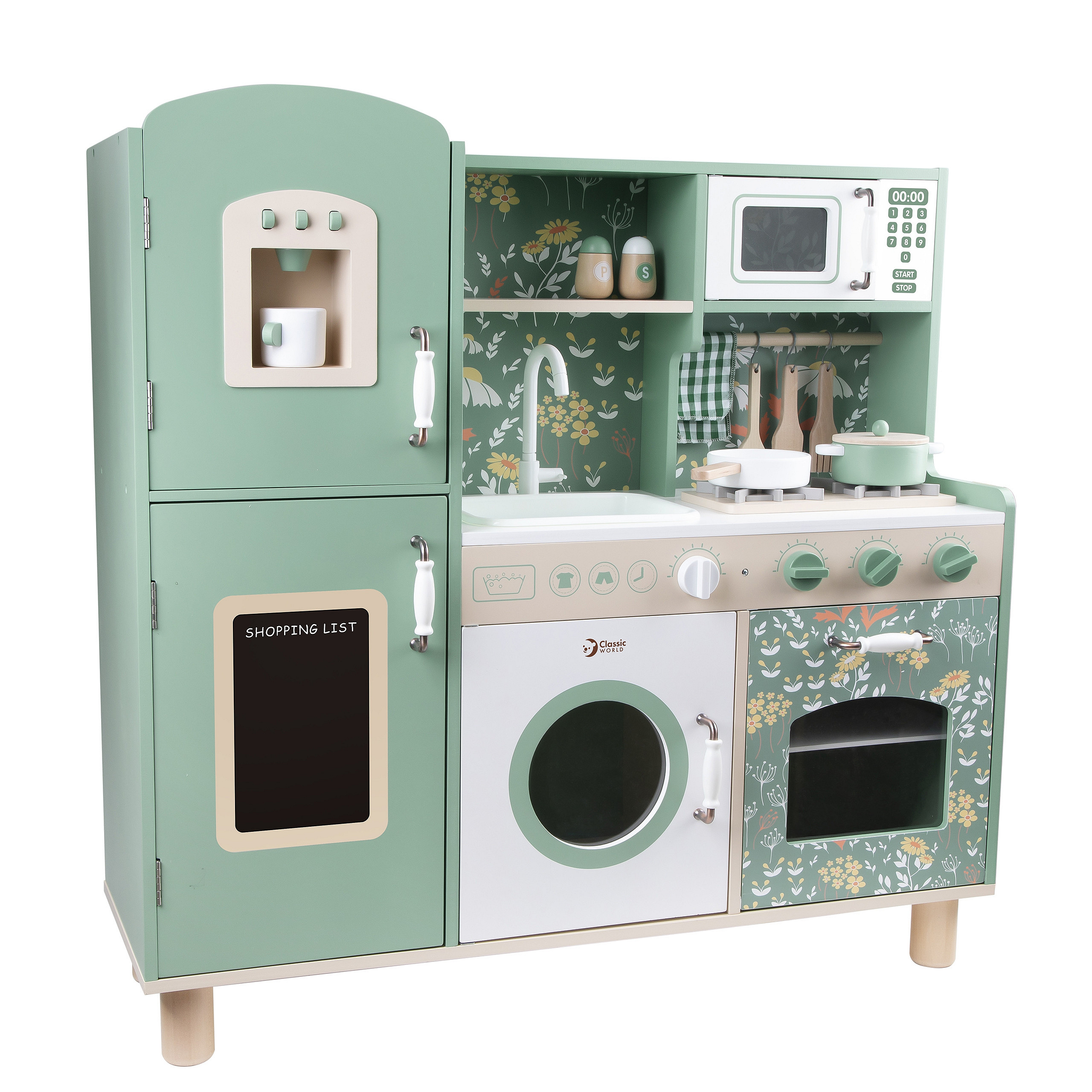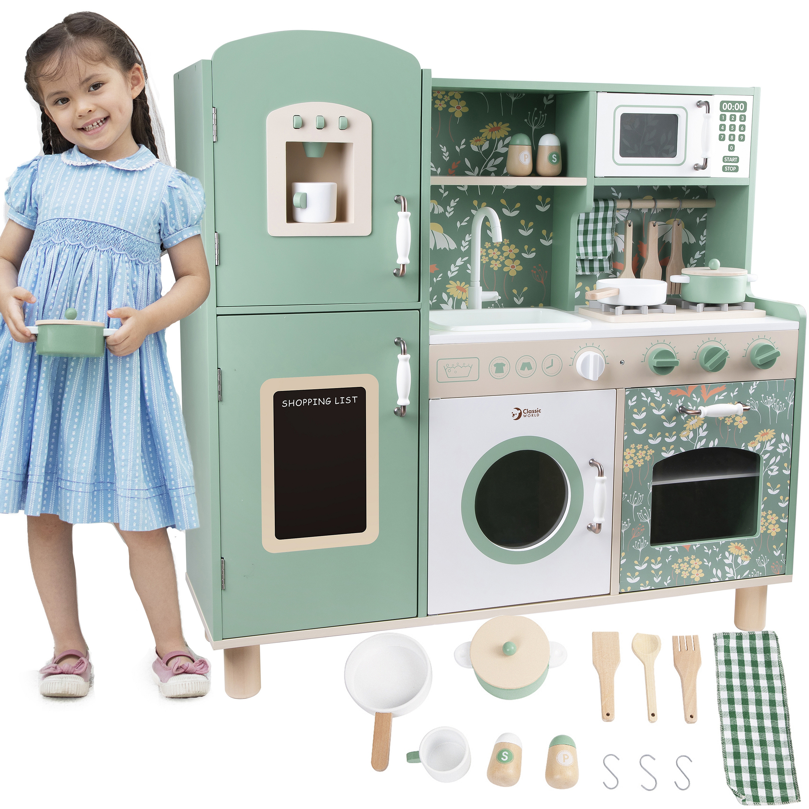 Przepiękna Kuchnia od marki CLASSIC WORLD to świetna propozycja dla dzieci które lubią wcielać w różne role osób dorosłych podpatrzonych w życiu codziennym.Ta drewniana kuchnia do zabawy jest w przeważającej części zielona z pięknymi kwiatowymi wzorami, dzięki czemu dzieci mogą cieszyć się klasycznym stylem retro. Zestaw zawiera wiele obszarów funkcjonalnych, takich jak zlew, kuchenka, szafki i zmywarka oraz wiele innych. Po lewej stronie znajduje się tablica, po której dzieci mogą pisać. Na kuchence natomiast można symulować gotowanie, zyskując niesamowite wrażenia kulinarne.
