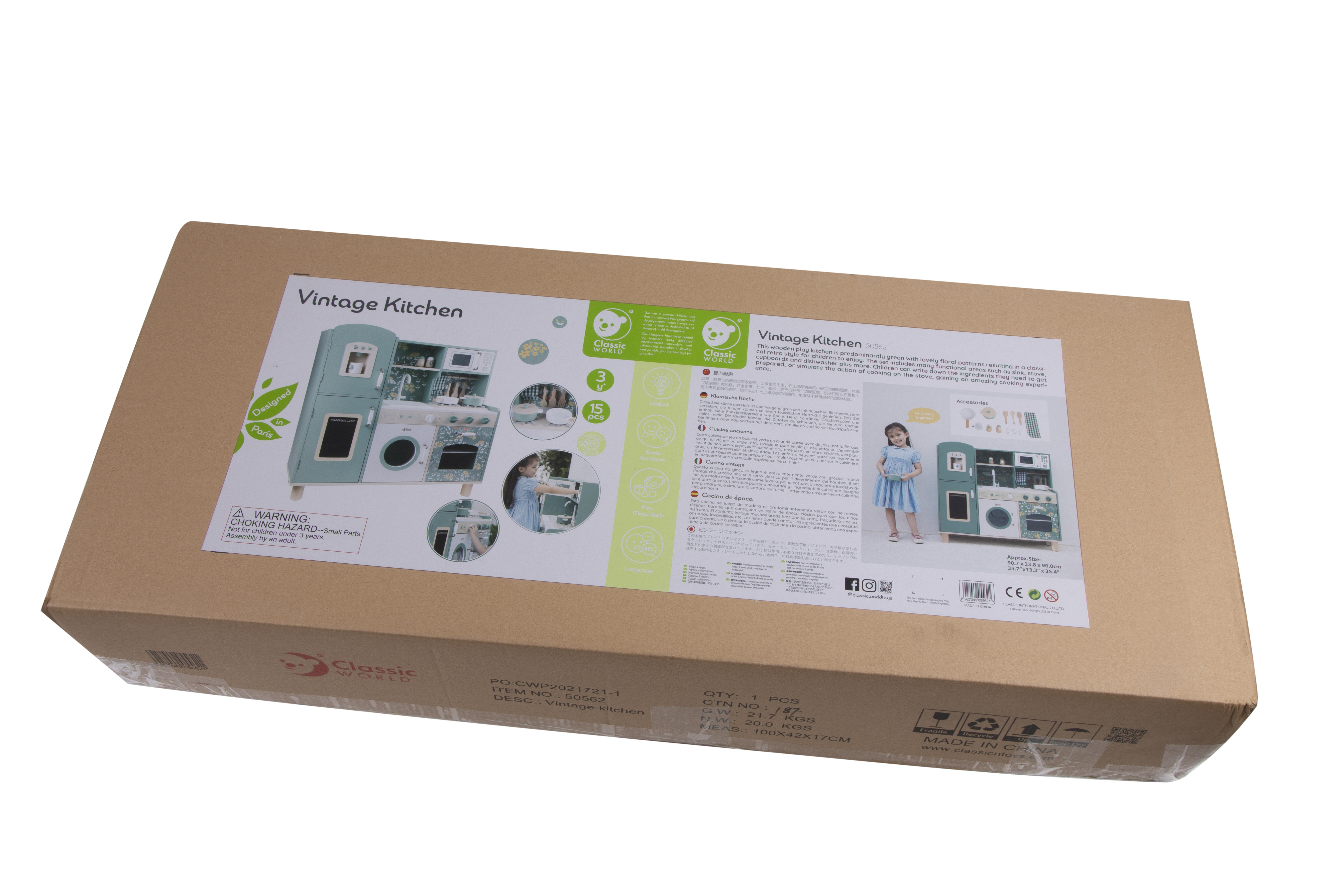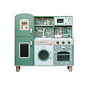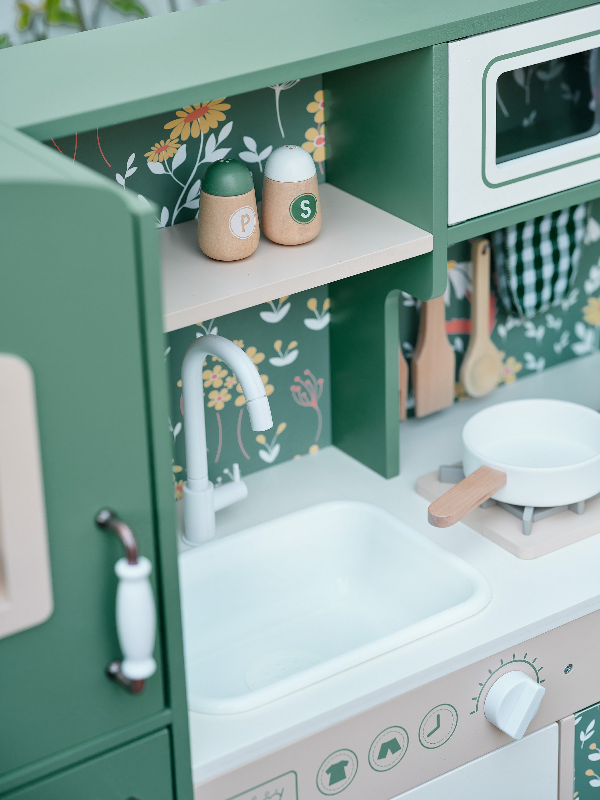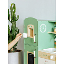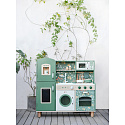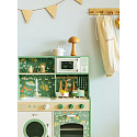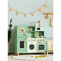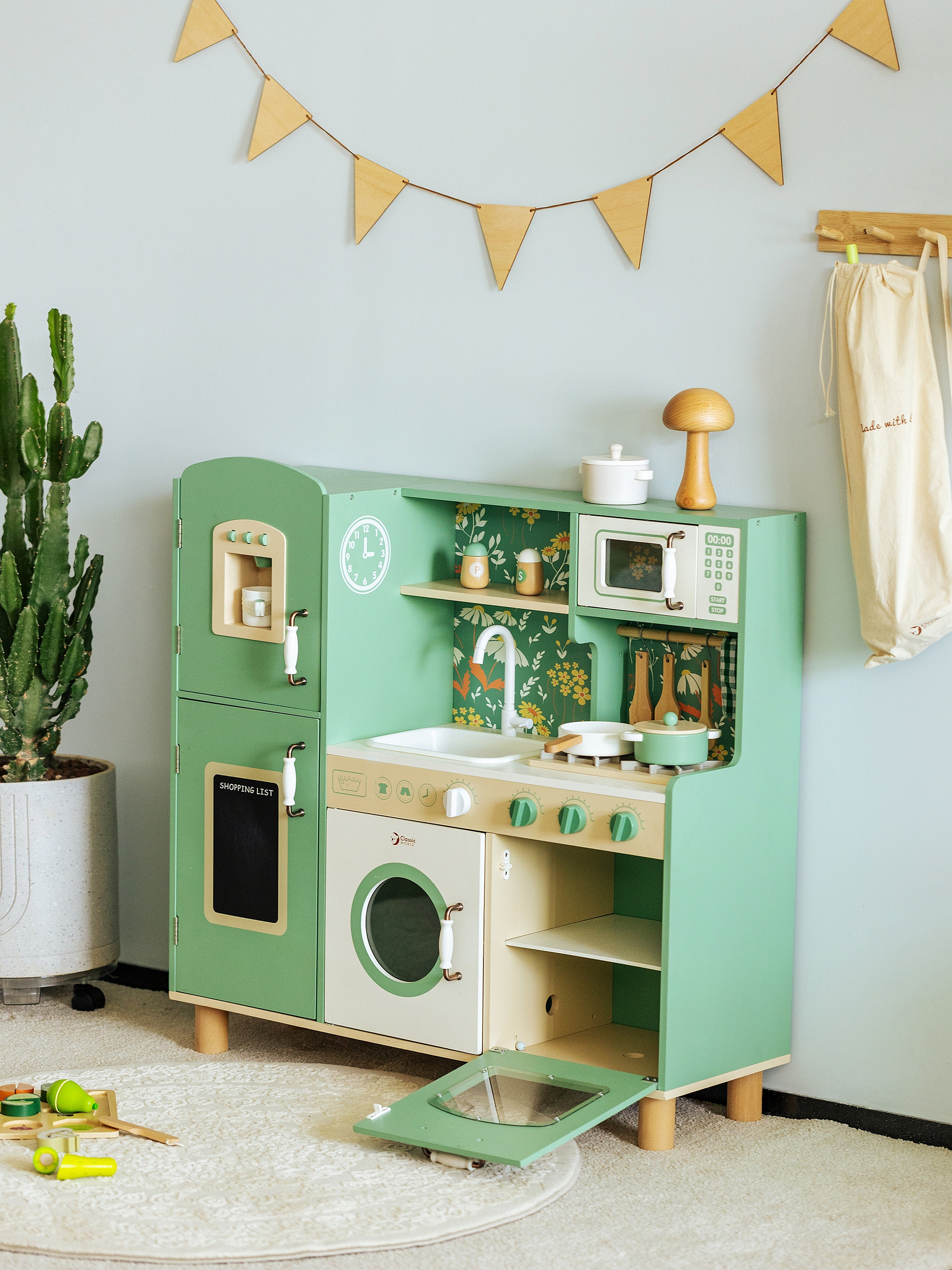 Przepiękna Kuchnia od marki CLASSIC WORLD to świetna propozycja dla dzieci które lubią wcielać w różne role osób dorosłych podpatrzonych w życiu codziennym.Ta drewniana kuchnia do zabawy jest w przeważającej części zielona z pięknymi kwiatowymi wzorami, dzięki czemu dzieci mogą cieszyć się klasycznym stylem retro. Zestaw zawiera wiele obszarów funkcjonalnych, takich jak zlew, kuchenka, szafki i zmywarka oraz wiele innych. Po lewej stronie znajduje się tablica, po której dzieci mogą pisać. Na kuchence natomiast można symulować gotowanie, zyskując niesamowite wrażenia kulinarne.