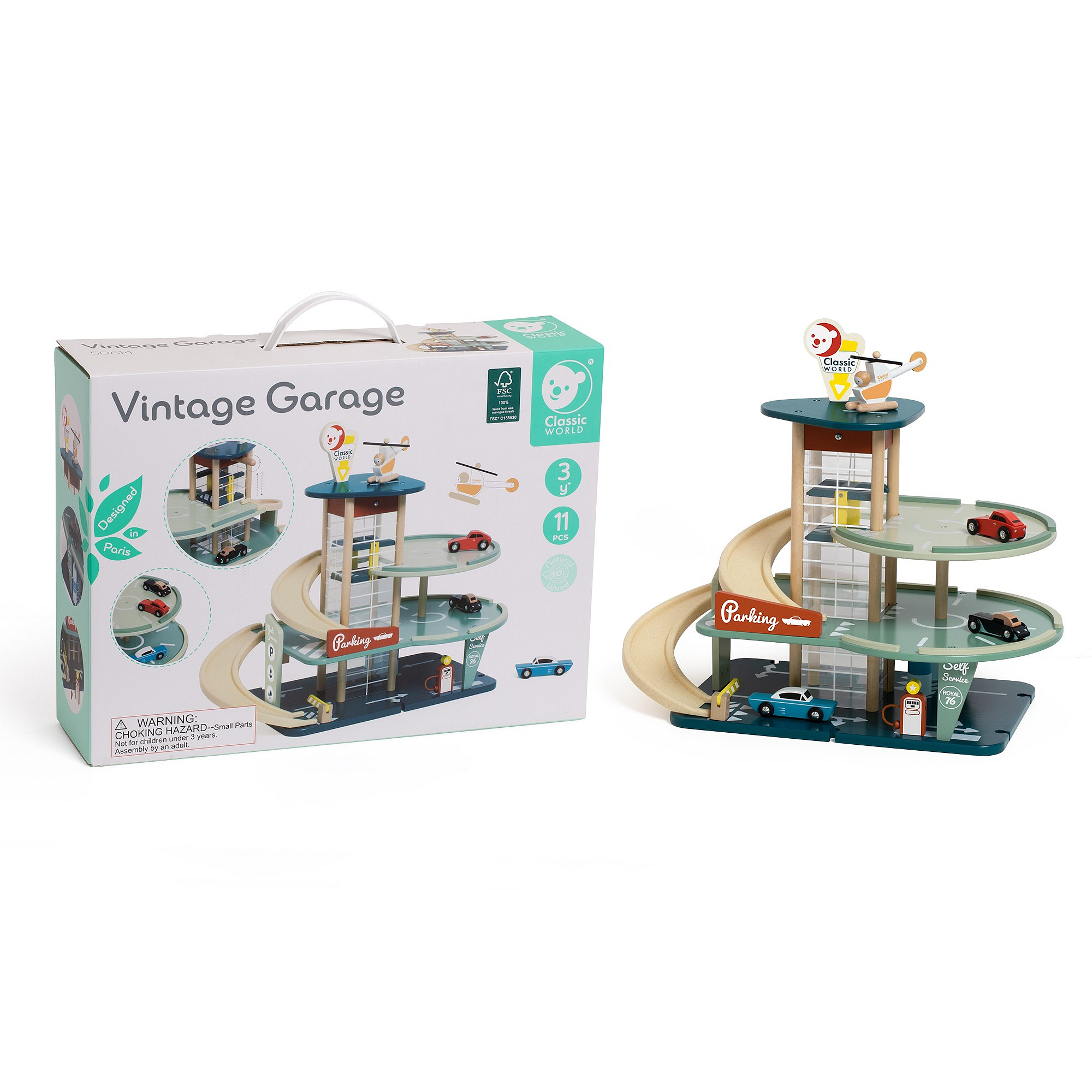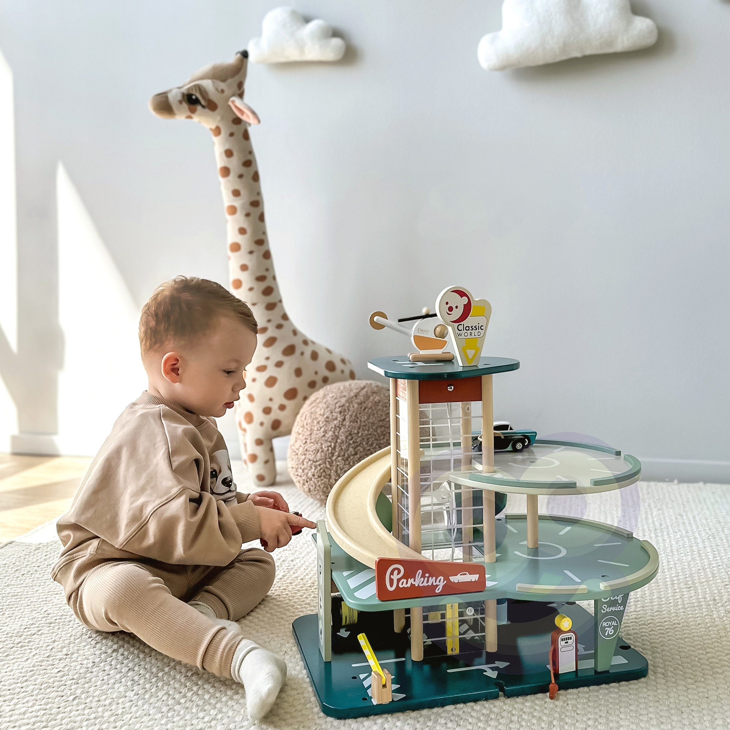 Drewniany Garaż Vintage od marki CLASSIC WORLD to wyjątkowa zabawka, która przeniesie Twoje dziecko w złote czasy motoryzacji lat 50. Ten stylowy, trzypoziomowy parking został wykonany z najwyższej jakości drewna FSC oraz innowacyjnych elementów z bioplastiku, co czyni go bezpiecznym i ekologicznym wyborem. Zestaw oferuje mnóstwo atrakcji, w tym funkcjonalną windę, myjnię, dystrybutor paliwa oraz lądowisko dla helikoptera, zapewniając godziny kreatywnej zabawy. Dzięki możliwości łączenia bazy z innymi torami, Garaż Vintage staje się centrum rozbudowanego świata małego fana motoryzacji.