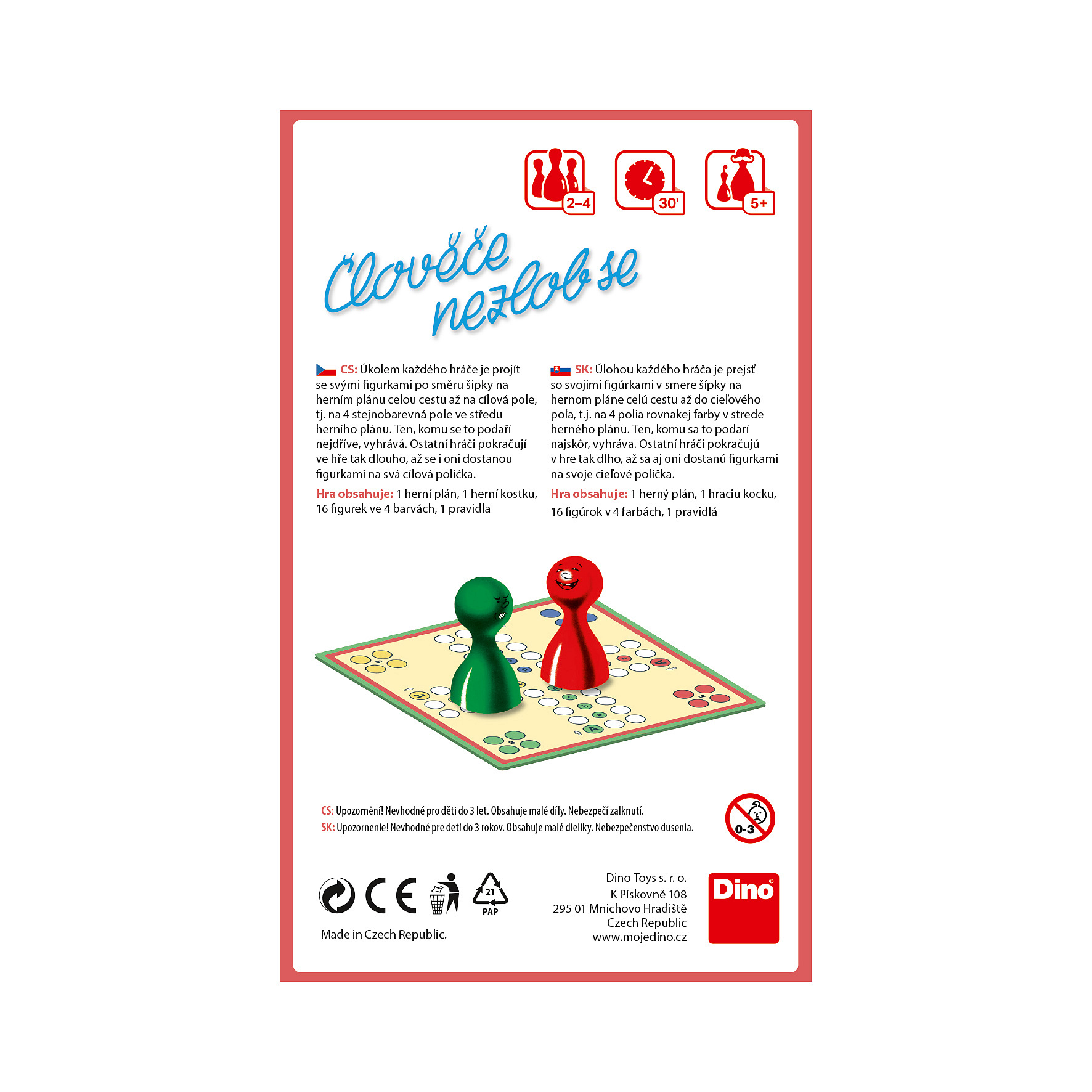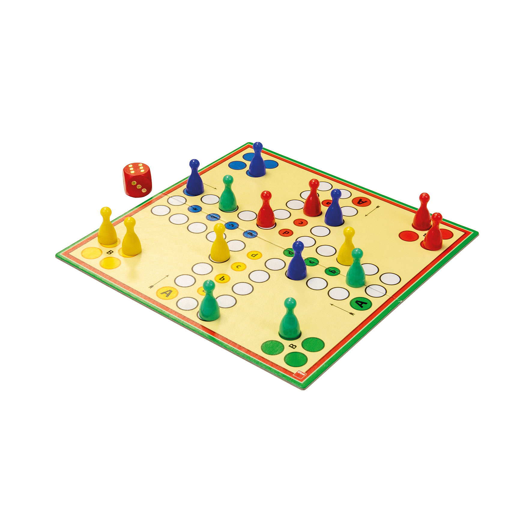 Jednoduchá závodivá hra s kostkou určená pro všechny věkové kategorie. Hráči se snaží co nejrychleji dojít se svými figurkami na cílová pole do domečku a nenechat se přitom "vyhodit" ze hry soupeřem. Obsah: 1 herní plán, 16 figurek ve 4 barvách, 1 hrací kostka, pravidla Rozměr balení: 12 x 18 x 4 cm Vhodné pro děti od 5 let.